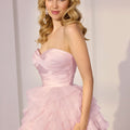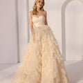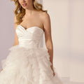 Undeniably romantic, this ball gown party dress is designed to leave an impression. A draped satin bodice has an elegant sheen with a strapless sweetheart neckline that creates soft curves. Cascading tiers of organza and tulle create dramatic movement in the ruffled skirt for the perfect balance of elegance and statement energy.