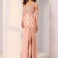 Classic lace is reimagined in this sheath party dress. The Chantilly lace gown features an extended v-neckline that draws the eye down the silhouette to the dramatic thigh-high slit. Long gauntlet sleeves and a detachable organza bow belt are playful additions that let you style the look the way you want.