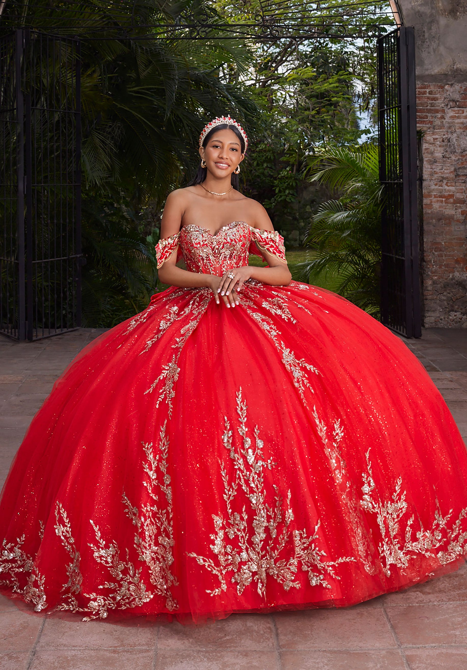 Our Aliea Quinceañera dress radiates modern elegance in glitter tulle with metallic beaded floral appliqués that have a gilded look. The sweetheart neckline and sheer midriff are framed by structured boning for classic corset bodice with a lace-up back and a a show-stopping double-loop appliqué bow. The detachable off-the-shoulder sleeves that let you switch up your style, off-the-shoulder for your grand entrance and strapless to dance the night away.