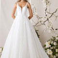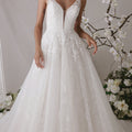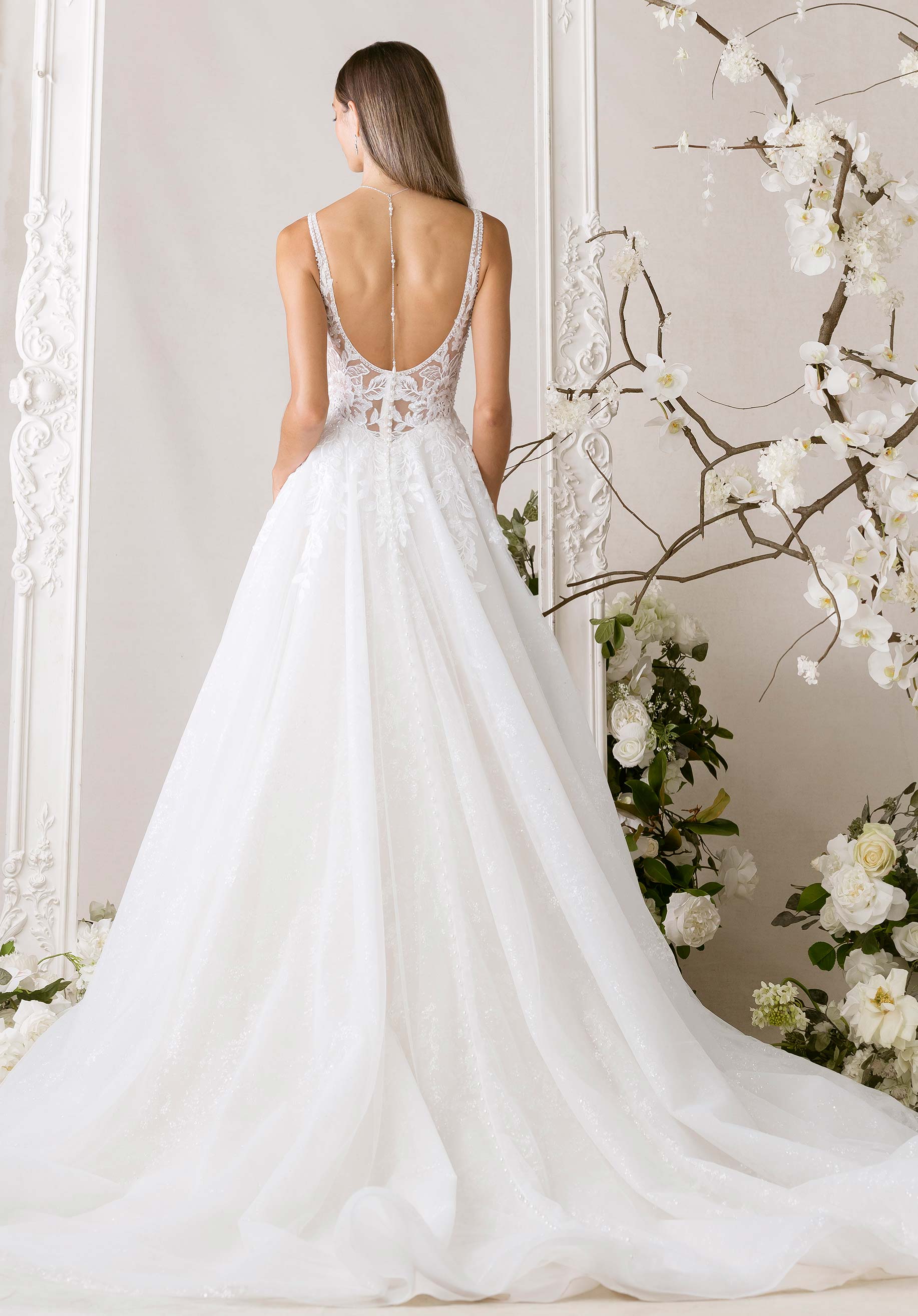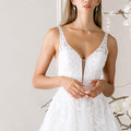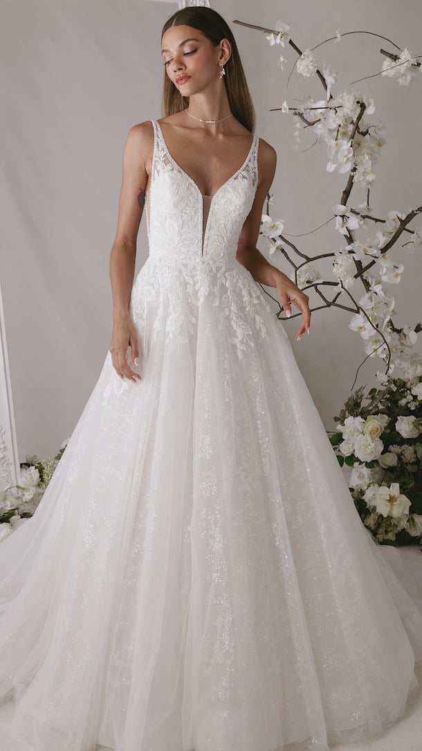 Radiant and romantic, our Myrtha wedding dress is a ball gown that captures a sense of light, effortless beauty. The plunging v-neckline with slender straps frames the bodice, while a sheer, low scoop back reveals just a hint of allure. Intricate embroidered lace appliqués trace the fitted bodice, shimmering subtly against layers of glitter tulle that catch the light with every movement of the A-line skirt. The result is a gown that feels airy and modern yet timelessly feminine, a true vision of grace.