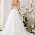 Das Ballkleid für die Hochzeit hat einen tief ausgeschnittenen V-Ausschnitt mit Trägern und einen transparenten, tiefen Rundrücken auf einem bestickten Spitzen-Applikationsoberteil aus glitzerndem Tüll. Ebenfalls erhältlich als Julietta Style 1020014.