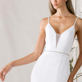 Fit and flare wedding dress has a plunging v-neckline and matching low v-shape back with delicate straps and a beaded waistband in crepe.