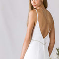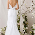Our Ajen wedding dress celebrates clean lines and quiet elegance. A plunging v-neckline meets a low v-back that draws the eye down the fit and flare silhouette, framed by delicate straps. Princess seams help create a statuesque shape, with a beaded waistband adds a gentle glimmer, drawing attention to the cinched waist. Smooth crepe flows softly over the hips and flares with understated ease for a gown that embodies restrained sophistication.