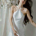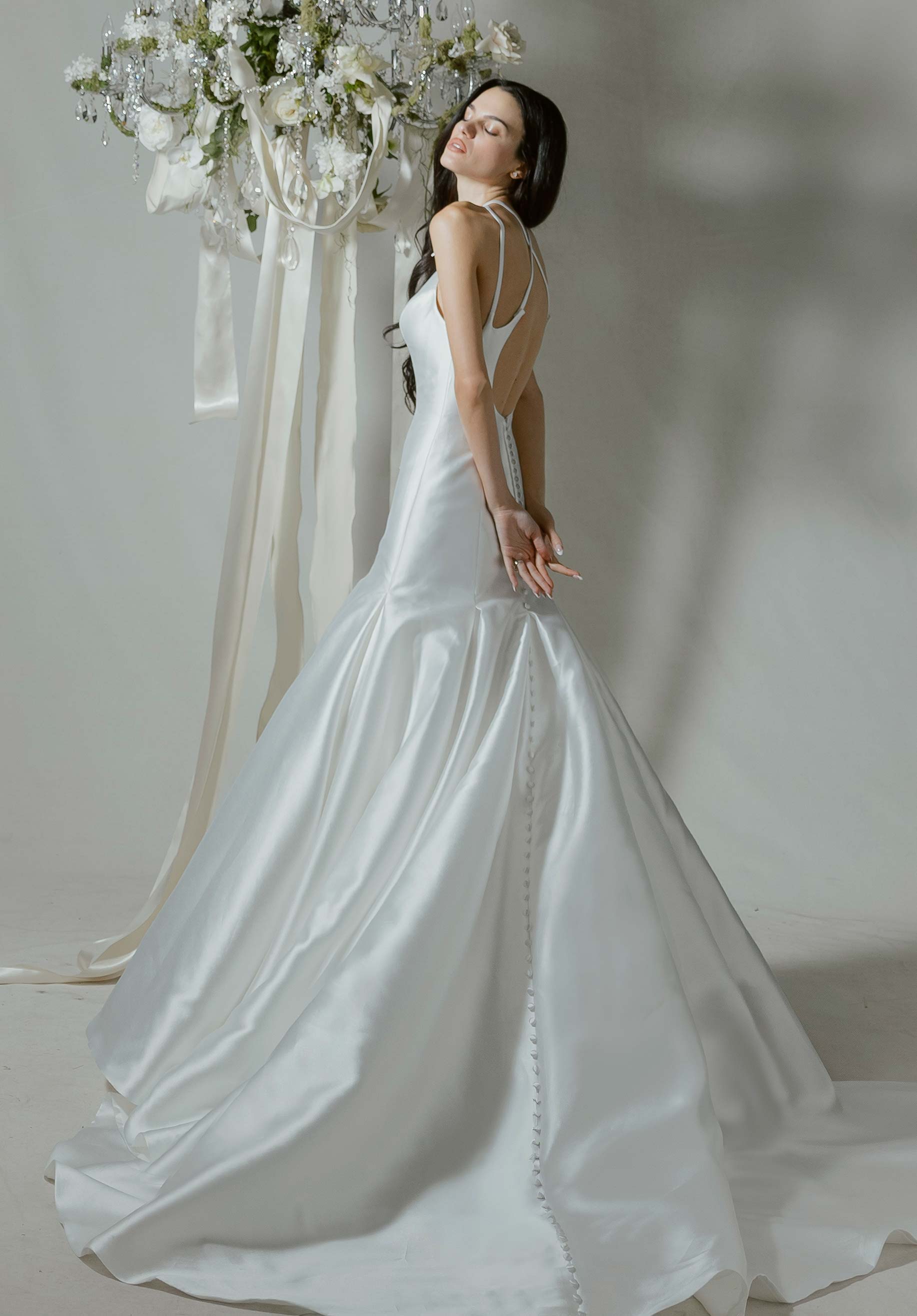 The Lilou wedding dress captures the beauty of refined motion, minimal yet undeniably expressive. The mermaid silhouette elongates the form with sculptural precision, while a halter neckline, detailed with a delicate bow, nods to the effortless grace of a ballerina. An open, strappy back adds a whisper of sensuality, leading to a softly structured box-pleated skirt that flows into a trailing line of buttons. Poised between strength and softness, the gown moves like a quiet rhythm—elegant, deliberate, and endlessly captivating.