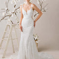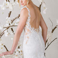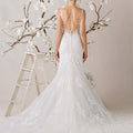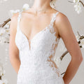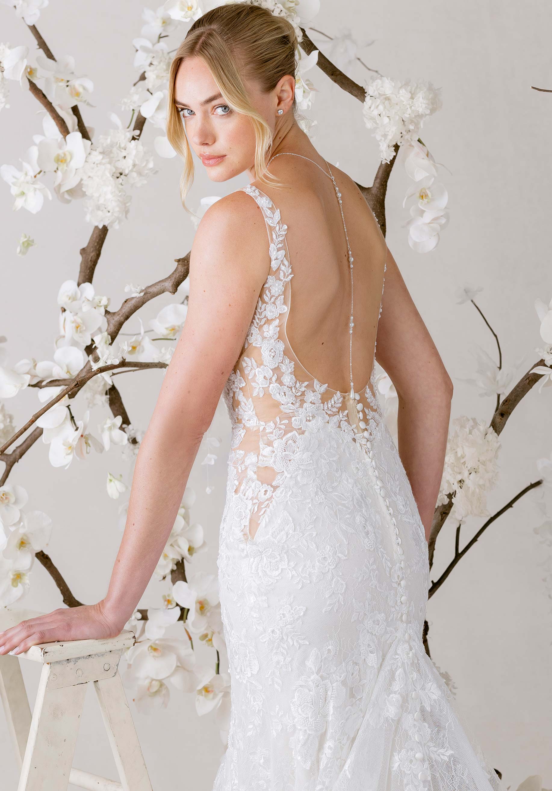 Our Maris wedding dress is a sweet and sophisticated symphony of style. The sweetheart neckline has an exaggerated shape, dipping down into a notched detail, with delicate straps to frame the décolletage. Sheer illusion sides contour the fit and flare silhouette, while a low back creates a sensual scoop on the mermaid silhouette. Beaded Chantilly lace and threadwork lace appliqué embroidered tulle trace the body with intricate texture, catching light with every movement, with buttons down the train, which glides behind you, trailing like the last note of a symphonic movement.