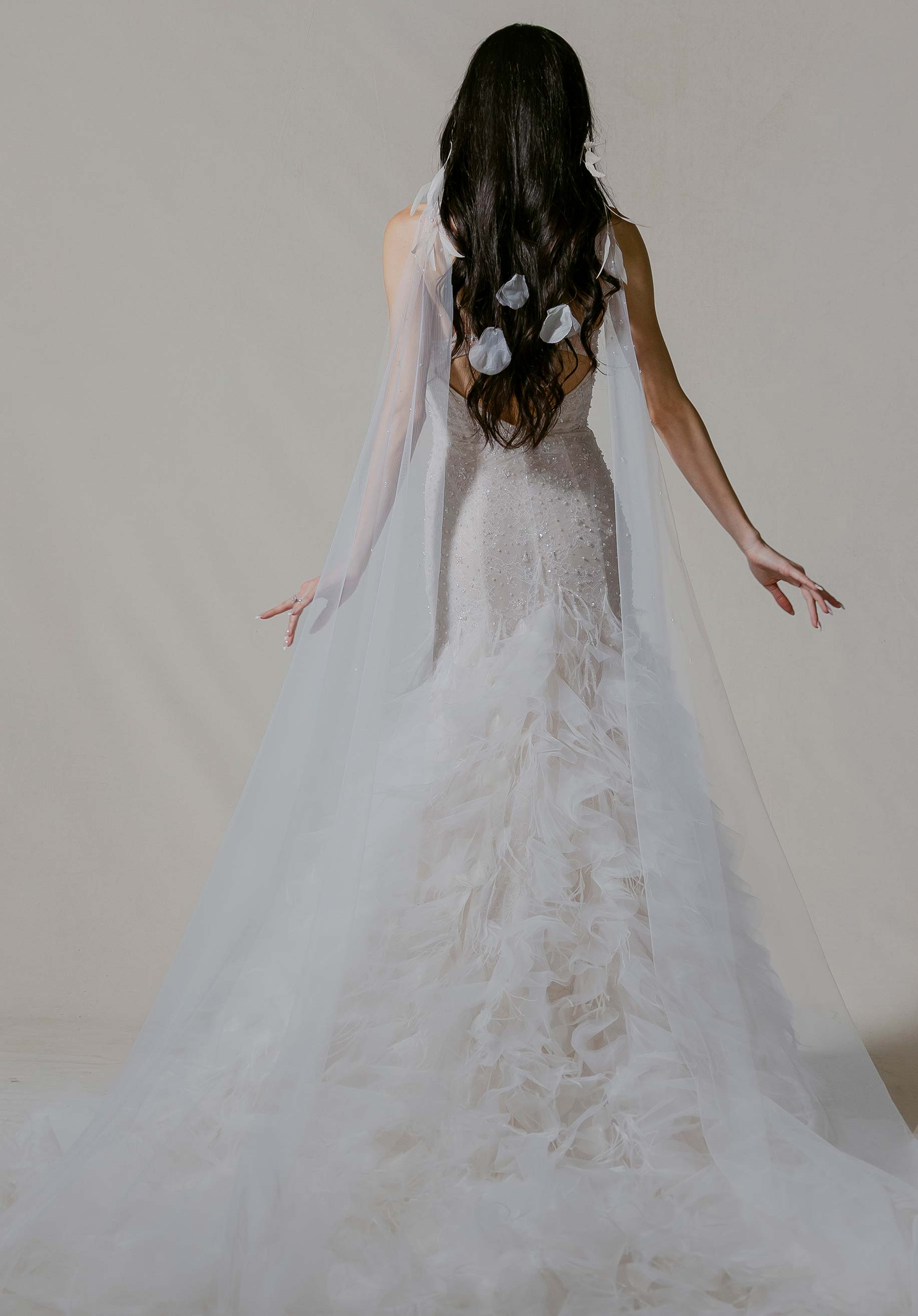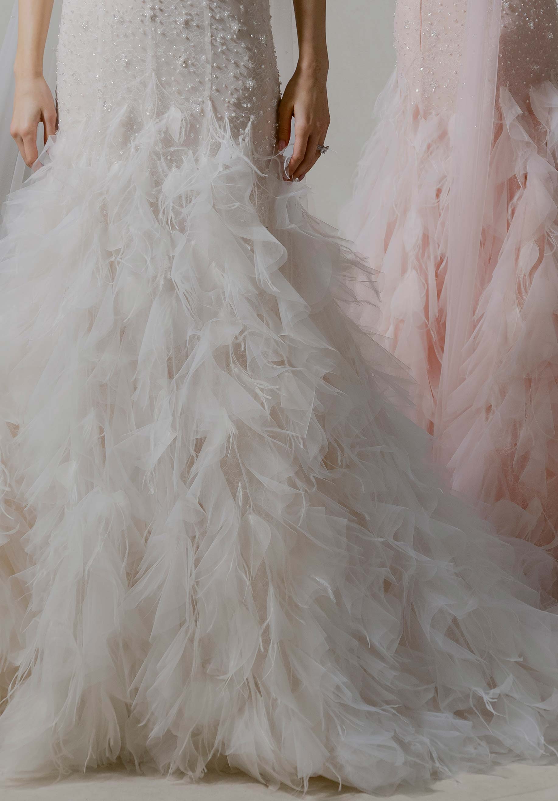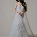 Mermaid wedding dress has a plunging v-neckline with a twisted, sweetheart Chantilly lace underlay and keyhole back in pearl embroidered tulle on a hand-cut tulle and feather ruffled skirt.