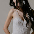 Effortless yet striking, our Seren wedding dress embodies poetic motion and whimsical sophistication. The mermaid silhouette features a plunging v-neckline layered over a twisted sweetheart Chantilly lace underlay, while a keyhole back in pearl-embroidered tulle shimmers with delicate luminosity. The hand-cut tulle and feathered ruffled skirt bursts with voluminous drama, moving like a cascade of light with every step, for a gown that is a vision of radiant glamour.