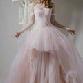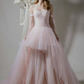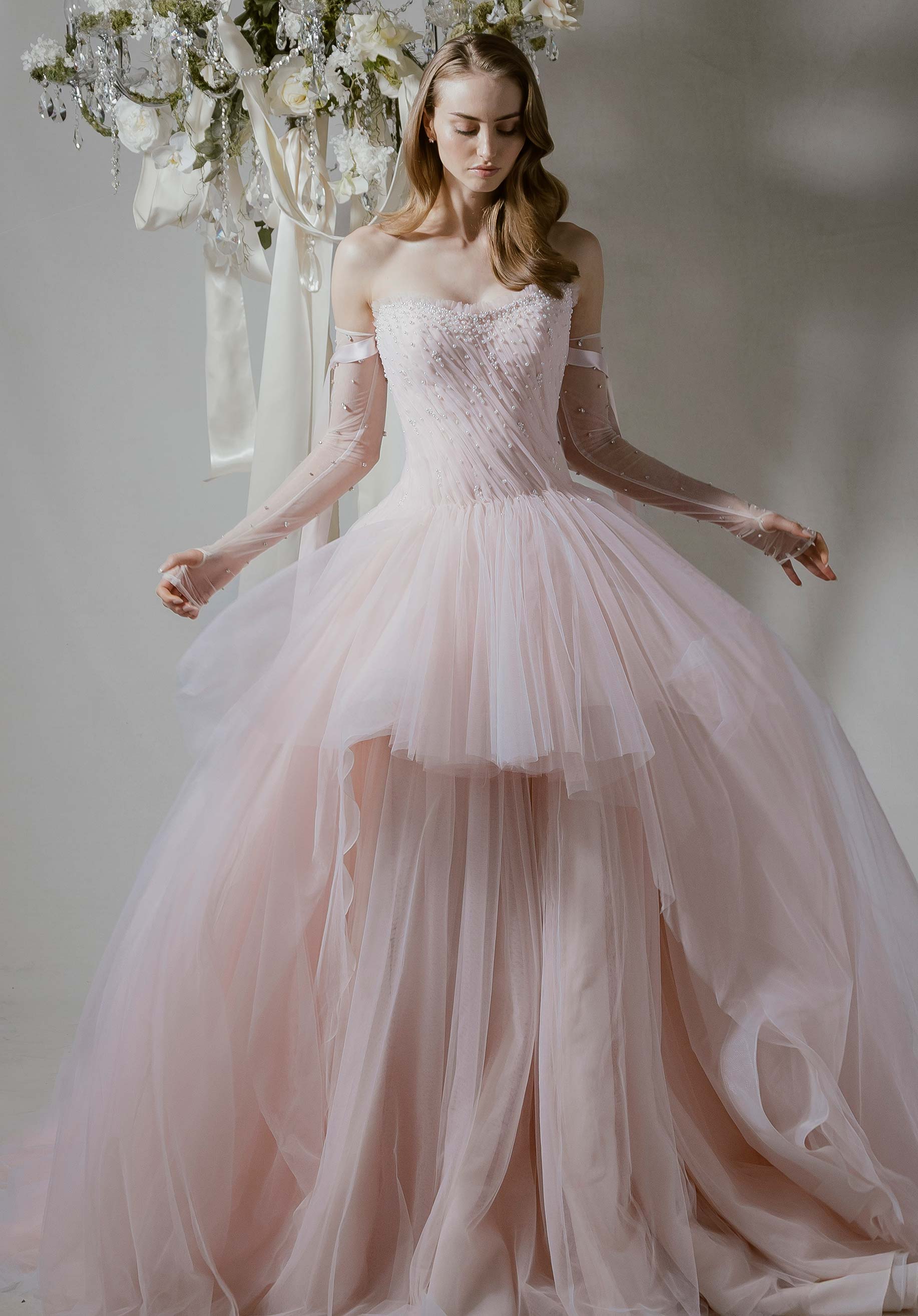 Tulle wedding dress has a strapless scoop bodice with pearl beaded detailing on an asymmetrically draped, hi-low A-line skirt with a detachable tulle underskirt.