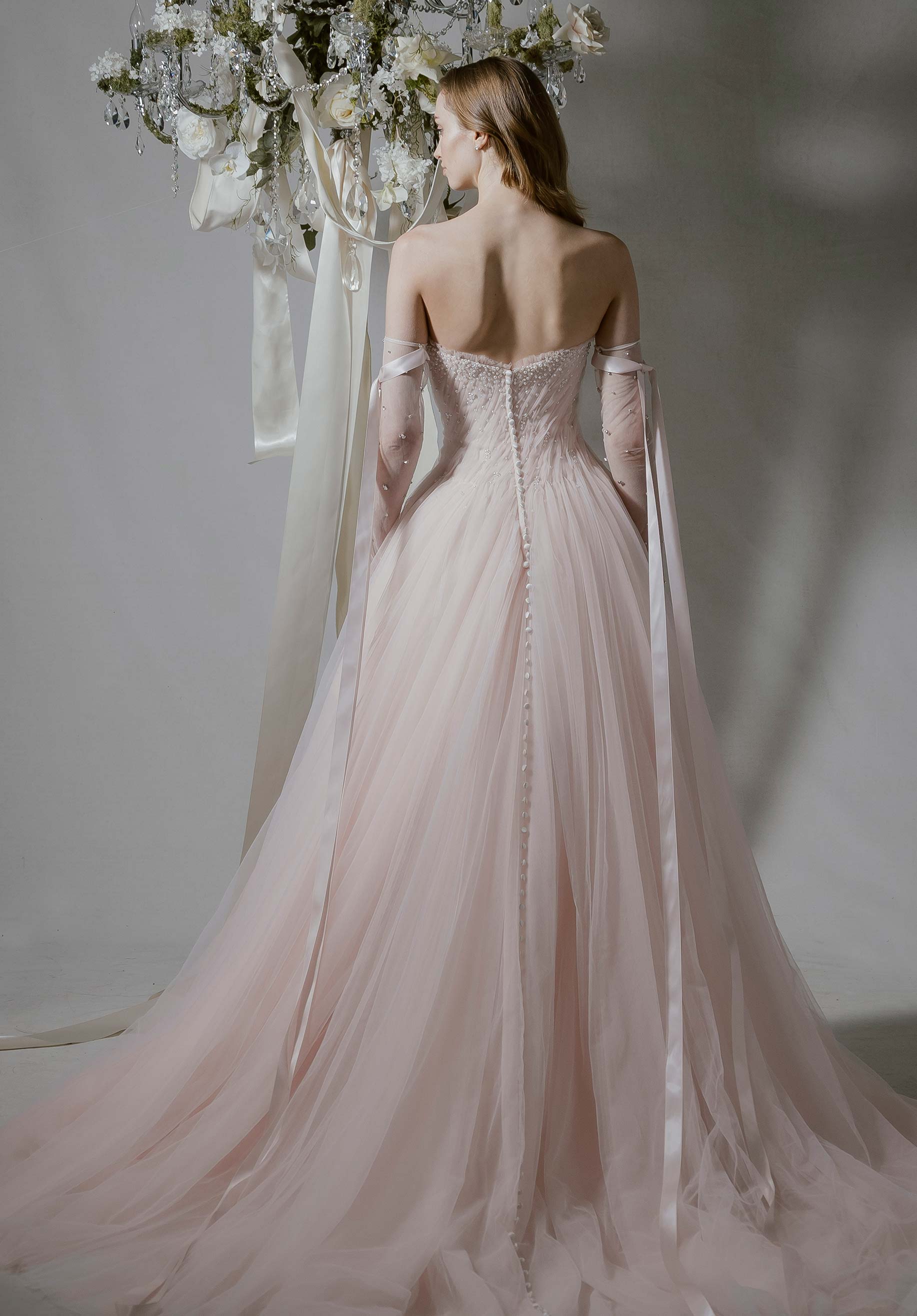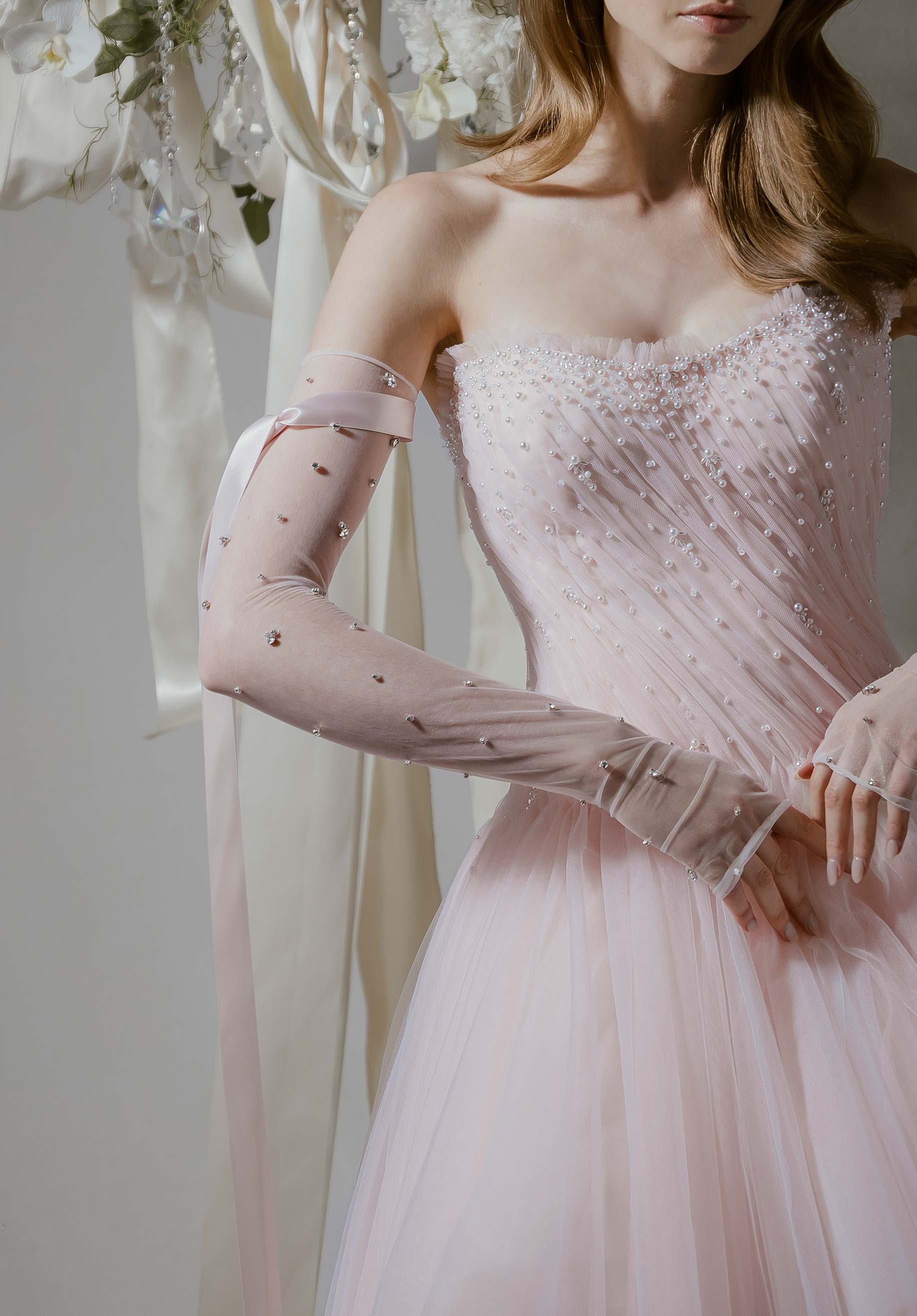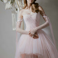 Our Solène wedding dress captures the artistry of movement in sculpted tulle. The strapless scoop bodice glimmers with pearl beading, adding subtle texture and luminosity. Asymmetrical draping leads to a hi-low A-line skirt that feels both modern and fluid, revealing soft layers of tulle with every step. A detachable underskirt transforms the look from airy and effortless to full and dramatic, allowing the bride to shift her look with ease, creating a grand moment, like a dancer’s final bow.