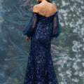 Fit and flare evening gown has an off-the-shoulder sweetheart neckline with sheer bishop sleeves in beaded lace over tulle.