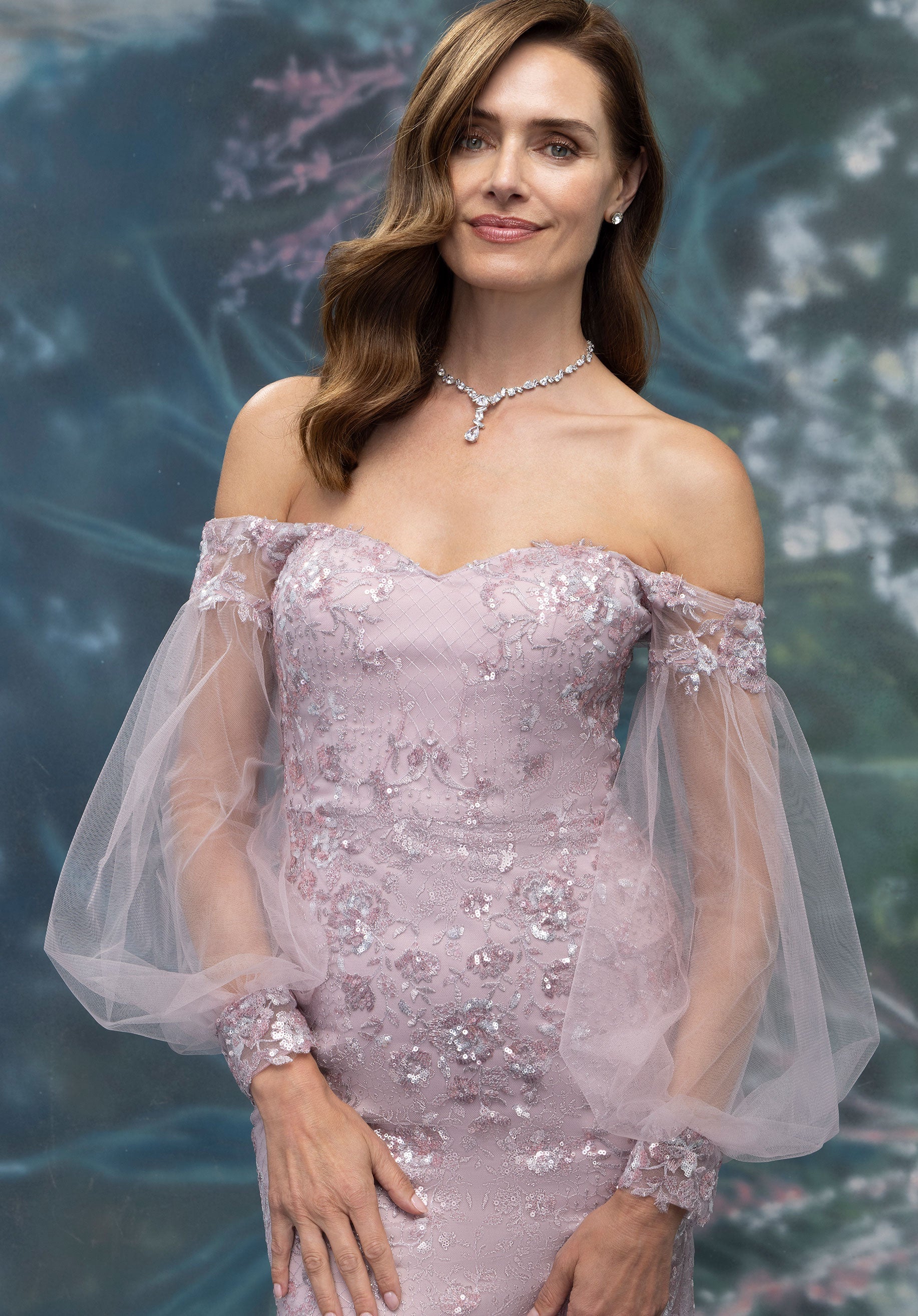 Serve timeless femininity with intricate detail. This fit and flare gown features an off-the-shoulder sweetheart neckline and sheer bishop sleeves, crafted in beaded lace over delicate tulle. The silhouette balances ethereal texture with a sculpted, contemporary shape.
