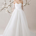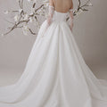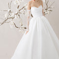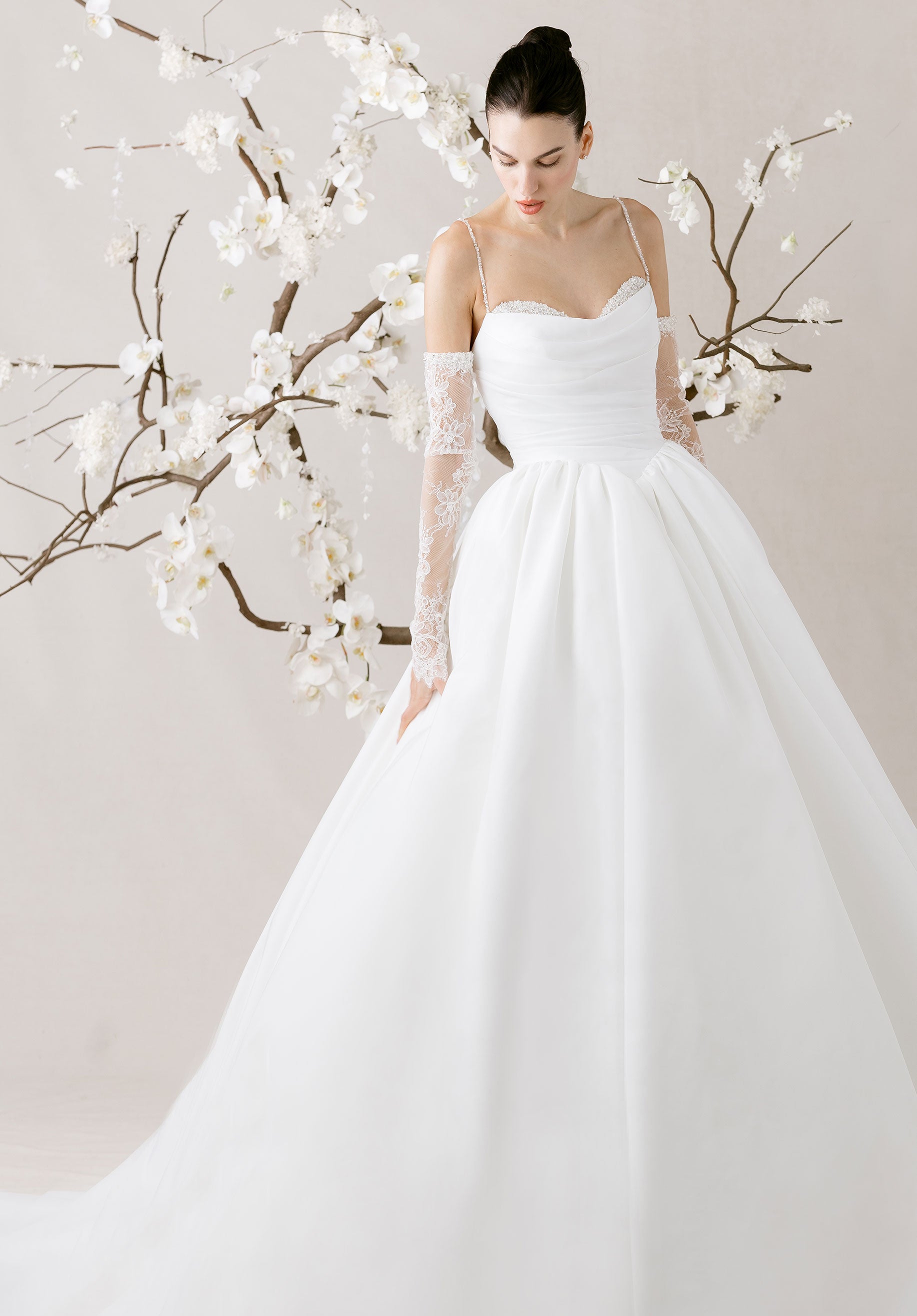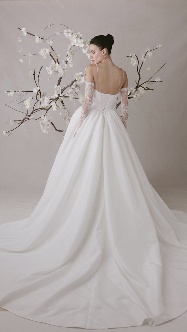 Our Élevé wedding dress is a faille ball gown that captures the elegance of soft movement. The scoop neckline features a sweetheart Chantilly lace peek-a-boo detail, framed by delicate sequin and beaded straps that shimmer with quiet light. A basque waist draws the eye in, enhancing the flare of the skirt, while the lace-up corset back sculpts the silhouette. For an ethereal touch, pair the gown with the matching lace gauntlet sleeves.