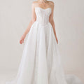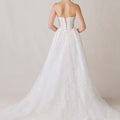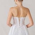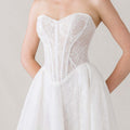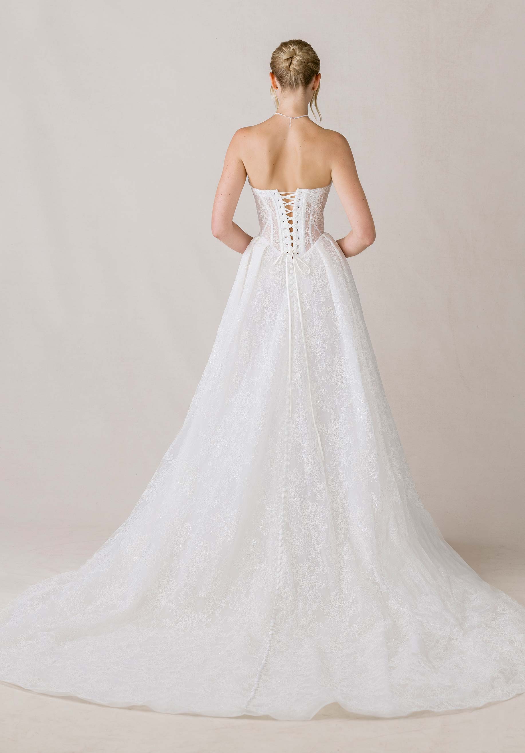 Our Everette wedding dress exudes sculptural romance. The soft ball gown features a strapless sweetheart neckline framed by a boned bodice that evokes the refined posture of a dancer mid-pose. The stylized basque waist cinches gracefully, accentuating the shape of the silhouette, while the lace-up corset back adds a touch of timeless allure. Crafted in beaded embroidered corded lace, the gown shimmers with an intricate play of light, each movement revealing new dimension, as if the fabric itself were in motion.