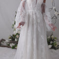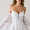 A-line wedding dress has a strapless, plunging cat eye neckline in floral burnout organza appliqué tulle over Chantilly lace with detachable burnout organza flare sleeves and organza neck scarf.