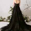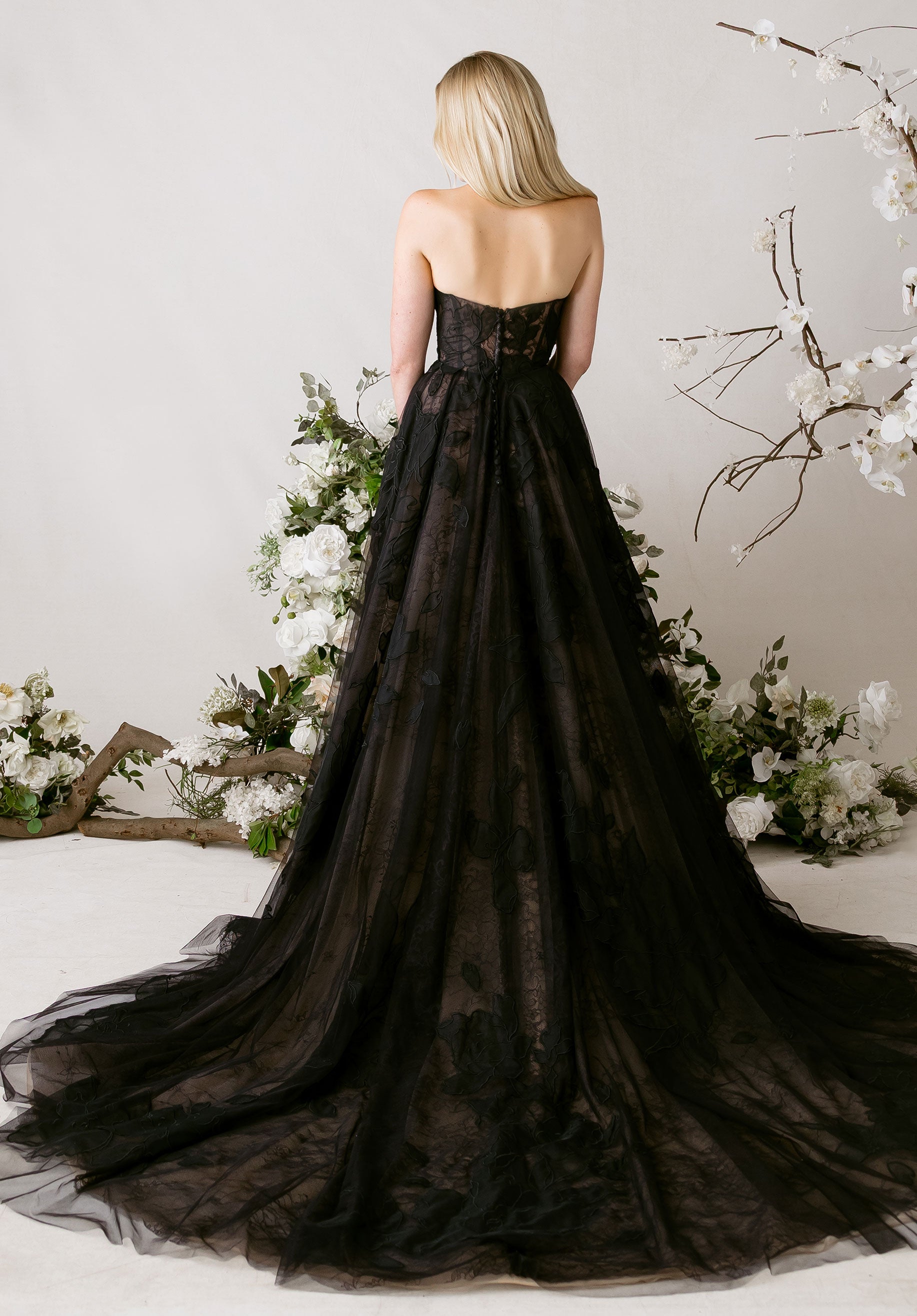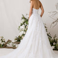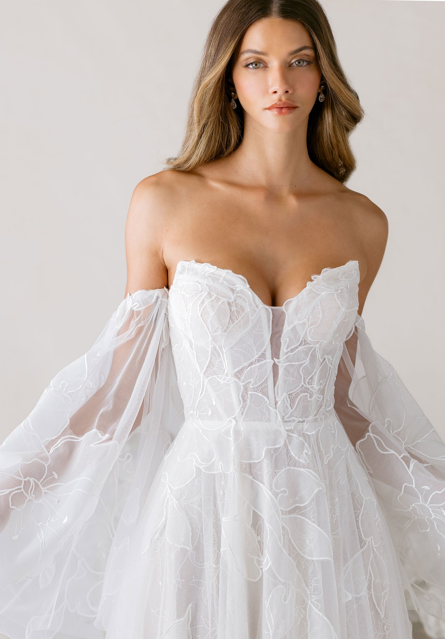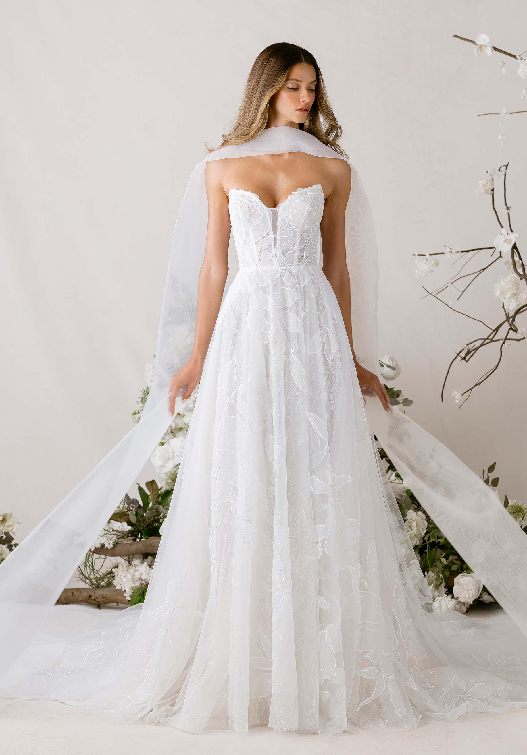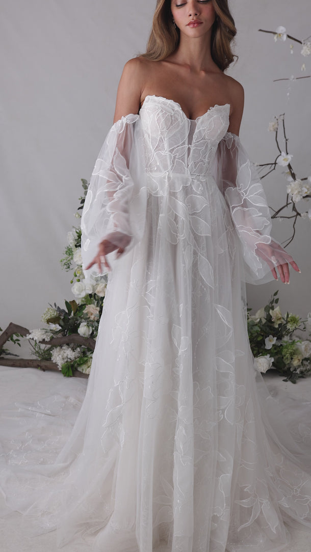 Our Tendu wedding dress is a delicately enchanting A-line gown that dances with romantic movement. A strapless, plunging cat eye neckline draws the eye down to the layers of floral burnout organza appliqué tulle over soft Chantilly lace, creating depth and texture with every glance. Detachable burnout organza flare sleeves drift gracefully from the shoulders, while a flowing organza neck scarf adds a whisper of ethereal elegance. The skirt floats with gentle, airy motion, embodying a gown that is simultaneously soft, sculpted, and poetically light.