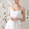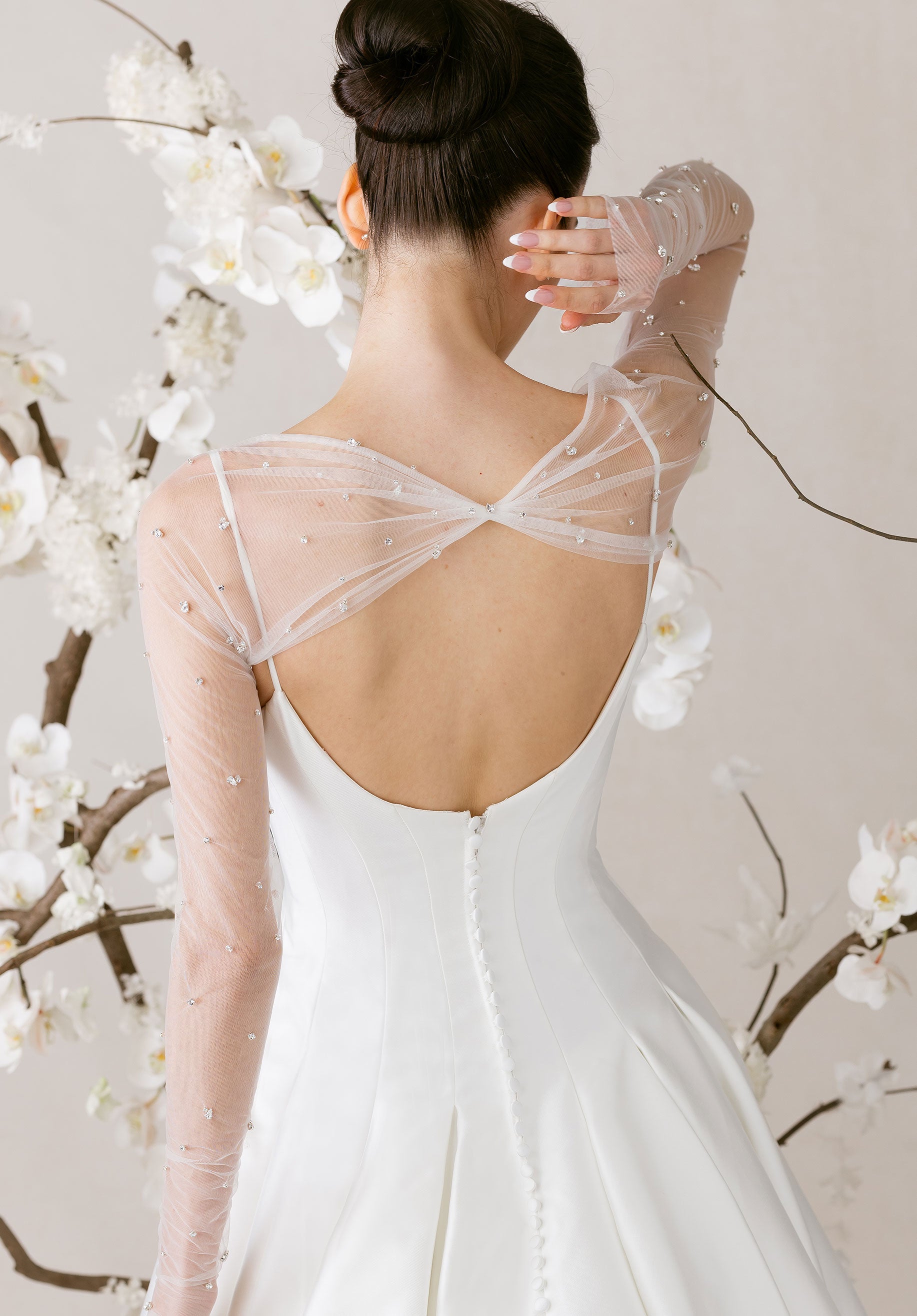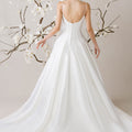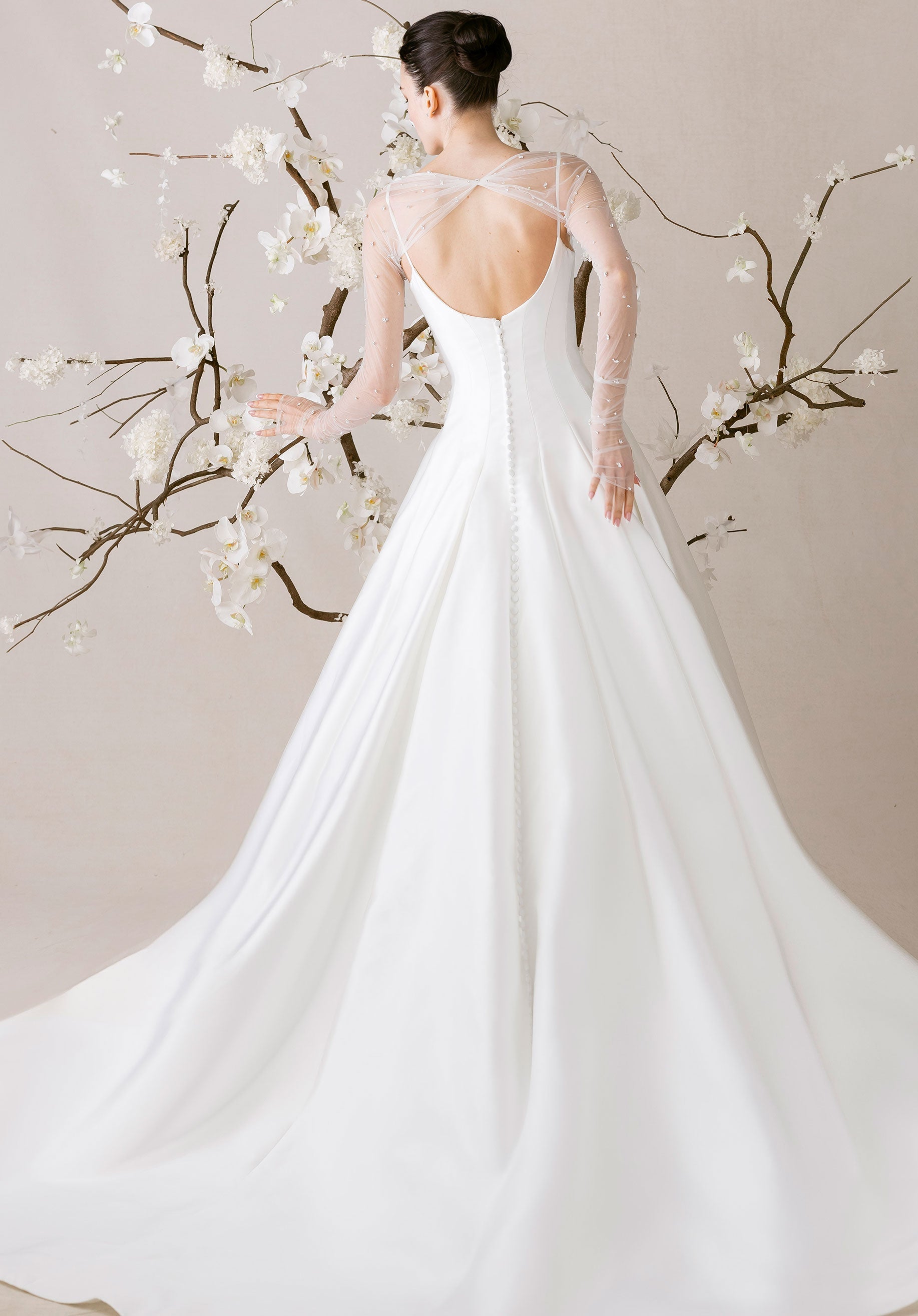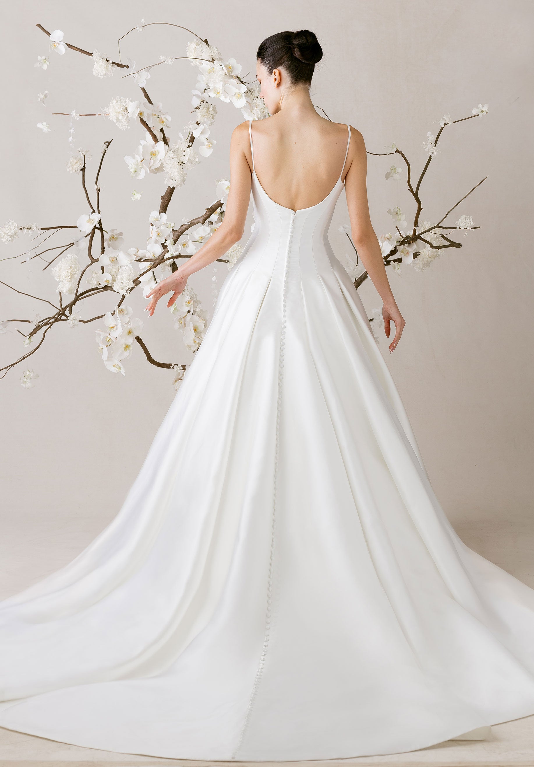 Radiant and refined, our Vivienne wedding dress is a Mikado ball gown that exudes effortless sophistication. A soft scoop neckline and matching scoop back are framed by delicate thin straps, while elongating princess seams sculpt the silhouette with subtle precision, elongating the silhouette. Buttons trail gracefully down the back to the flowing train, adding a hint of classic romance. The full skirt floats with serene elegance, creating a gown that feels airy, luminous, and simply captivating.