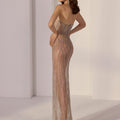 This illusion sheath party dress just might be sheer perfection. The plunging strapless sweetheart neckline and thigh-high slit create bold, flattering lines, while linear crystal beading on tulle elongates the silhouette and catches the light with every movement. Sleek, sexy, and unapologetically dazzling.