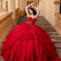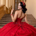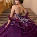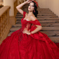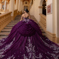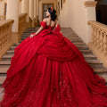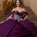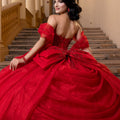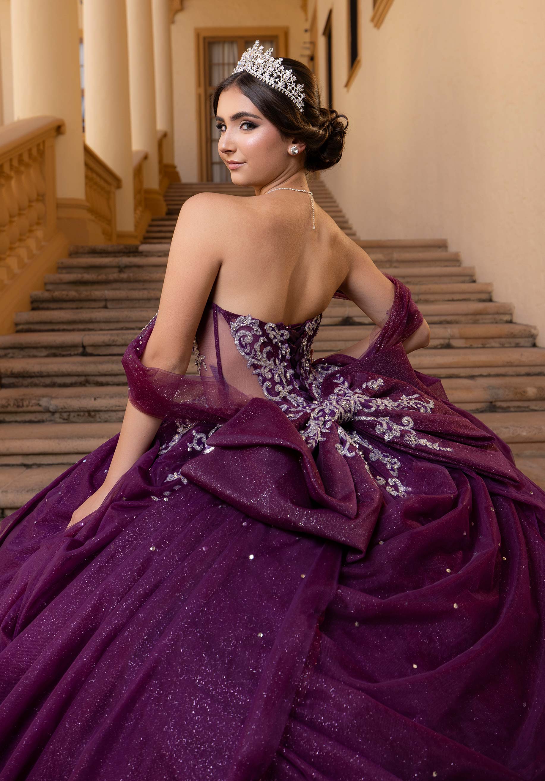 Unleash your inner star with our Bailey quinceañera dress, a gown designed for drama, sparkle, and unforgettable elegance. The sweetheart neckline features sparkling beading and draped detailing, framed by sheer illusion sides and detachable off-the-shoulder sleeves for versatile style. From the basque waist, the glitter tulle ball gown skirt flows with cascading beading, dramatic draping, and intricate appliqué work, finished with a detachable back bow, making it the ultimate dress for a breathtaking celebration.