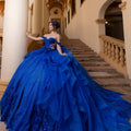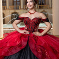 Glitter tulle quinceañera dress is a fitted, sweetheart mini dress with intricate beaded lace, sheer sides, and detachable off-the-shoulder sleeves with a detachable gown skirt featuring 3D floral appliqué, a ruffle overskirt, and a detachable crystal-beaded double loop bow.