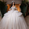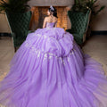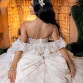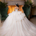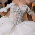 Let every detail shine in our Bella quinceañera dress, where crystal accents meet playful glamour. The sheer corset bodice features a romantic sweetheart neckline and a detachable stole adorned with crystal chains for extra sparkle. The basque waist ball gown skirt flows in full drama with tiered pick-up details and floral glitter appliqués that shimmer with every step. matching floral glitter double-loop bow completes the look for a showstopping moment you’ll never forget.