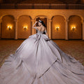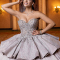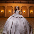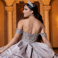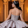 Satin quinceañera dress is an A-line mini dress featuring a sheer, crystal-encrusted corset bodice with detachable off-the-shoulder sleeves, with a detachable ball gown skirt with glitter tulle appliqués, and creating a peplum detail with a detachable back bow.