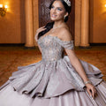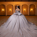 Shine from every angle in our Benny quinceañera dress, a two-in-one design made for the modern quince girl. The satin A-line mini dress features a sheer, crystal-encrusted corset bodice with detachable off-the-shoulder sleeves, combining sparkle and elegance in a playful silhouette. Transform the look with the detachable glitter tulle ball gown skirt, which creates layered peplum detail from the mini and completes the ensemble with a matching detachable back bow, perfect for a quinceañera who loves both chic party style and full princess glamour.