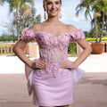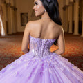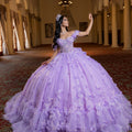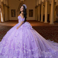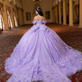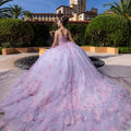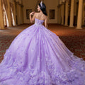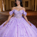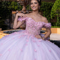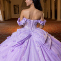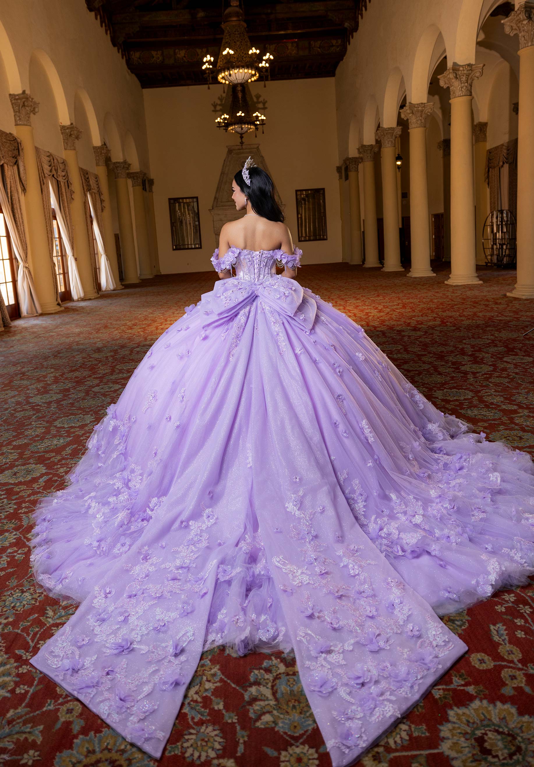 Glitter tulle quinceañera dress is a fitted, sweetheart mini dress with a sheer bodice featuring crystal beaded boning and 3D florals with detachable 3D floral off-the-shoulder sleeves with crystal chains and a detachable ball gown overskirt with 3D floral appliqués and a matching double-loop bow.