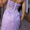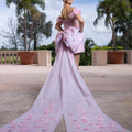 Our Blanca quinceañera dress is a two-in-one look made to stand out. The glitter tulle mini dress stuns with its sweetheart neckline, sheer bodice, and crystal-beaded boning, all brought to life with delicate 3D florals. Detachable off-the-shoulder sleeves adorned with floral accents and sparkling crystal chains add extra drama. For your big reveal, the detachable ball gown overskirt blooms with cascading 3D appliqués and finishes with a matching double-loop bow, giving you a full princess moment before transforming back into a chic party mini.