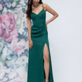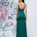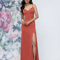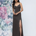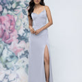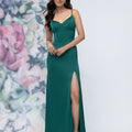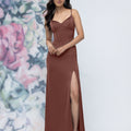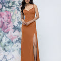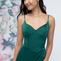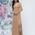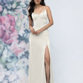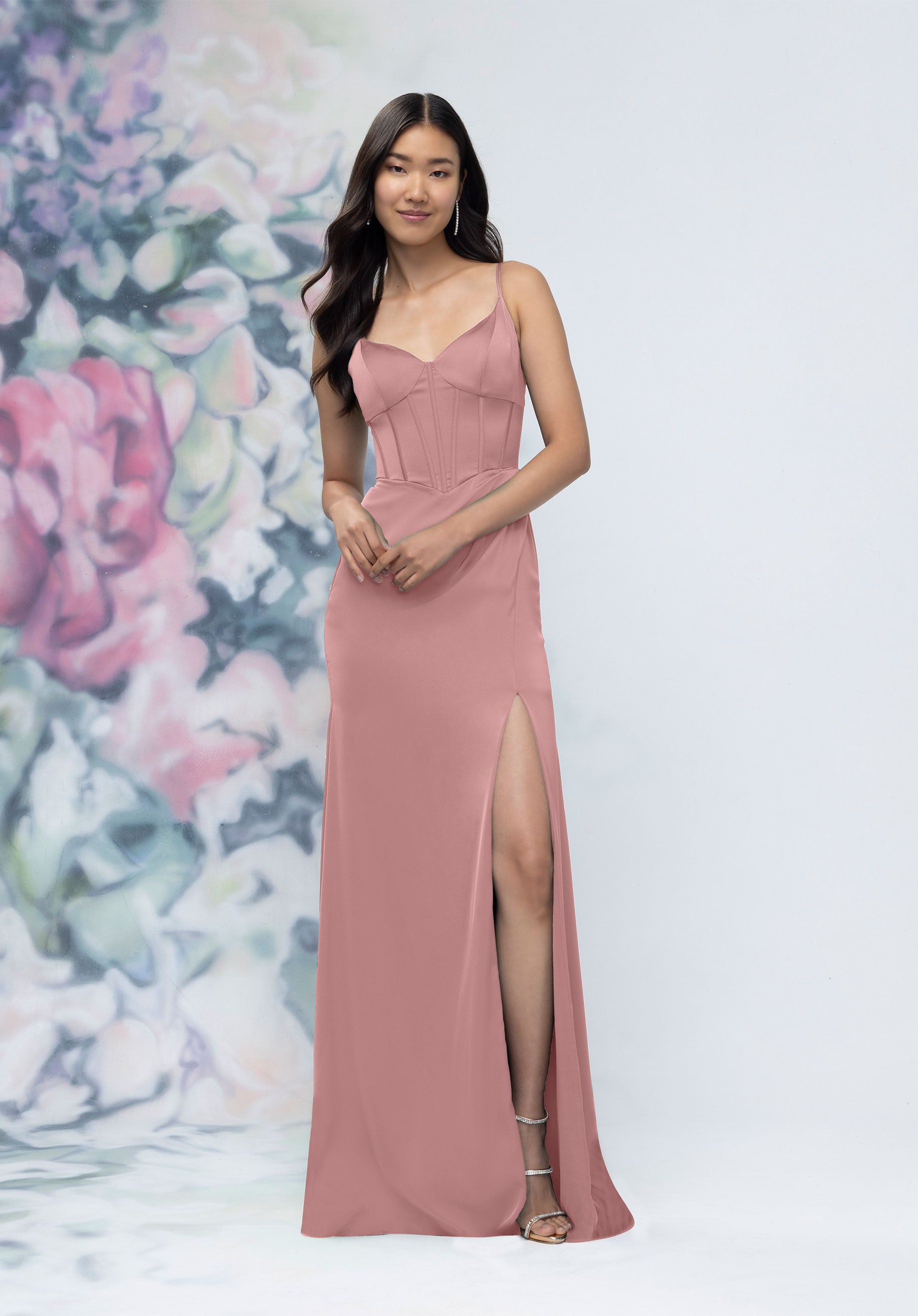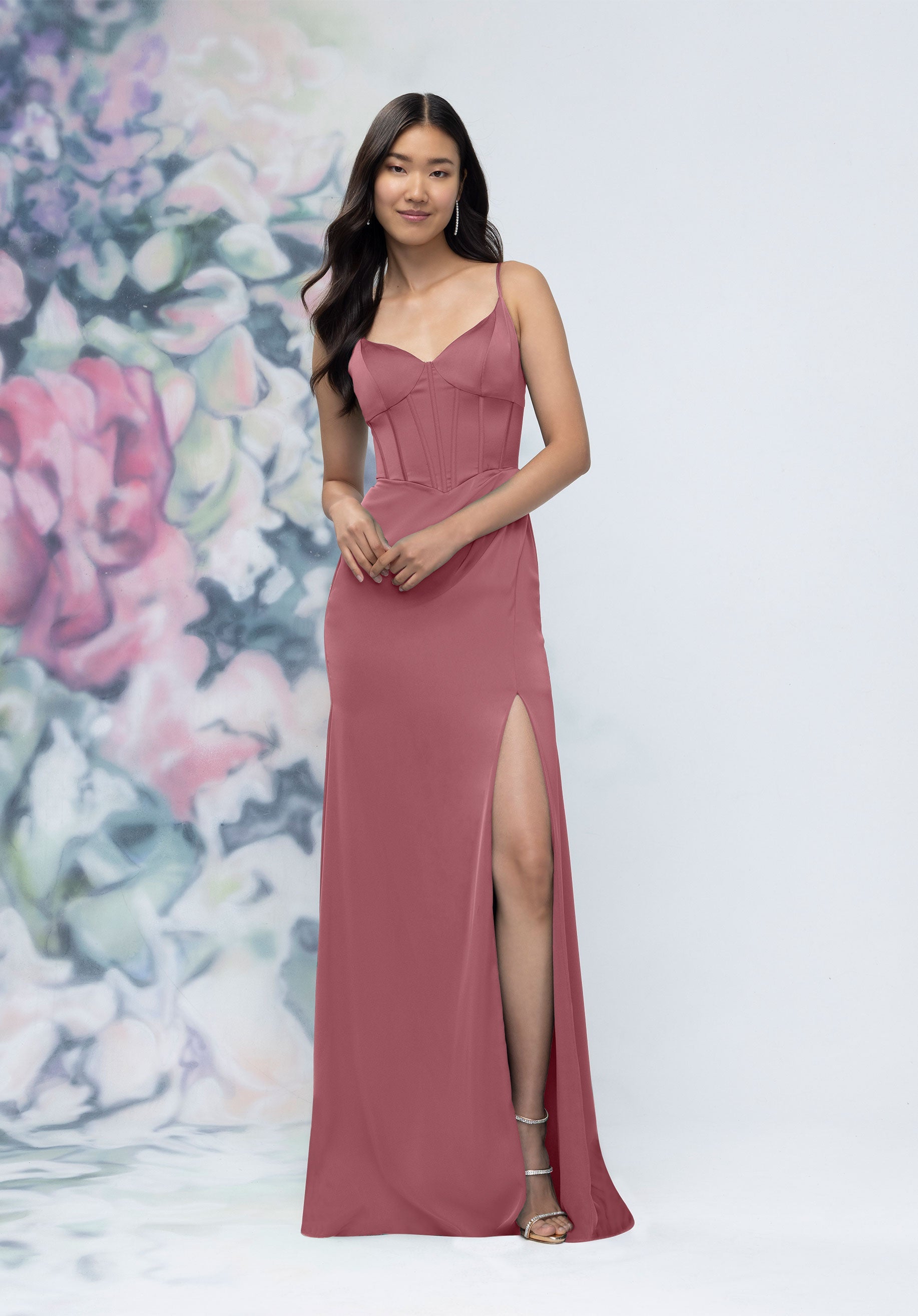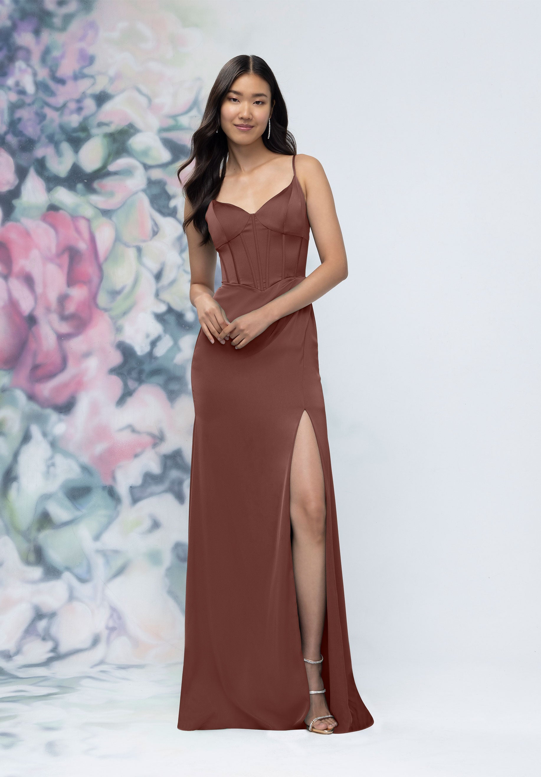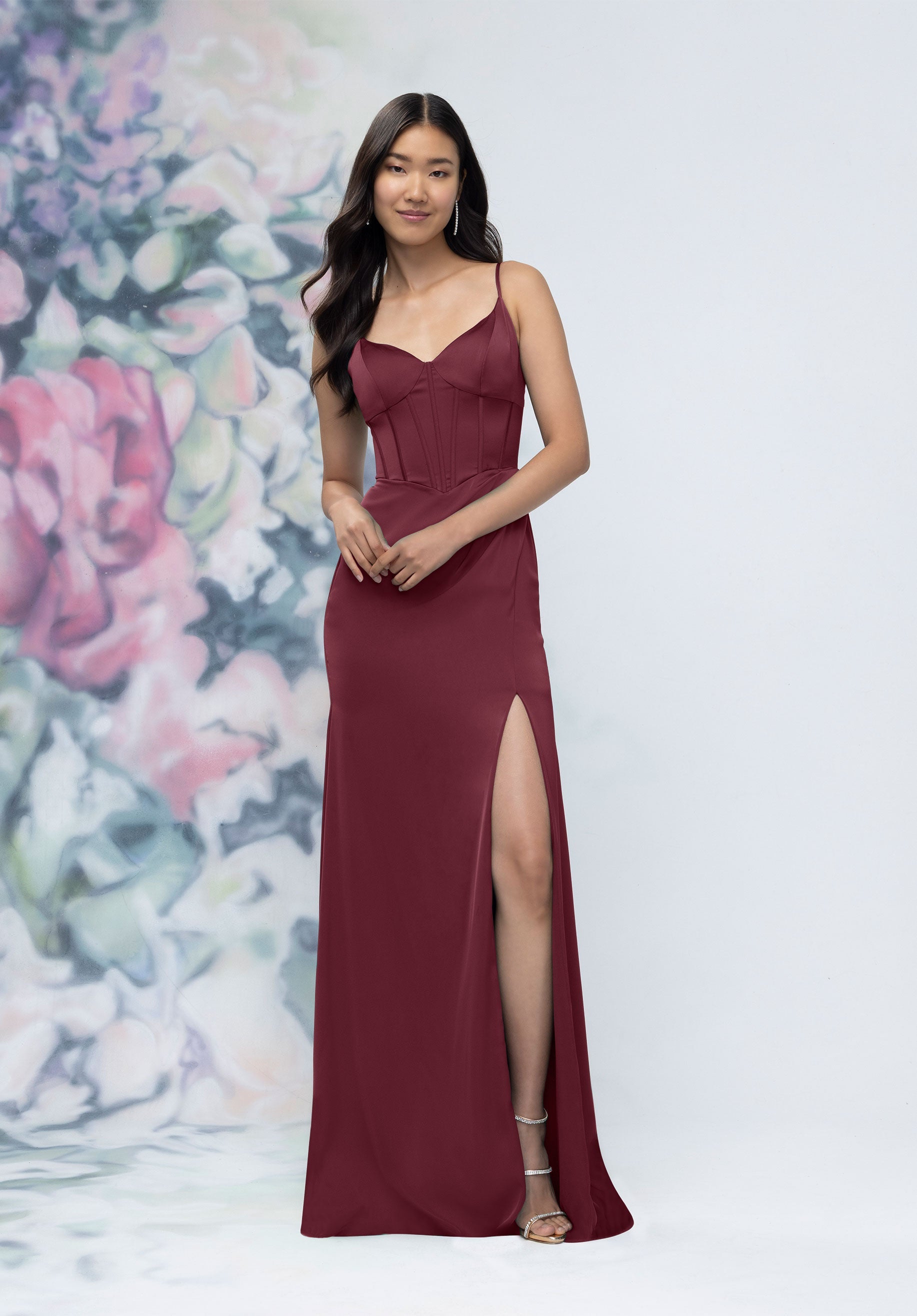 This luxe satin bridesmaid dress features a stylized cat eye neckline on a boned bodice, accentuating the silhouette with structured sophistication. A defined basque waist and scoop back create flattering lines, while a subtle skirt slit adds movement for a gown that serves modern elegance with sculpted detail.