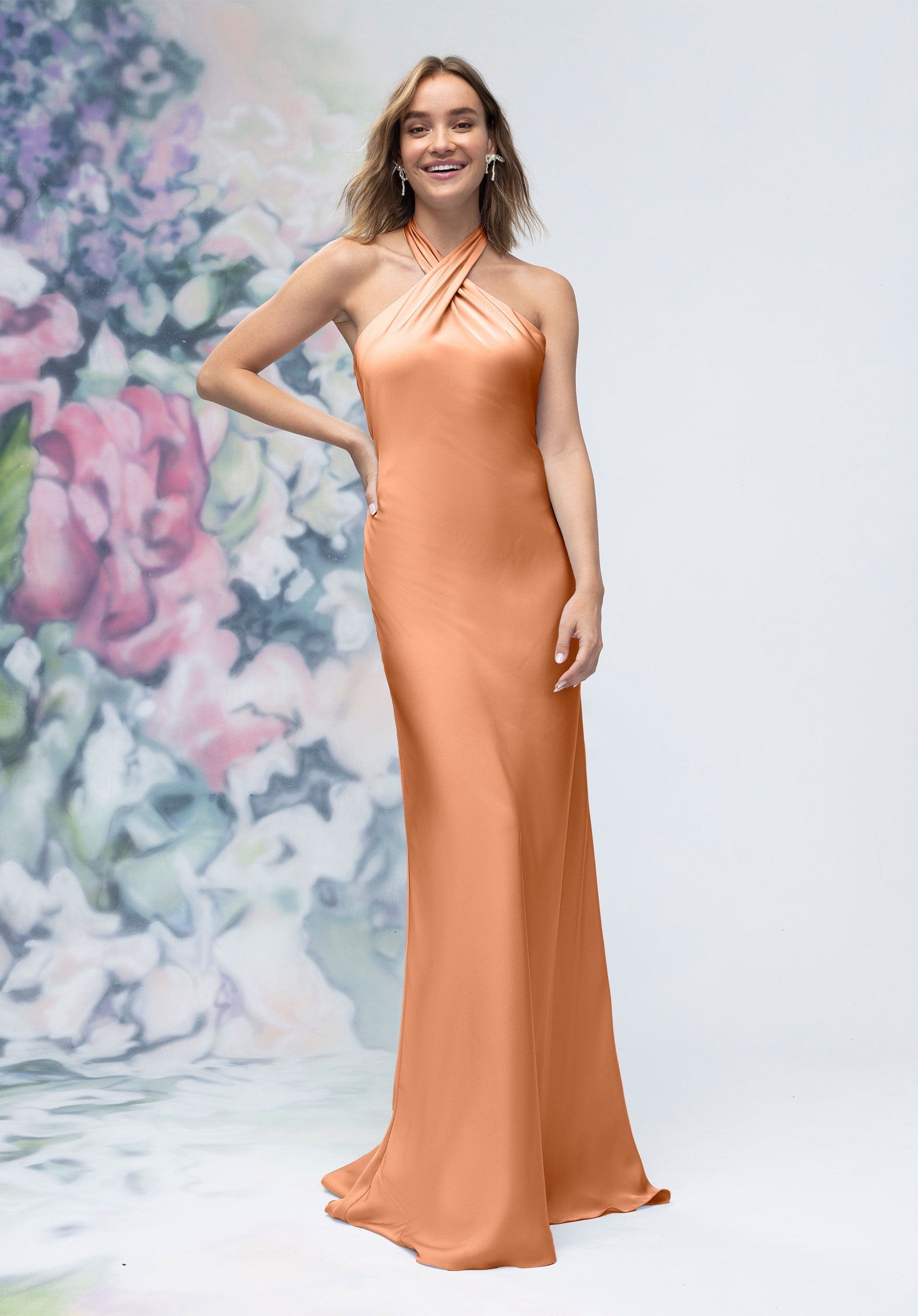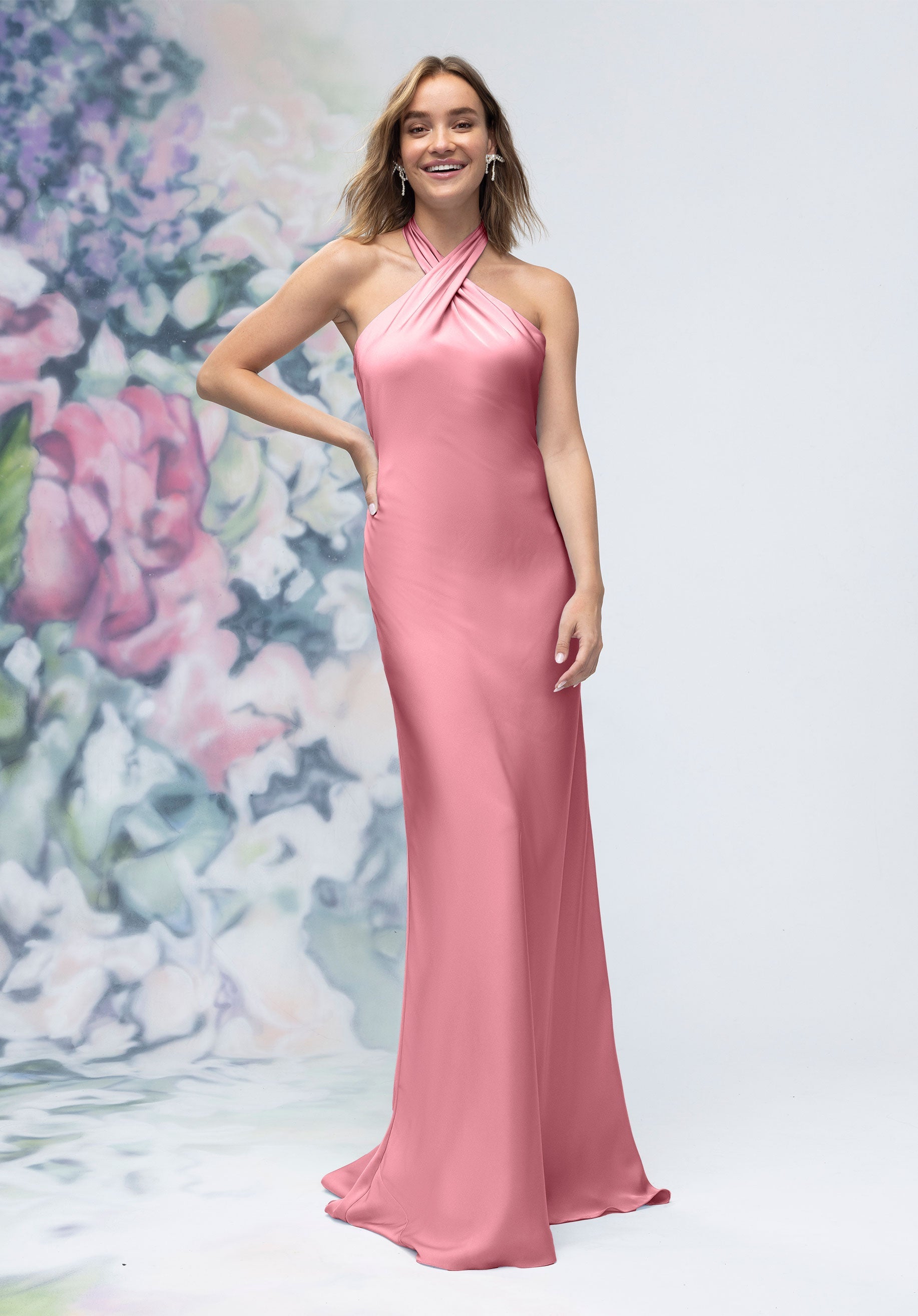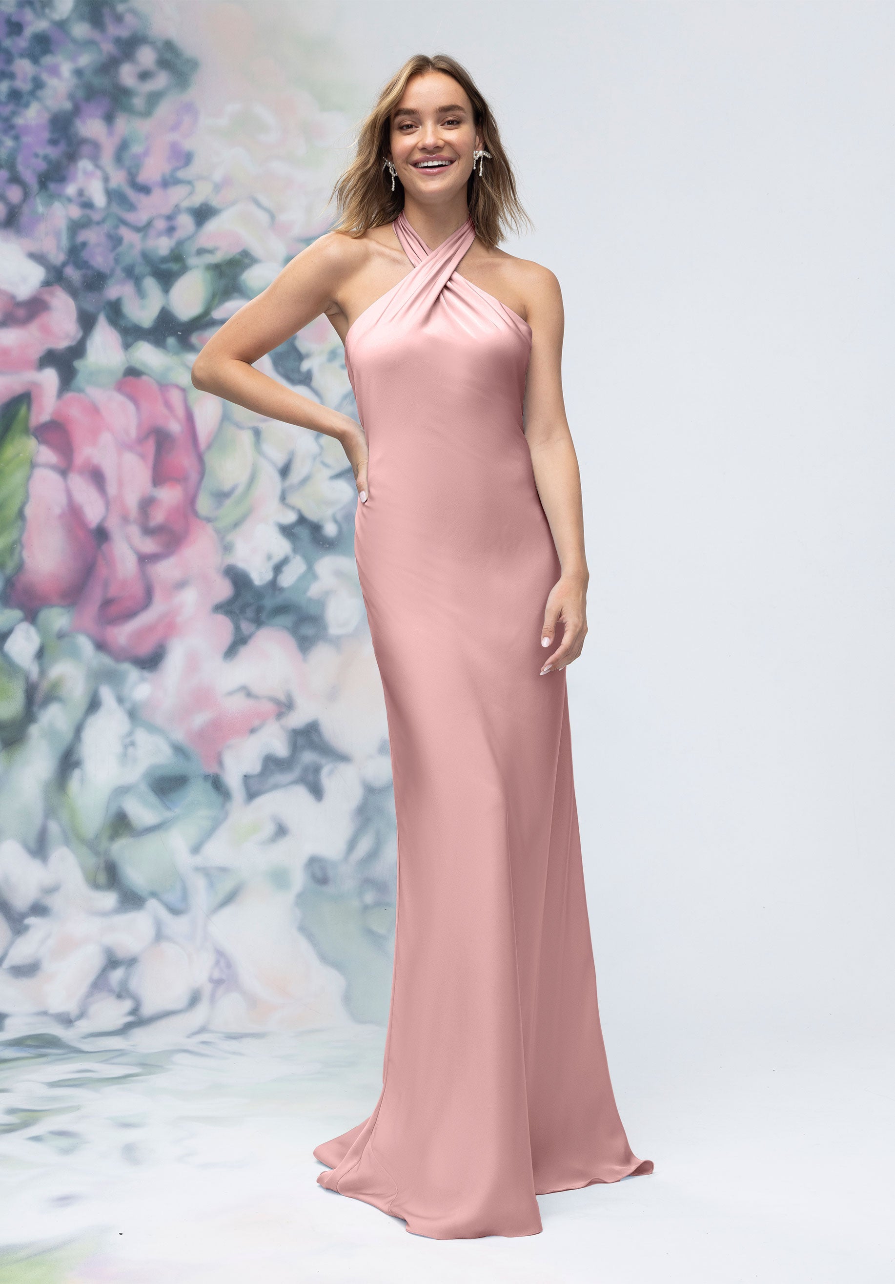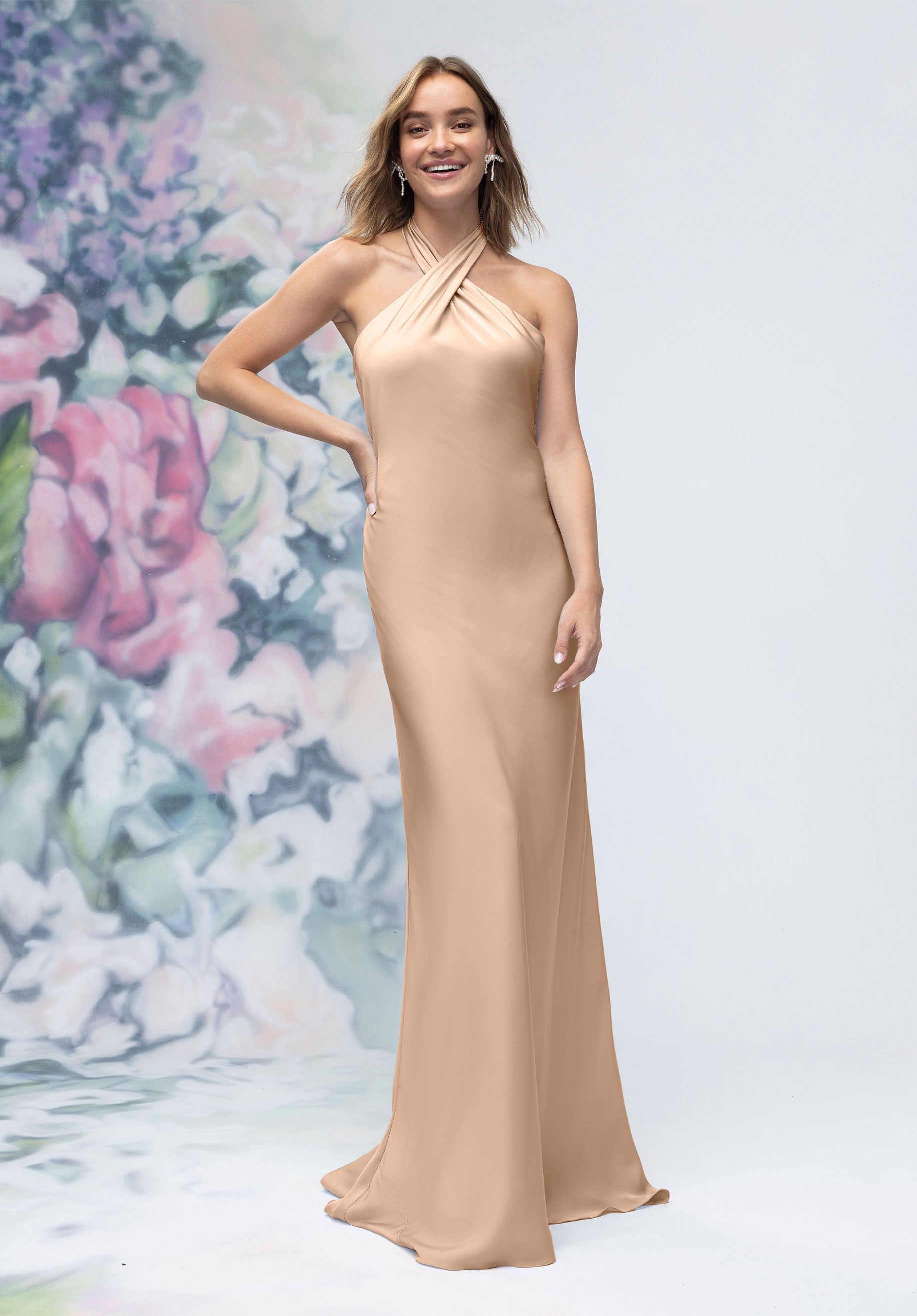 This luxe satin sheath bridesmaid dress features a crisscross halter neckline that beautifully frames the shoulders, paired with an open back for a subtle touch of drama. Streamlined and elegant, it’s a contemporary silhouette designed for bridesmaids who want sleek sophistication.