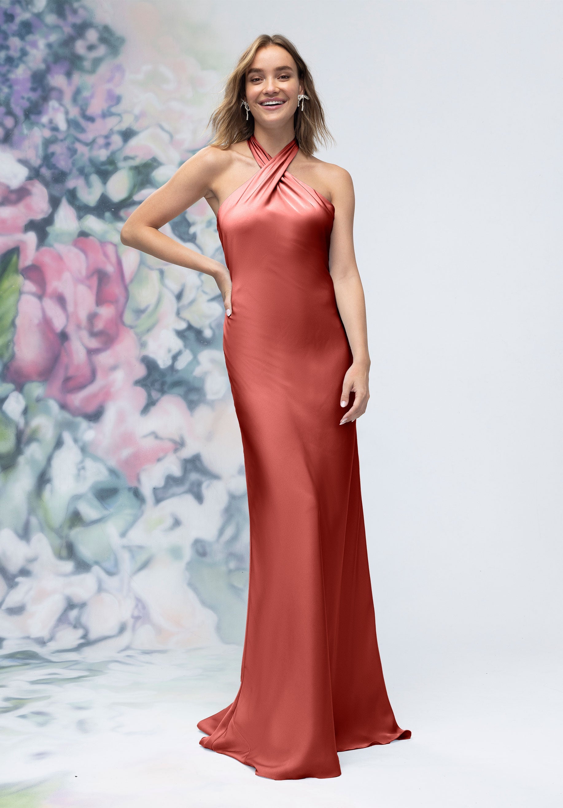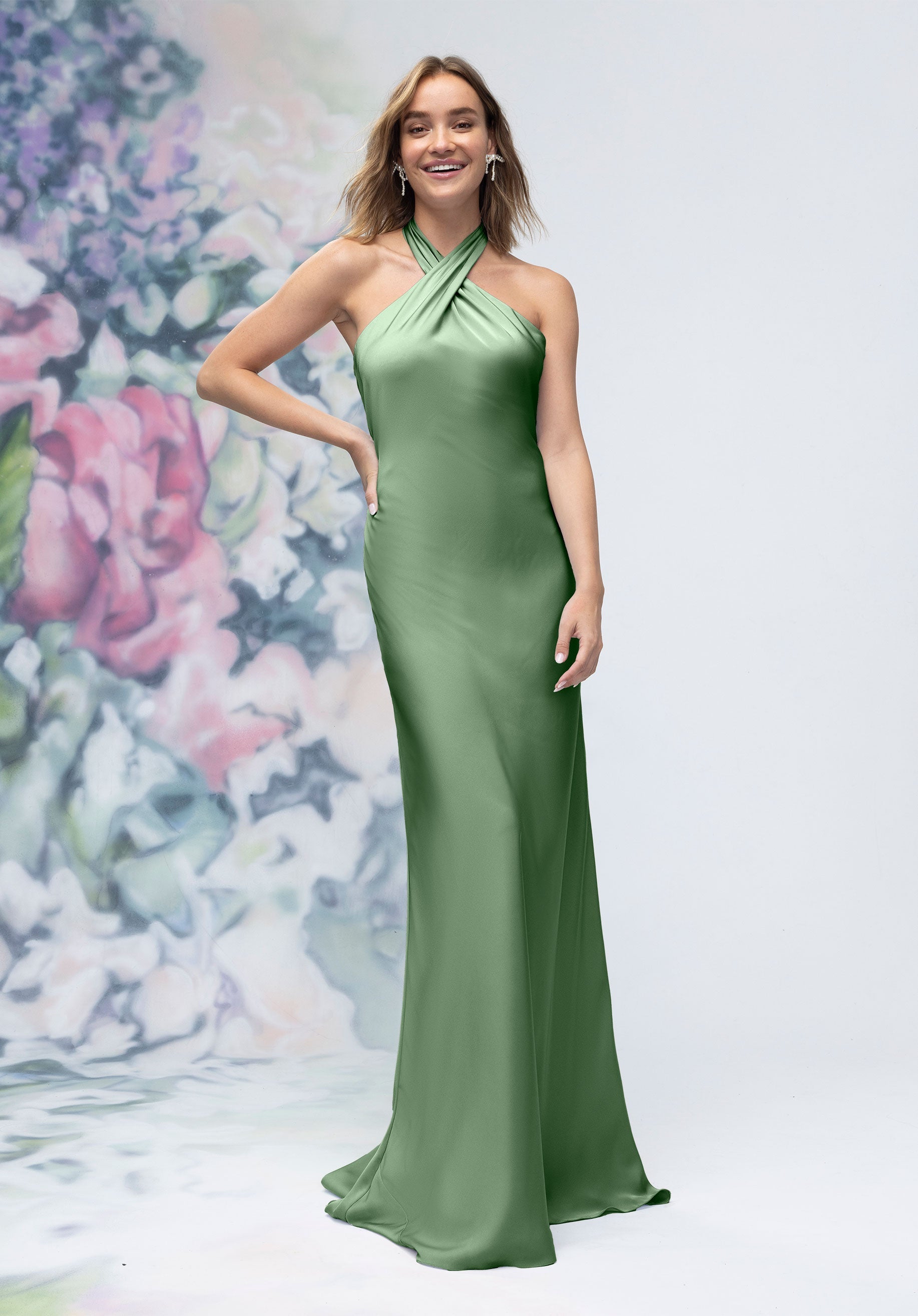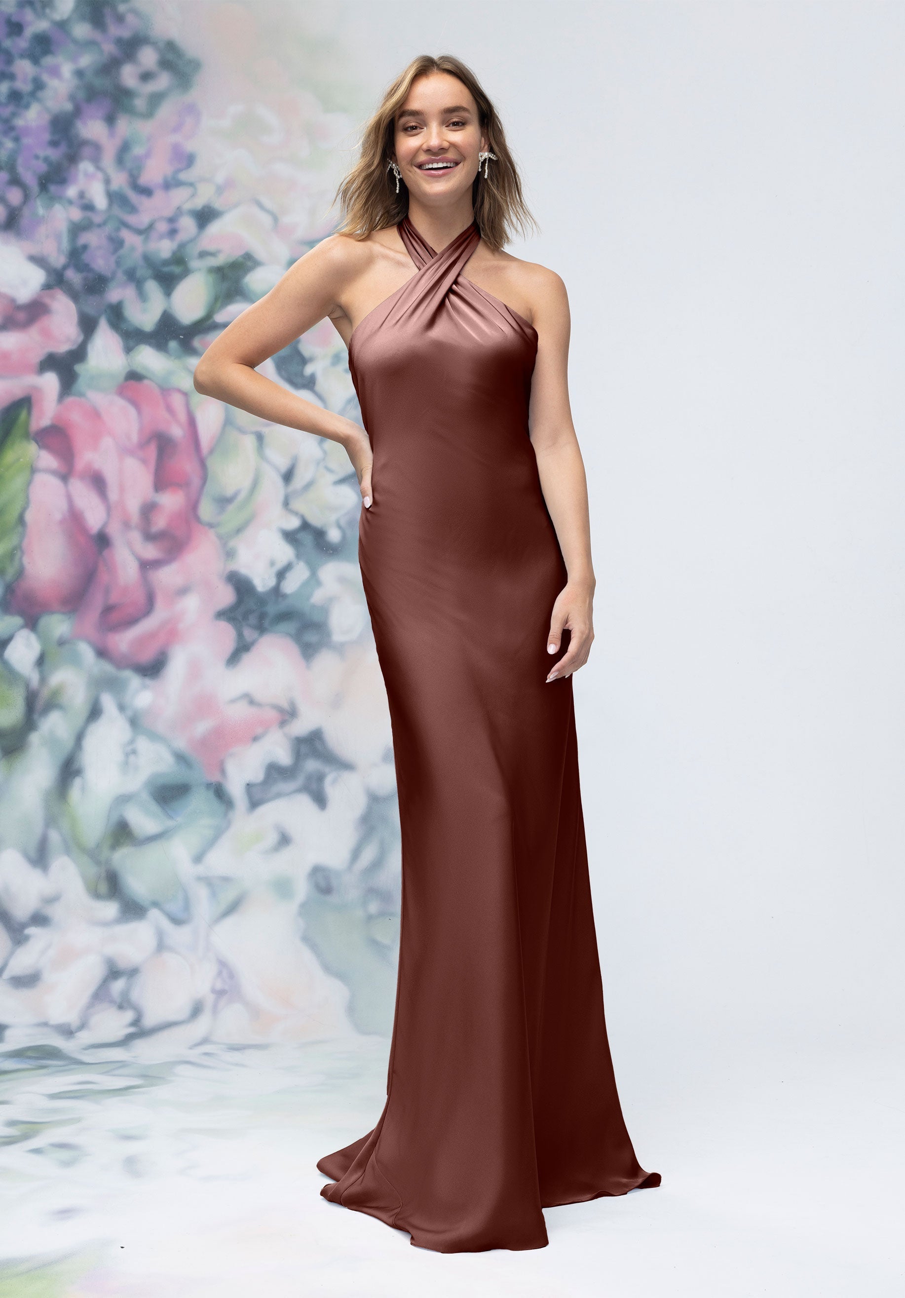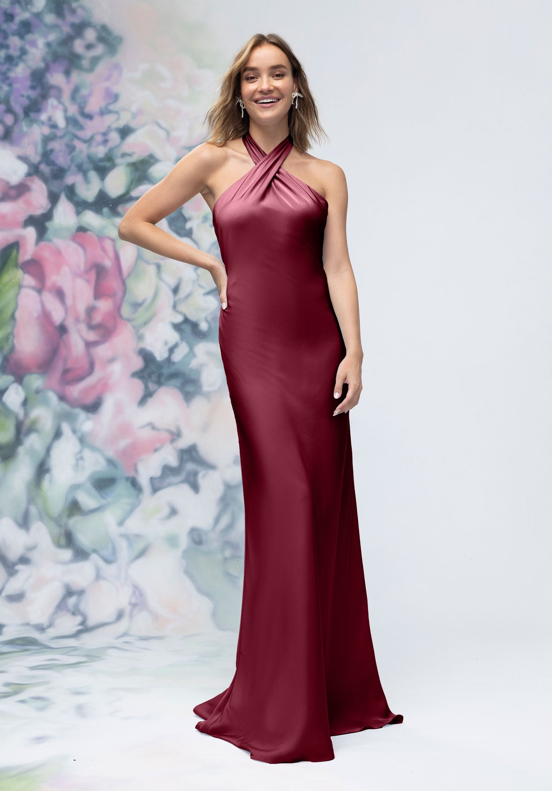 This luxe satin sheath bridesmaid dress features a crisscross halter neckline that beautifully frames the shoulders, paired with an open back for a subtle touch of drama. Streamlined and elegant, it’s a contemporary silhouette designed for bridesmaids who want sleek sophistication.