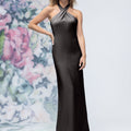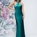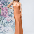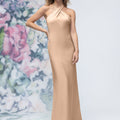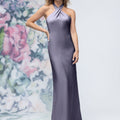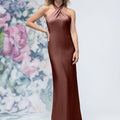 Sheath luxe satin bridesmaid dress has a criss cross halter neckline and open back.