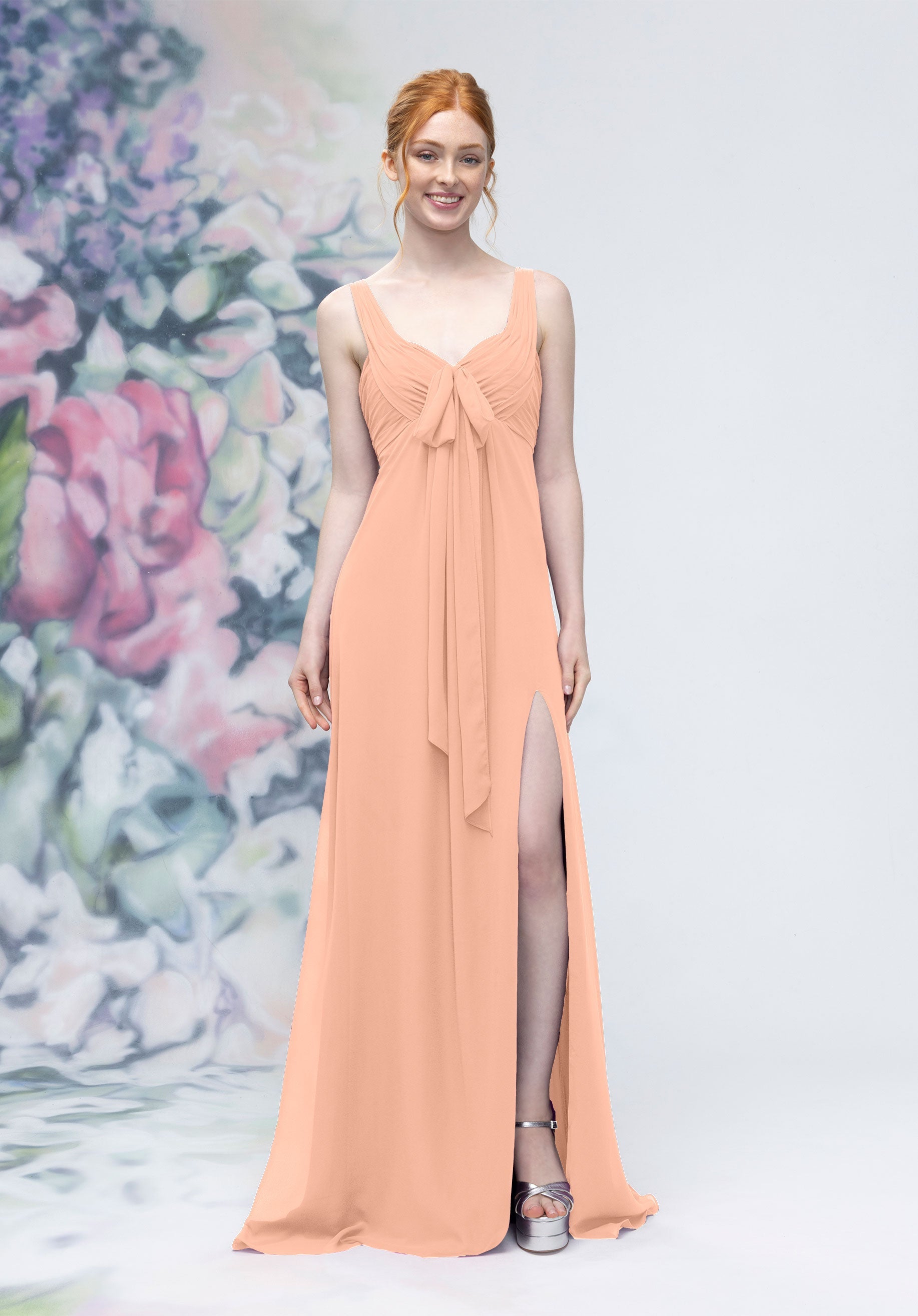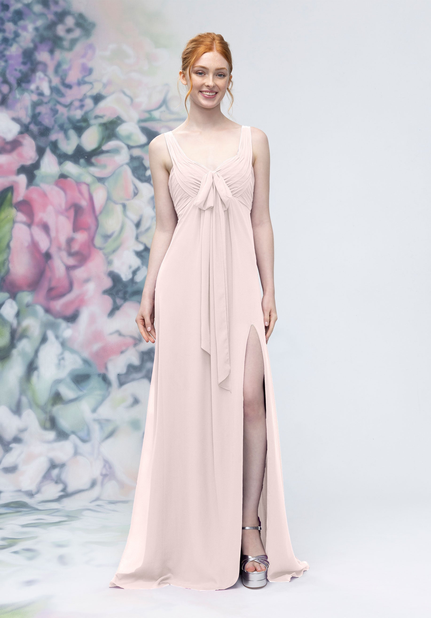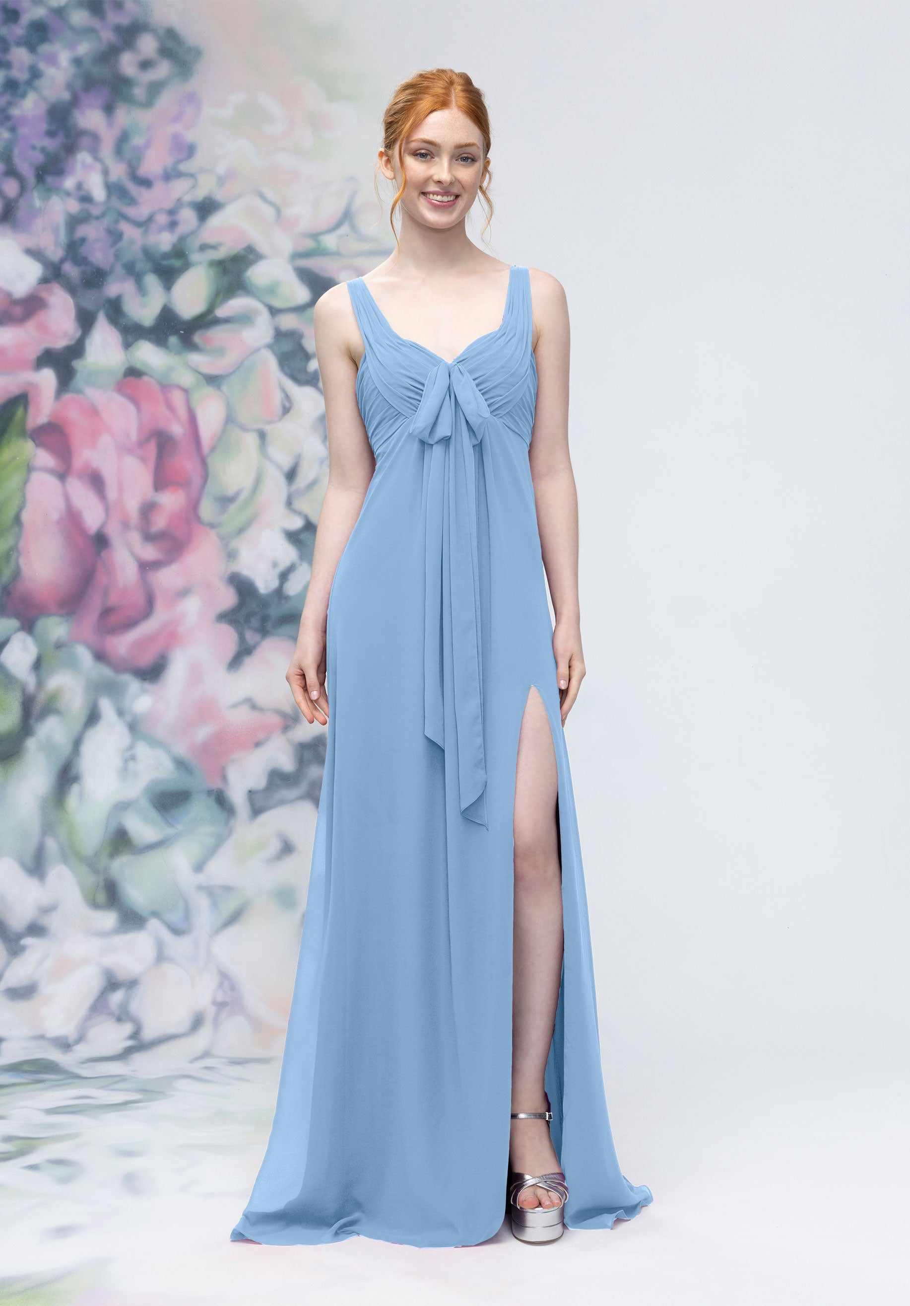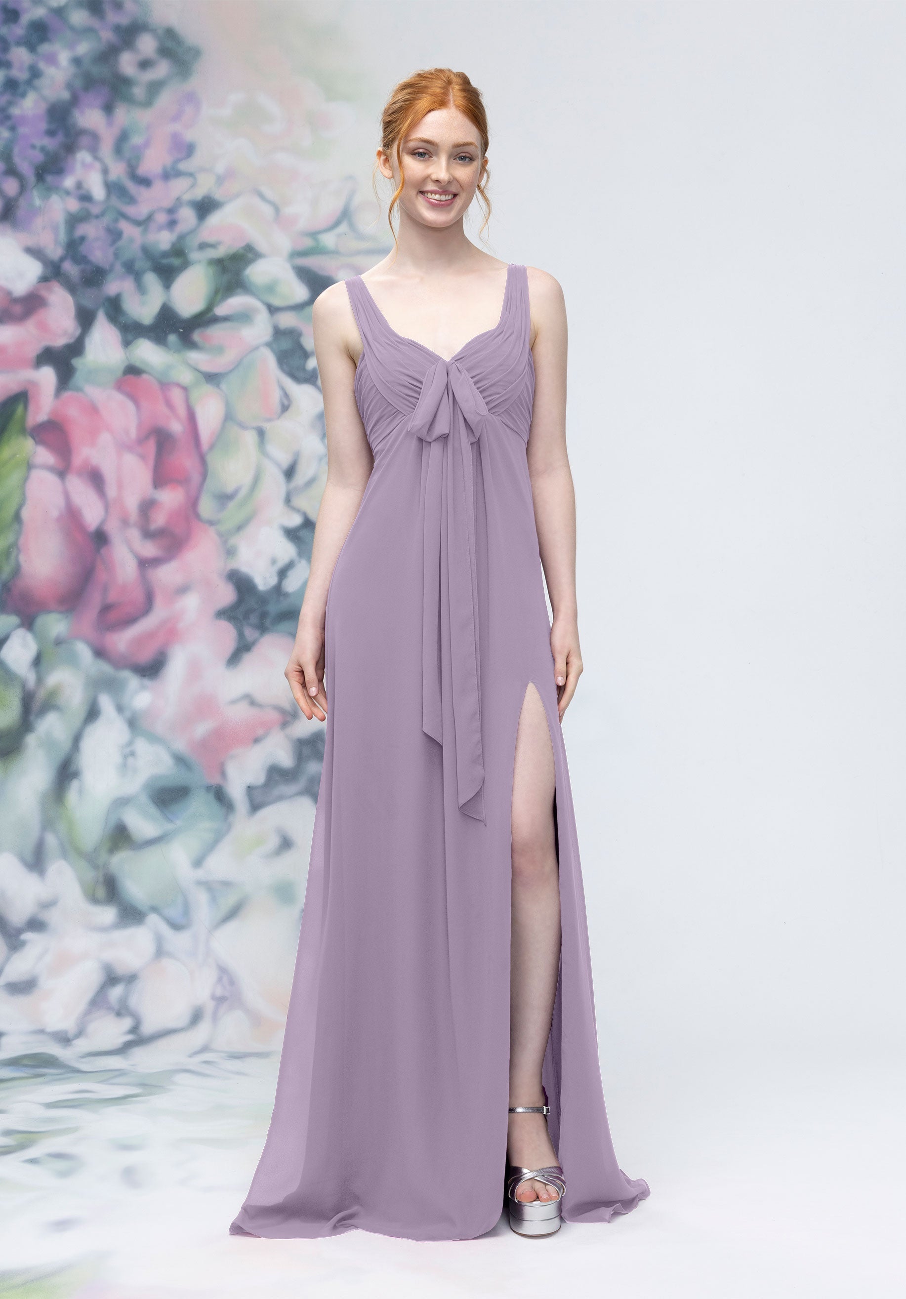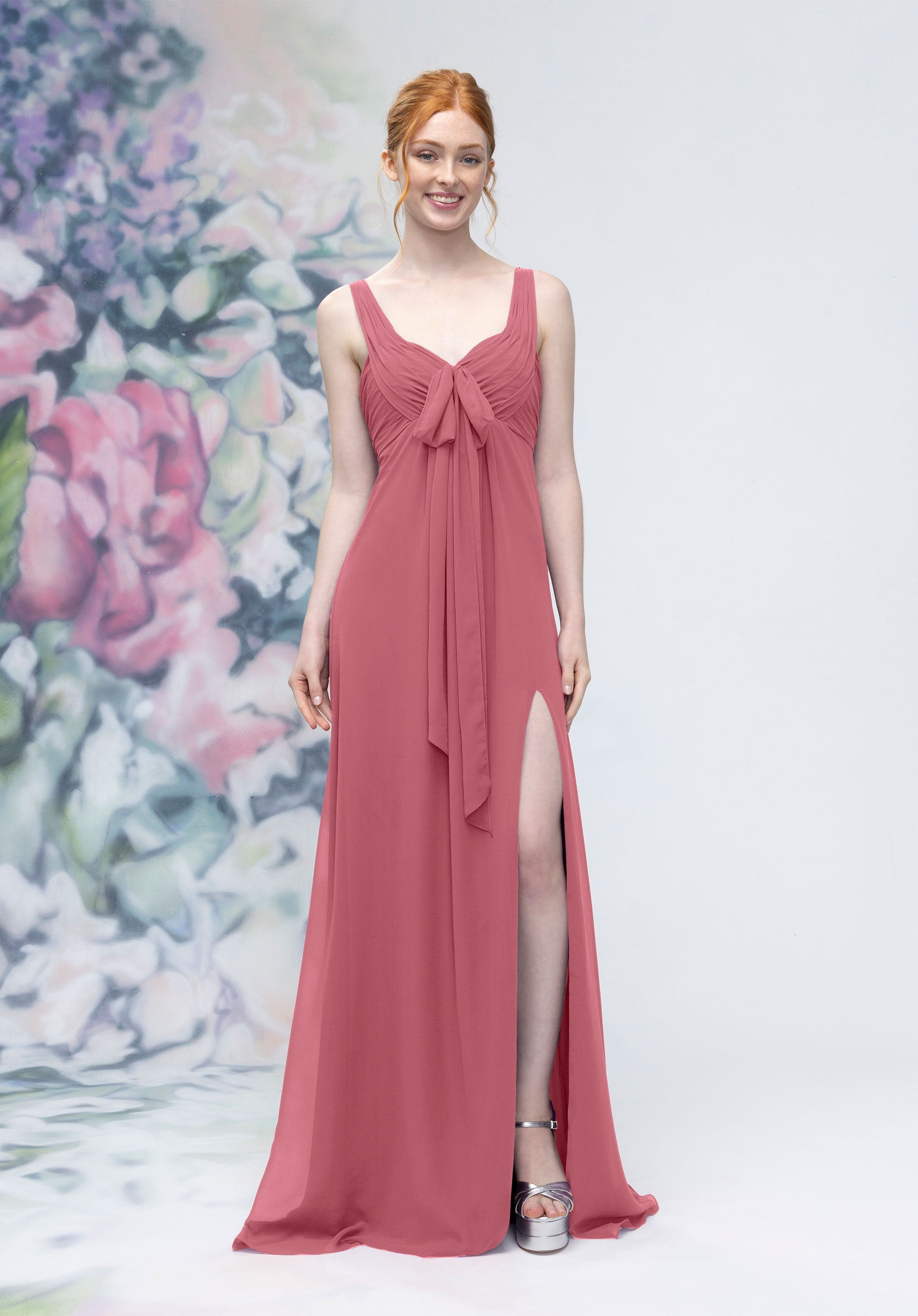 This chiffon A-line bridesmaid dress features a ruched sweetheart neckline and empire waist bodice that flatters with timeless ease. The delicate tie-bow detail and v-back straps add a touch of charm, while a subtle skirt slit brings fluidity for soft romance with graceful movement.