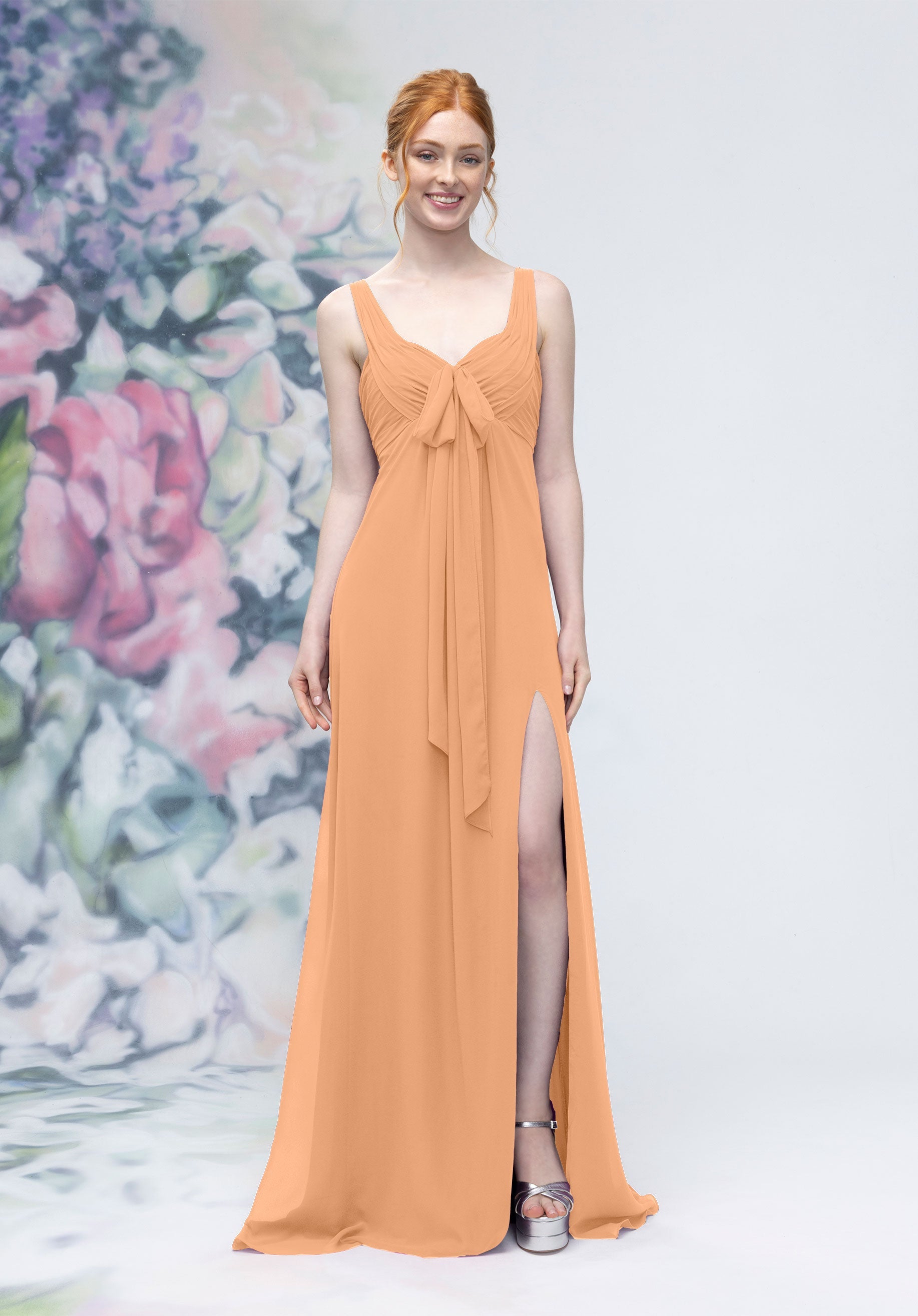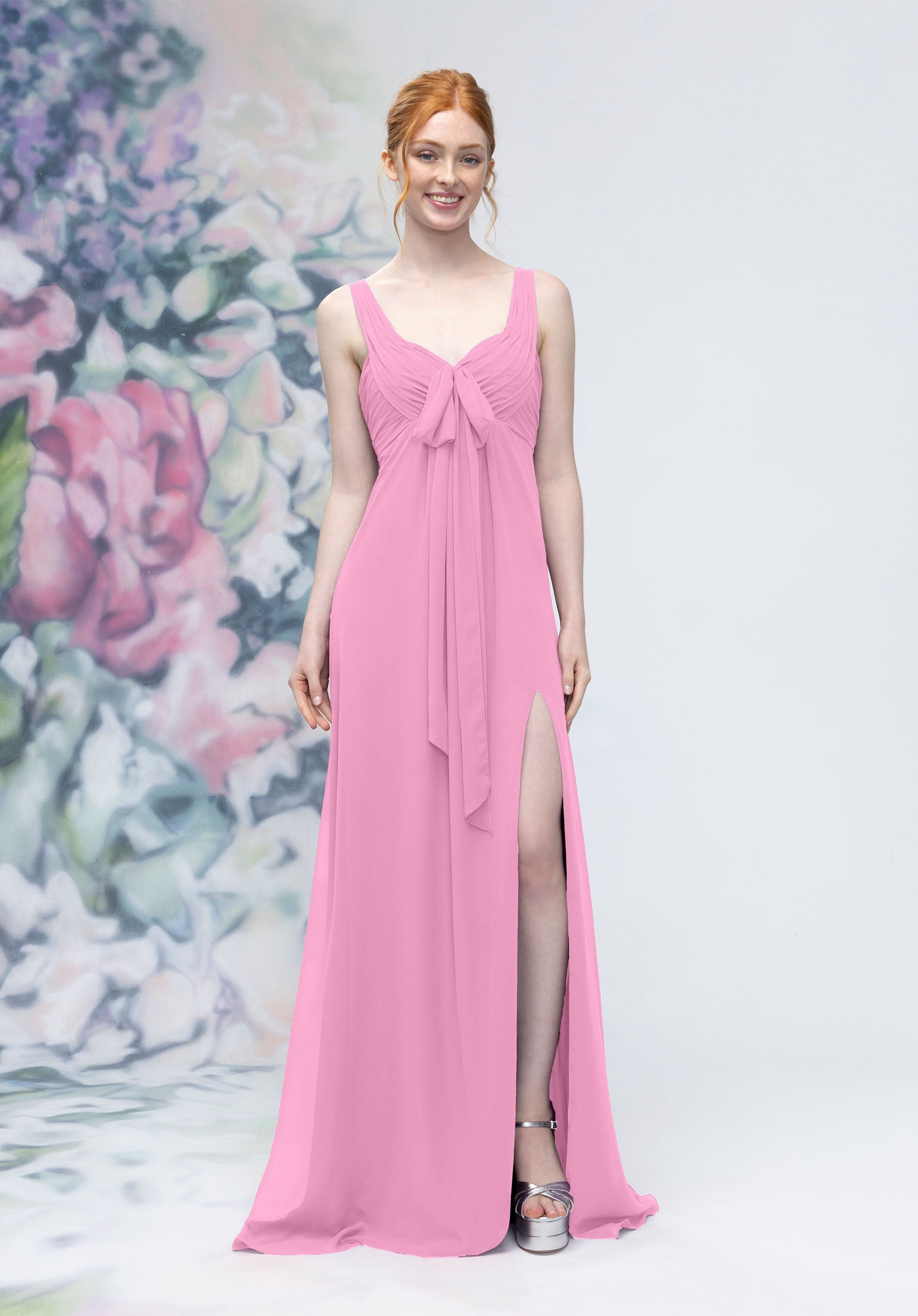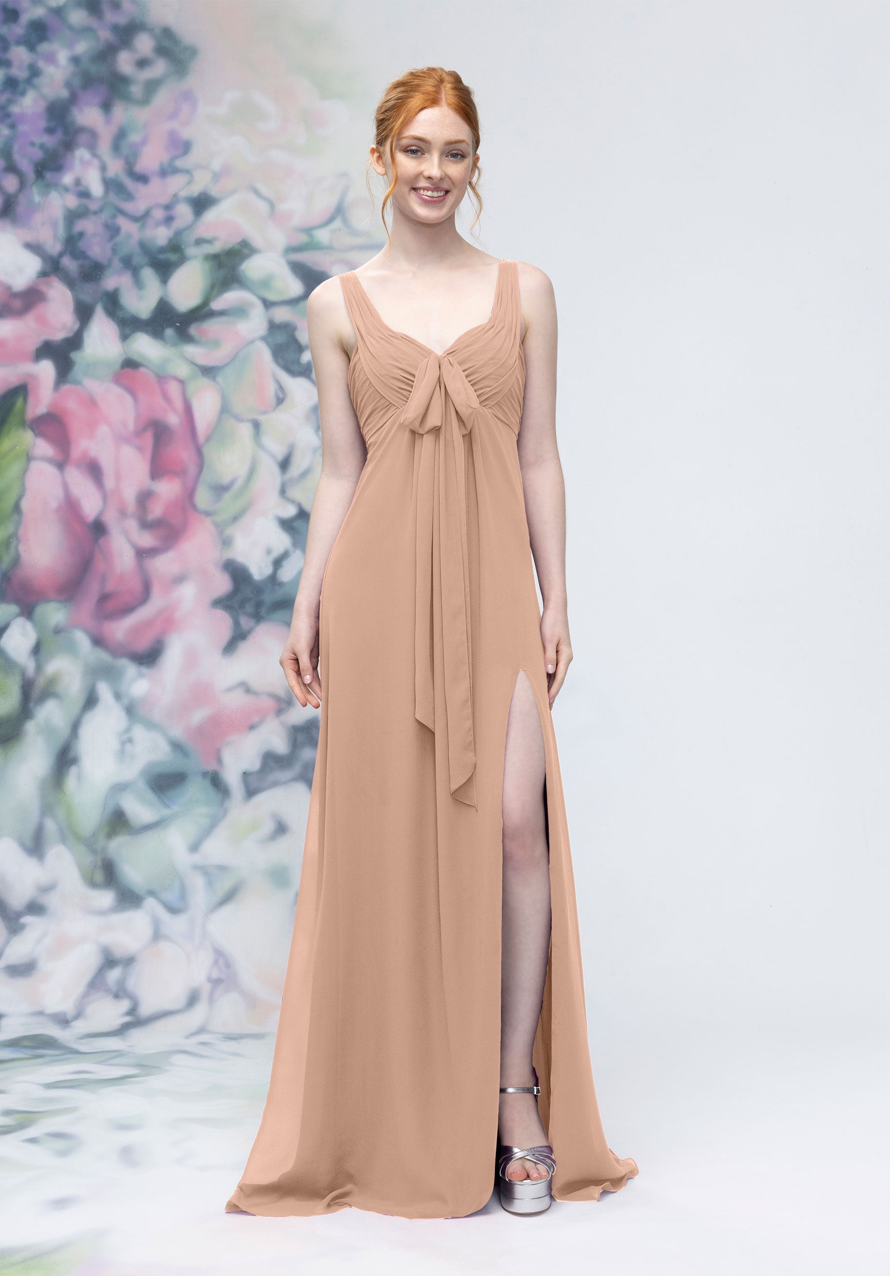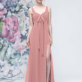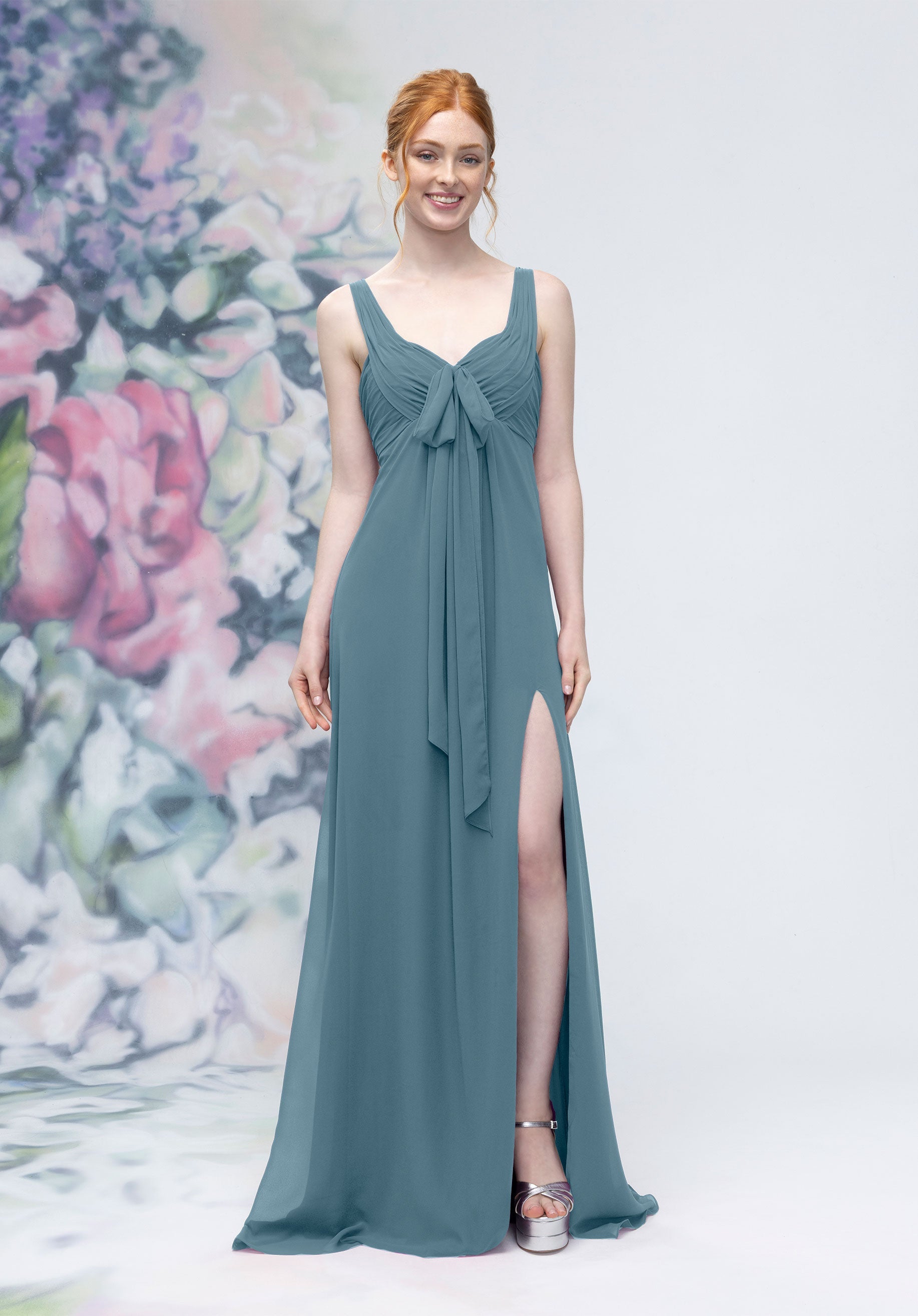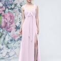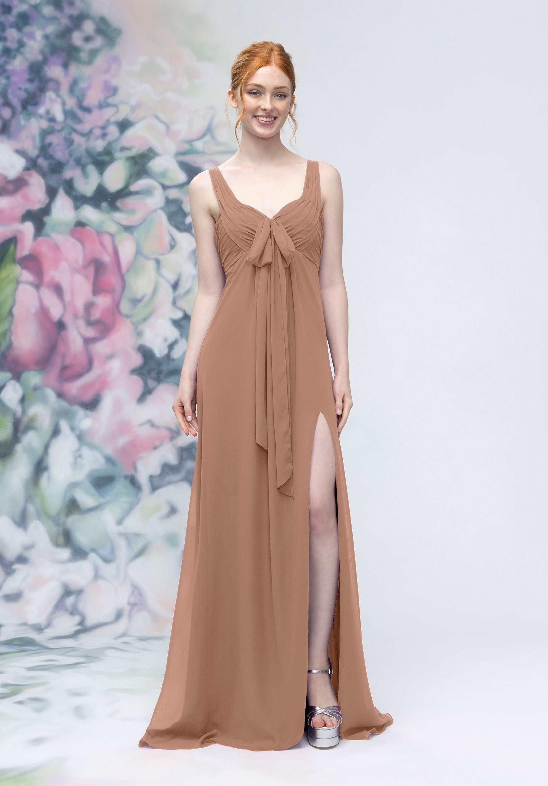 This chiffon A-line bridesmaid dress features a ruched sweetheart neckline and empire waist bodice that flatters with timeless ease. The delicate tie-bow detail and v-back straps add a touch of charm, while a subtle skirt slit brings fluidity for soft romance with graceful movement.