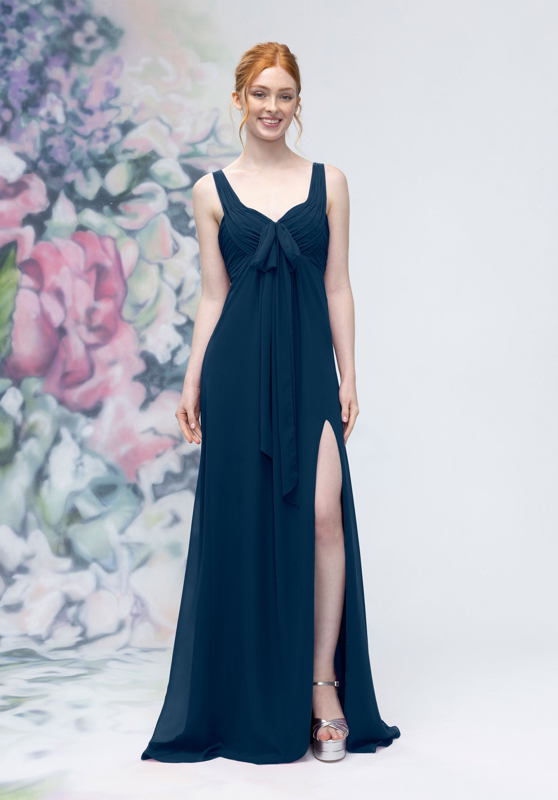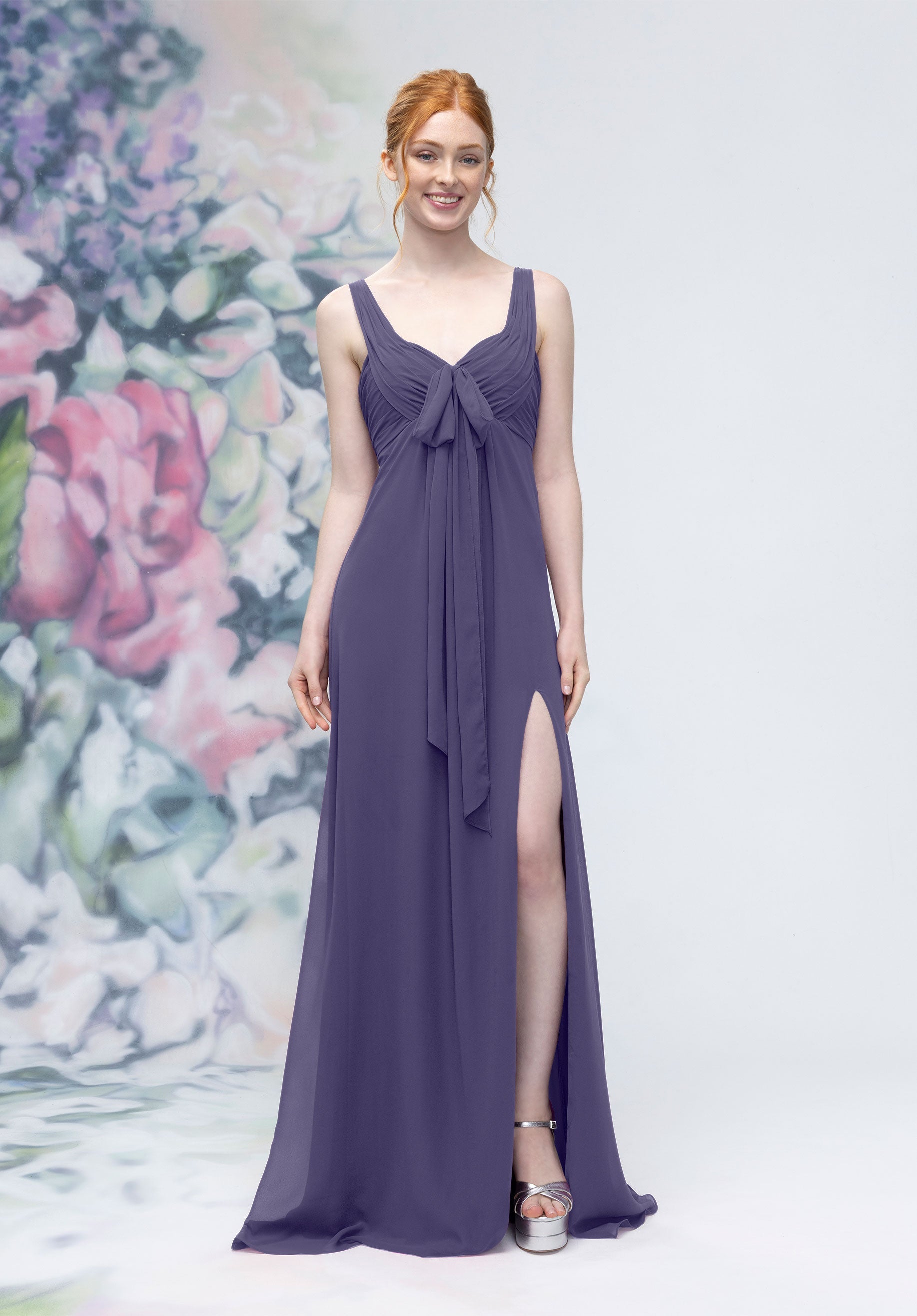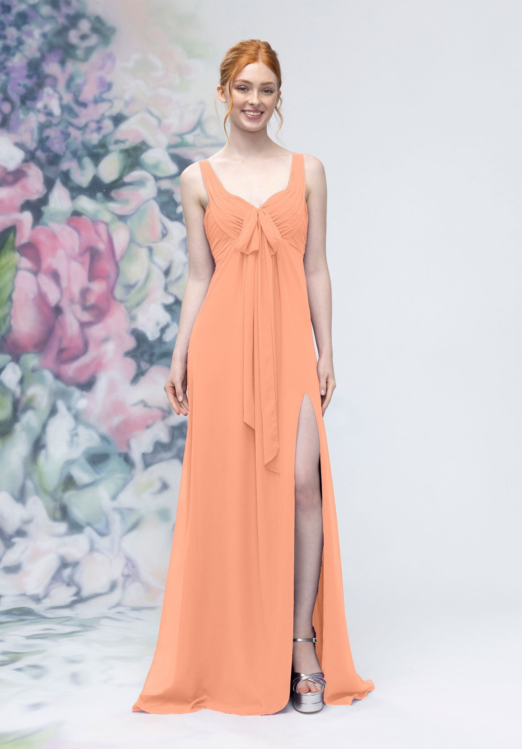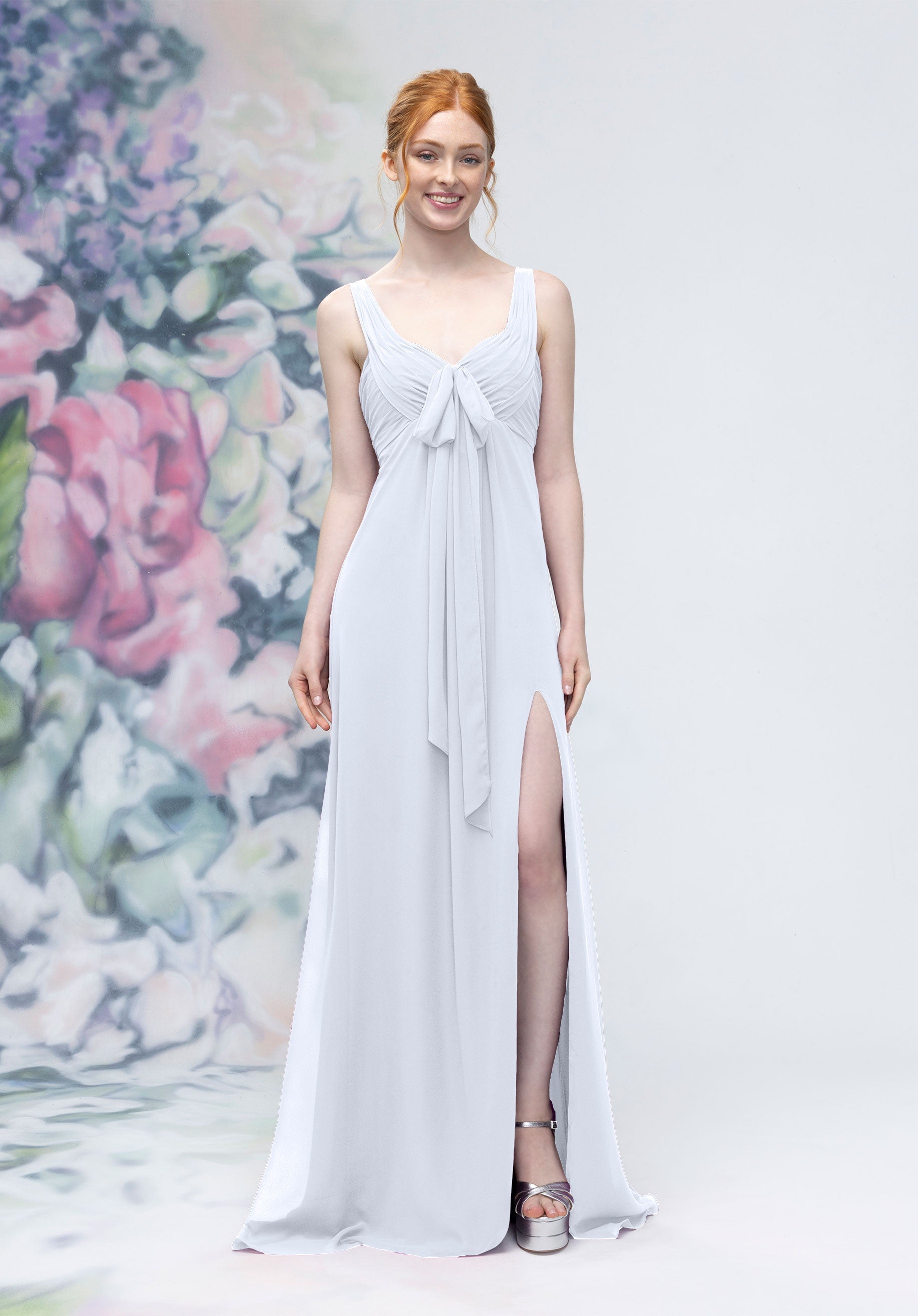 This chiffon A-line bridesmaid dress features a ruched sweetheart neckline and empire waist bodice that flatters with timeless ease. The delicate tie-bow detail and v-back straps add a touch of charm, while a subtle skirt slit brings fluidity for soft romance with graceful movement.