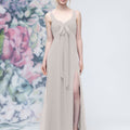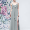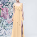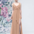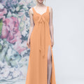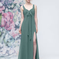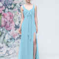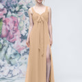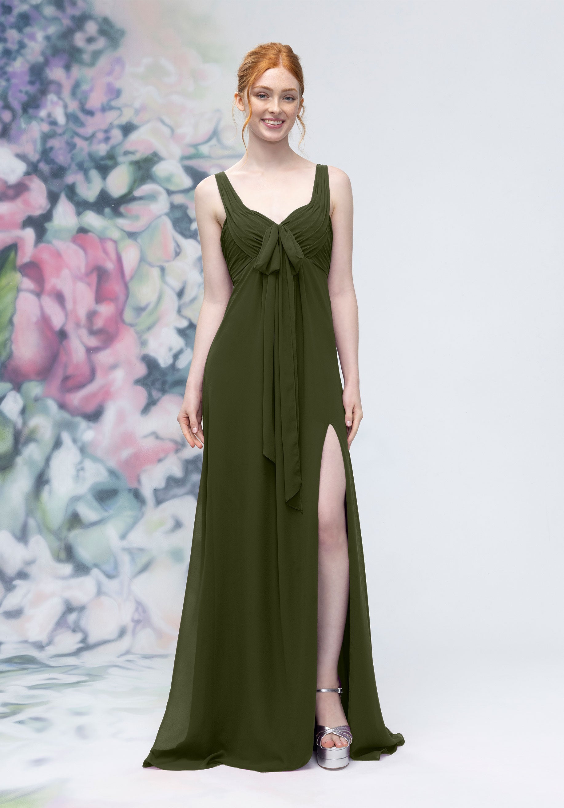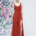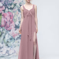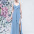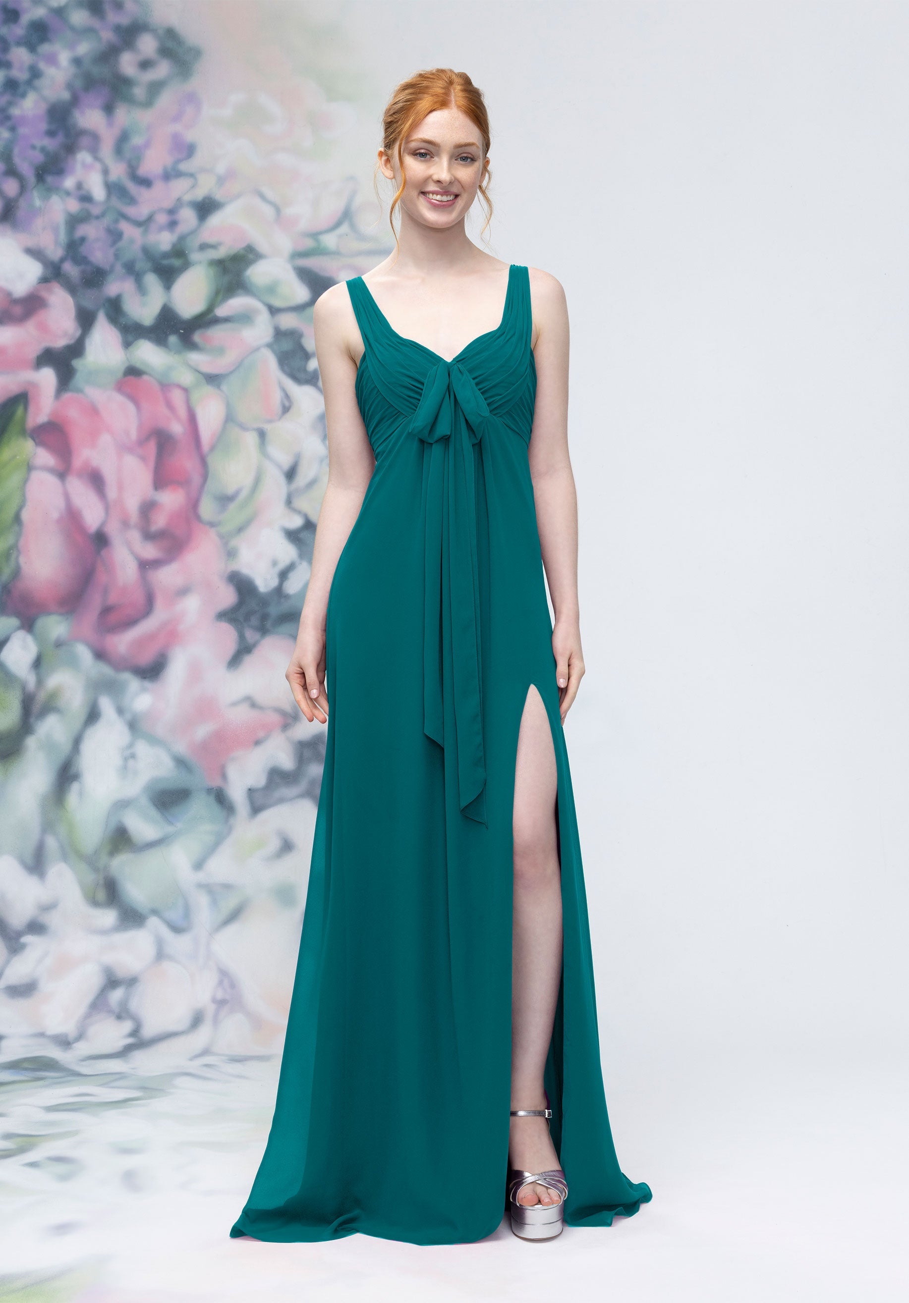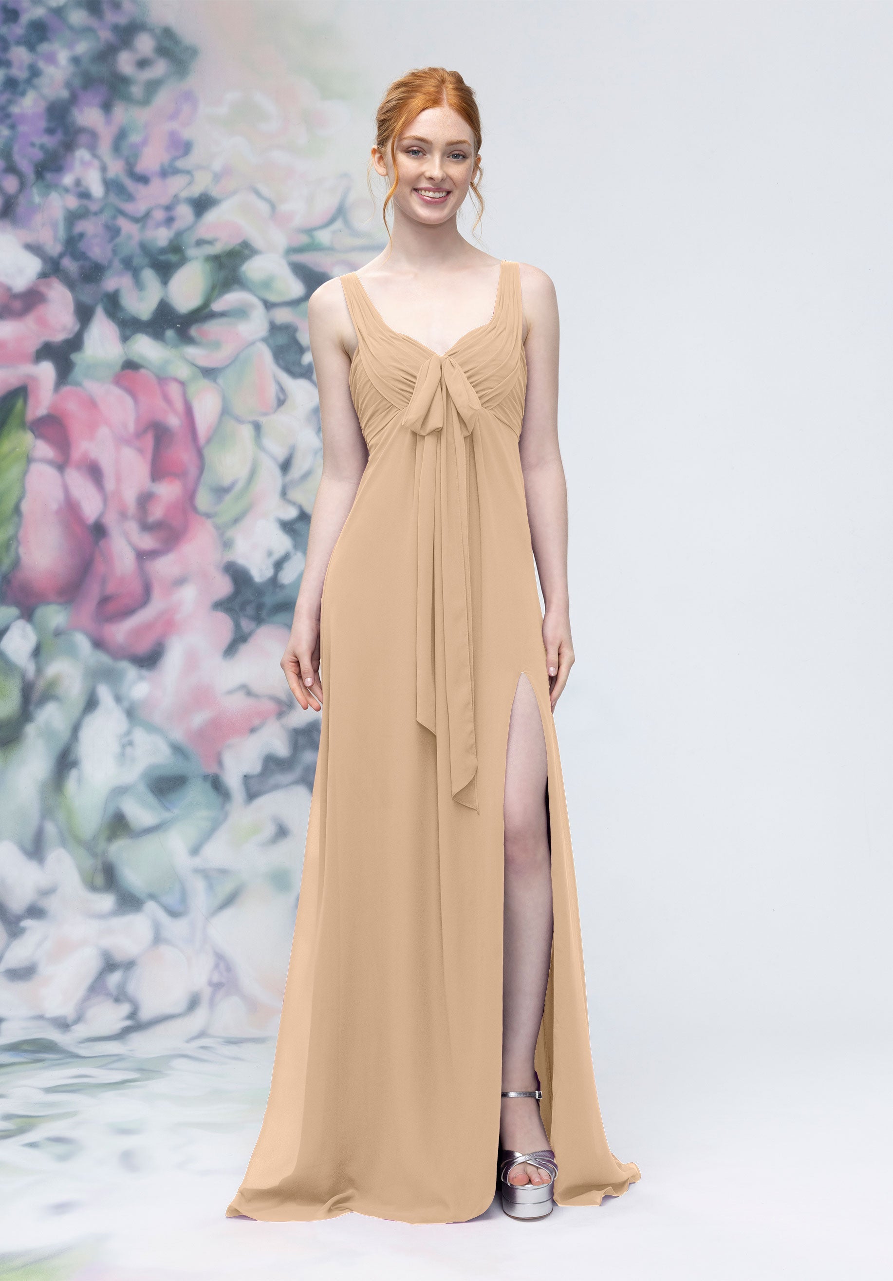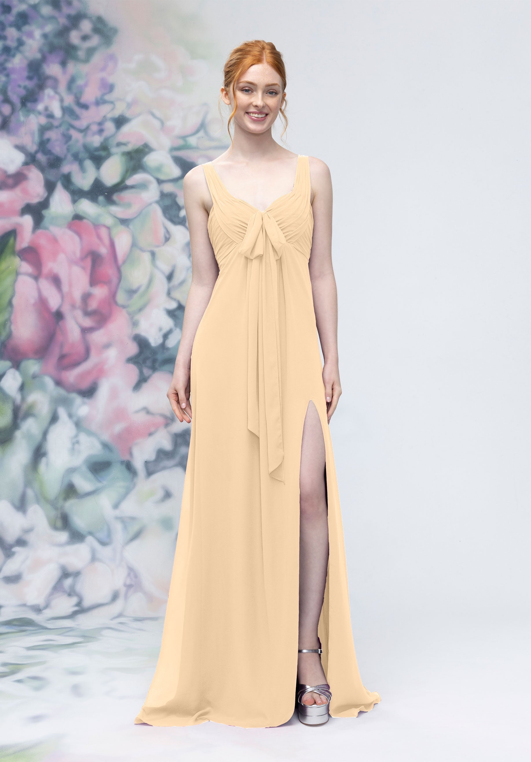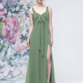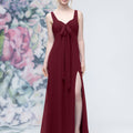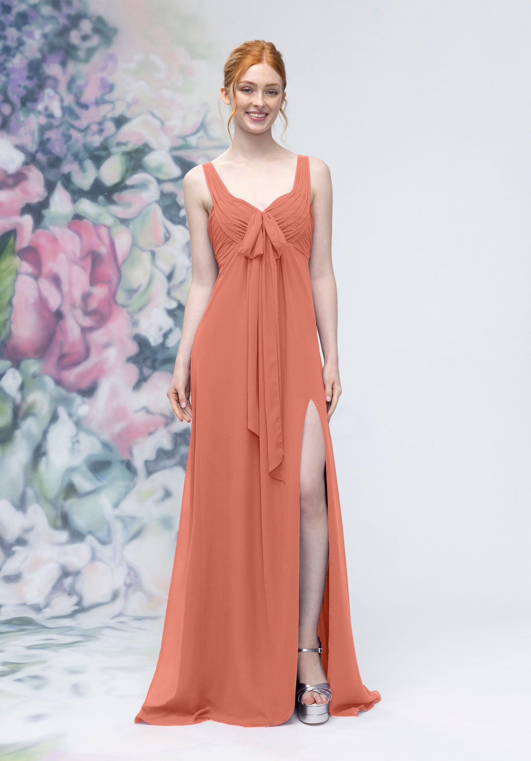 This chiffon A-line bridesmaid dress features a ruched sweetheart neckline and empire waist bodice that flatters with timeless ease. The delicate tie-bow detail and v-back straps add a touch of charm, while a subtle skirt slit brings fluidity for soft romance with graceful movement.