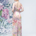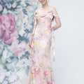 This bias-cut bridesmaid dress features a soft scoop neckline with a delicate cowl detail and a draped cowl back that falls effortlessly. Cold-shoulder straps are accented by cascading ruffle bows, adding a romantic, airy finish. Designed in floral printed chiffon, it's a modern ethereal gown with graceful movement.