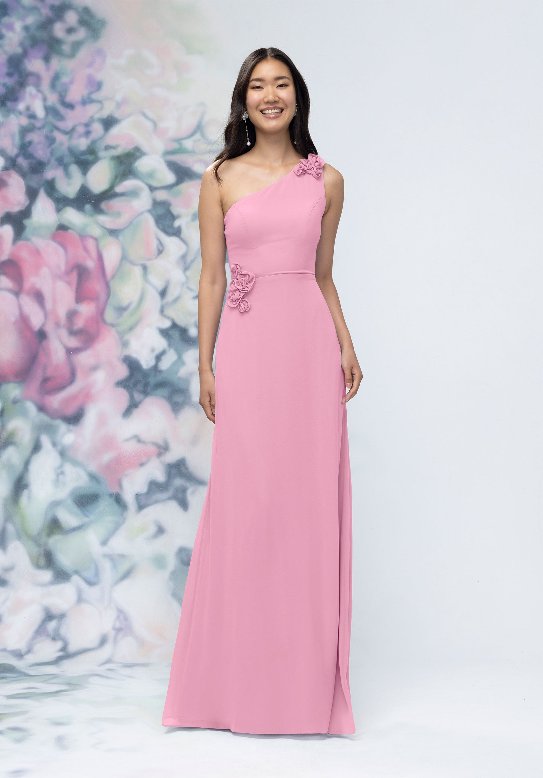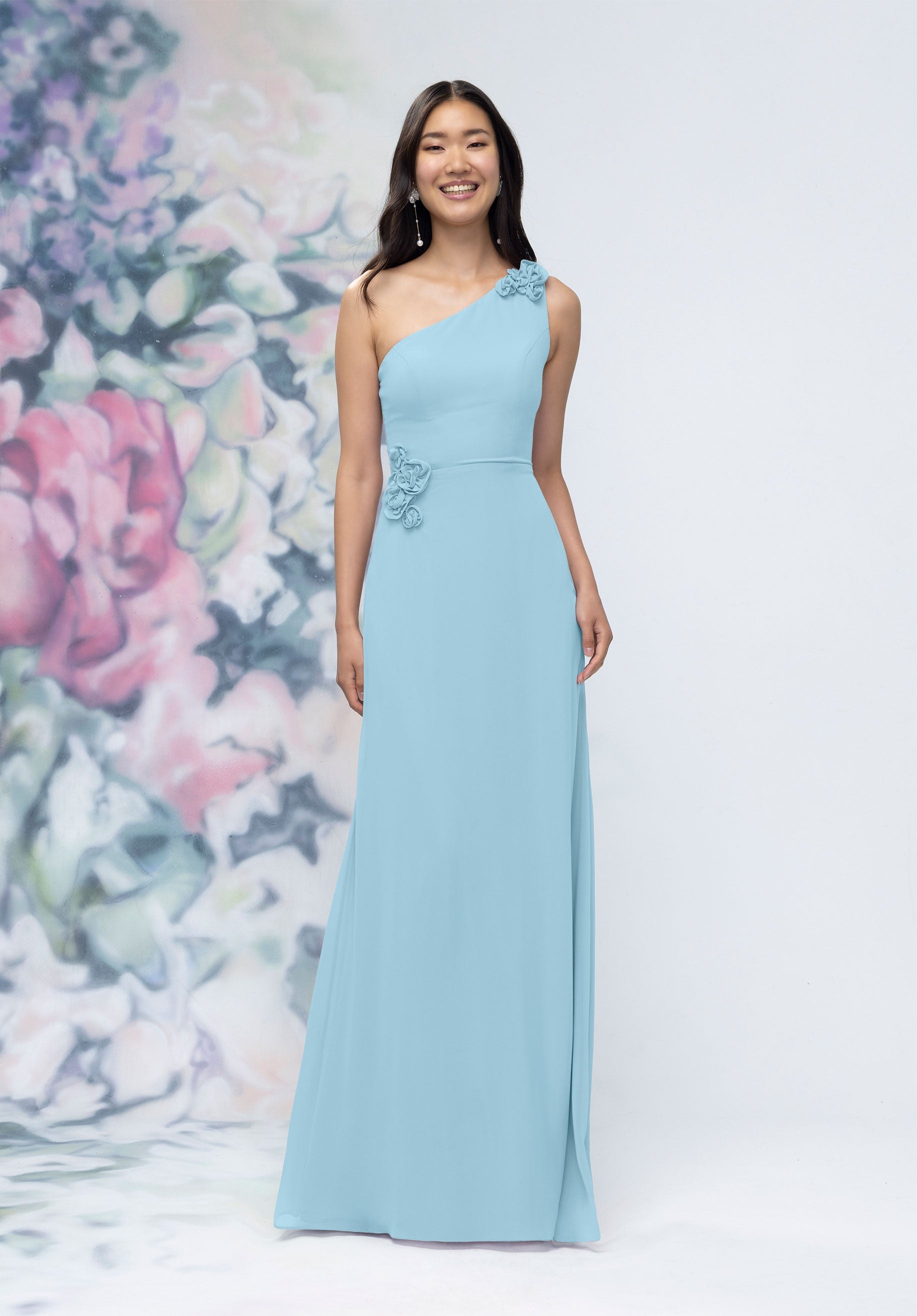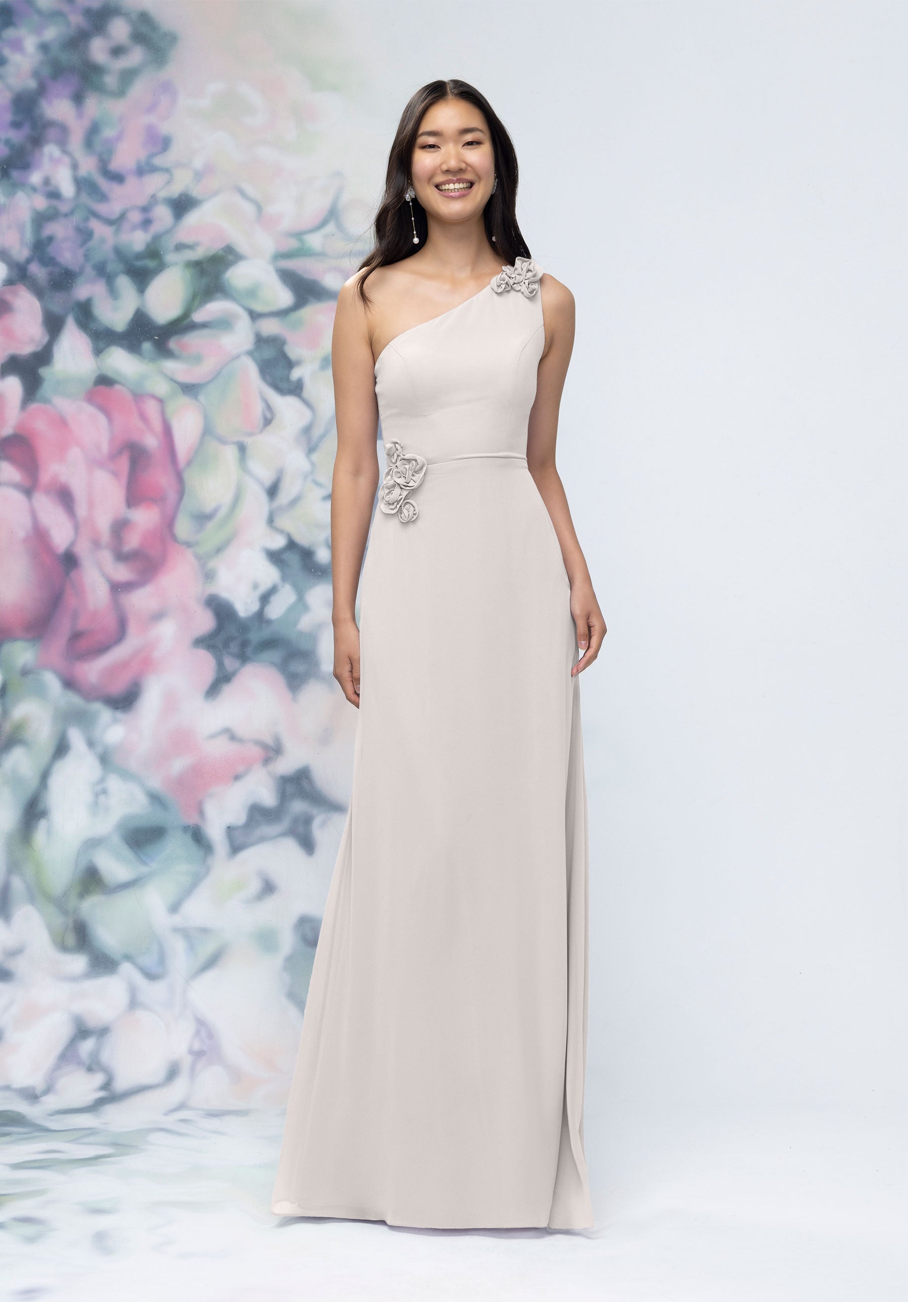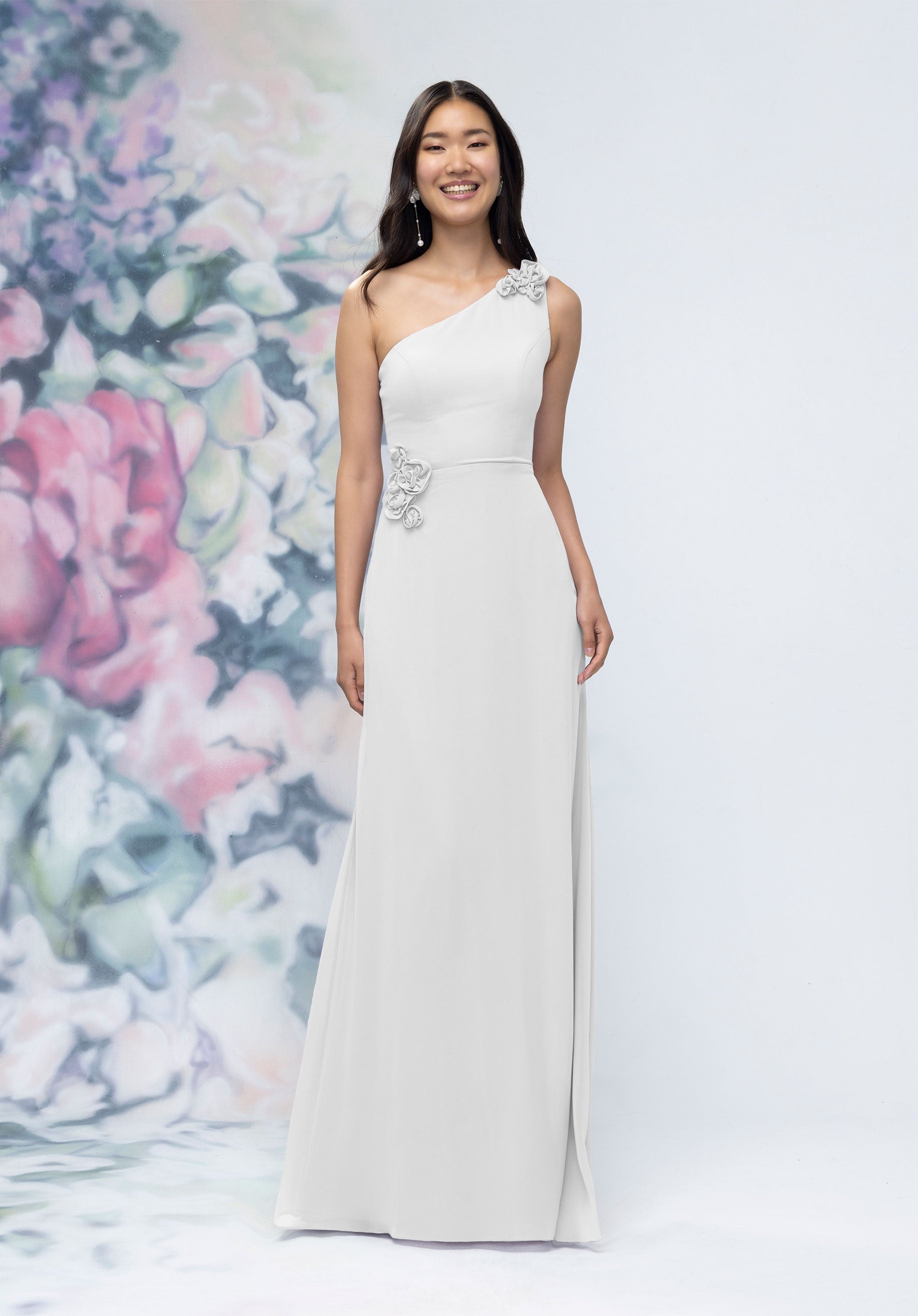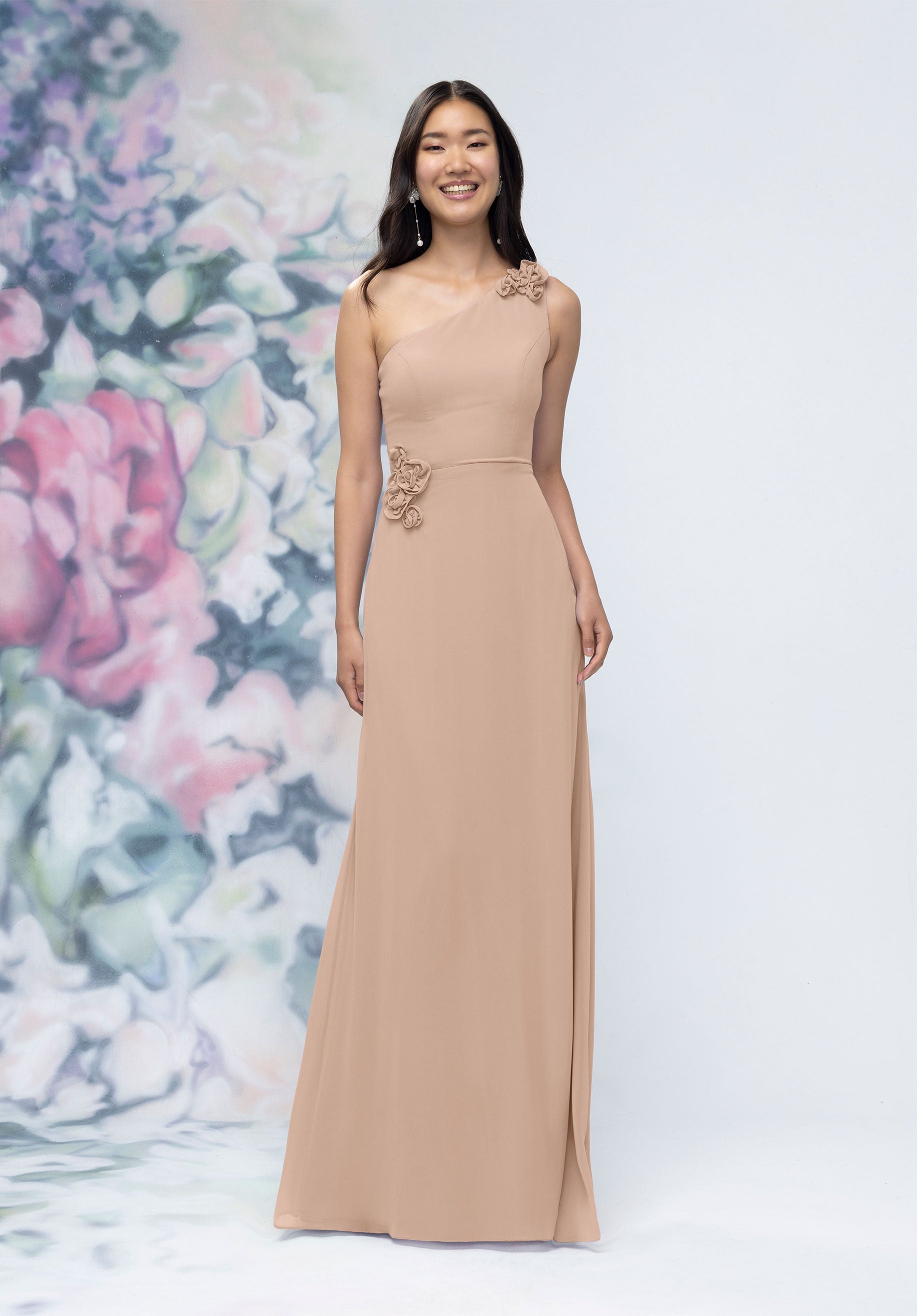 This chiffon bridesmaid dress features a striking one-shoulder neckline adorned with abstract 3D floral accents at the shoulder and waist, creating a flattering, sculpted silhouette. Sleek and sophisticated the sheath gown is perfect for those who love chic design with an artistic flair.