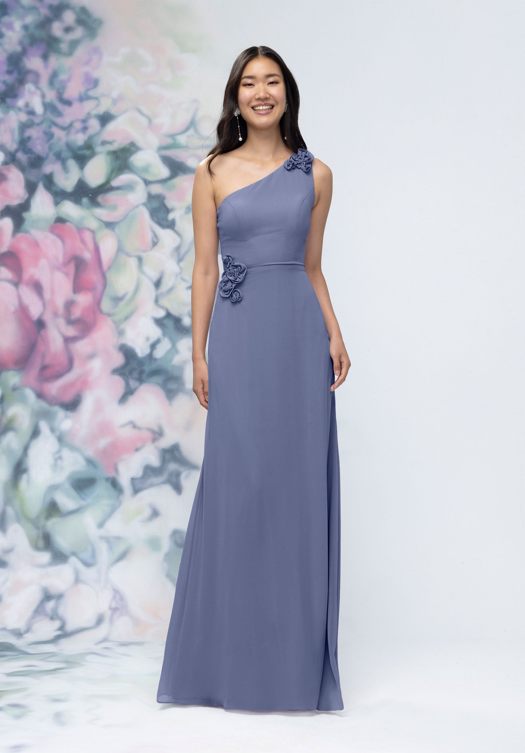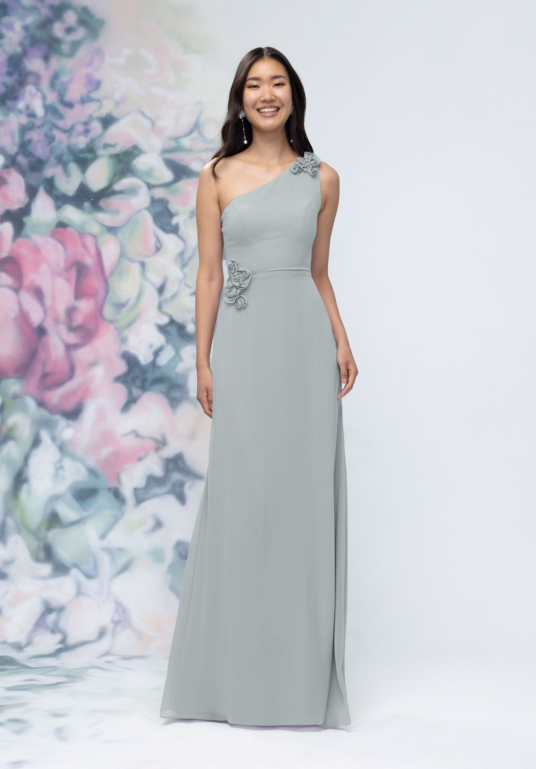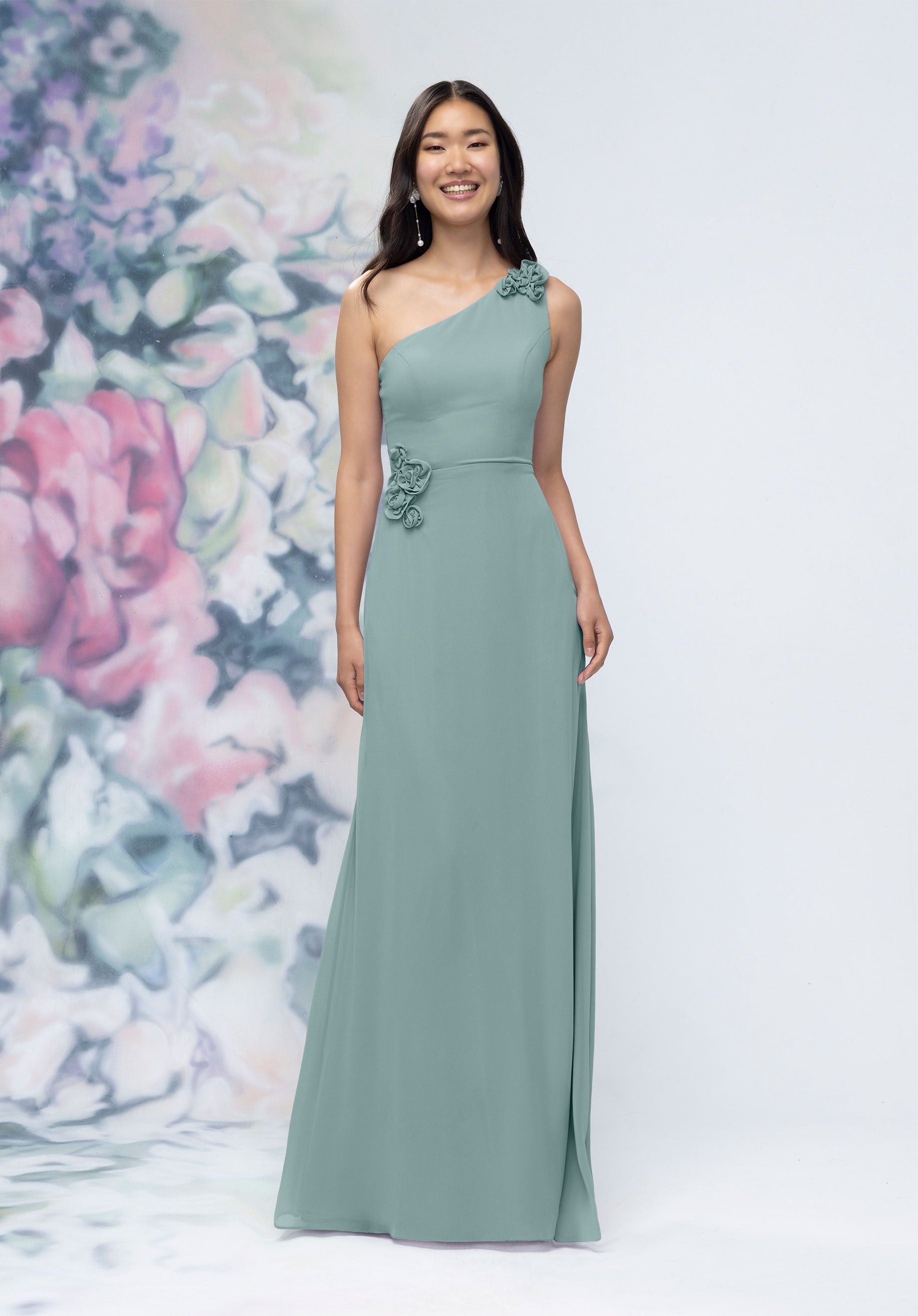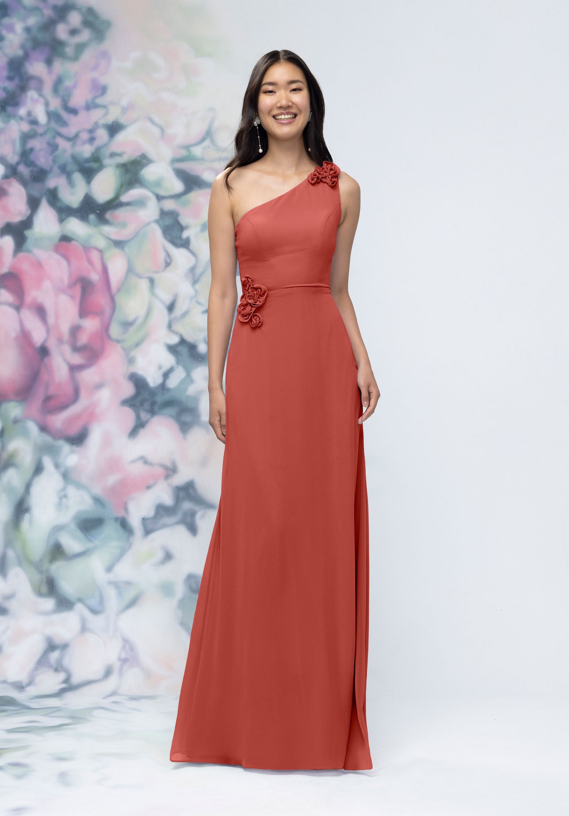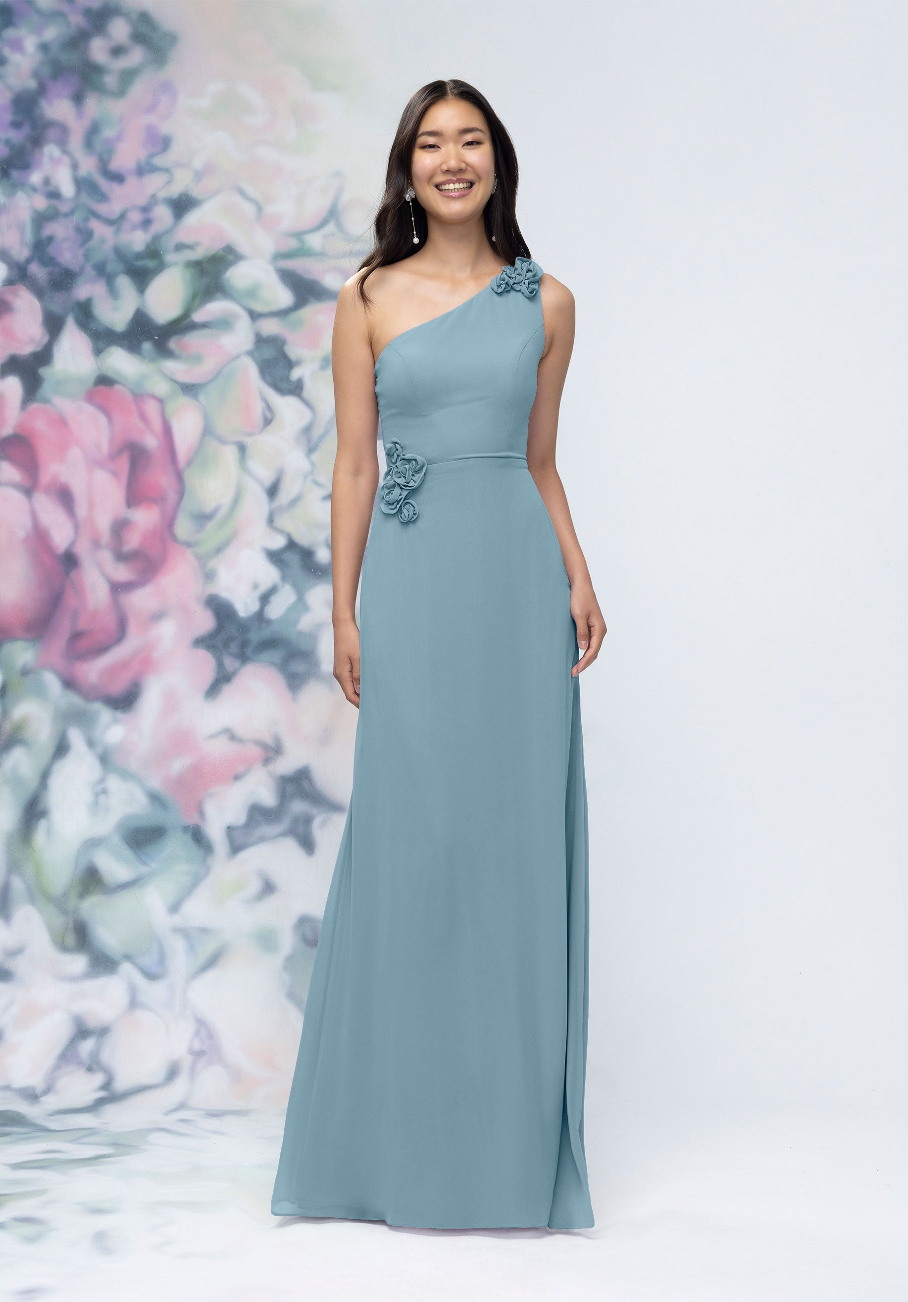 This chiffon bridesmaid dress features a striking one-shoulder neckline adorned with abstract 3D floral accents at the shoulder and waist, creating a flattering, sculpted silhouette. Sleek and sophisticated the sheath gown is perfect for those who love chic design with an artistic flair.