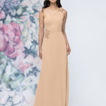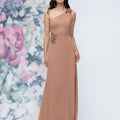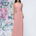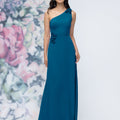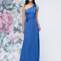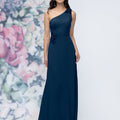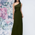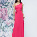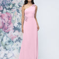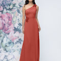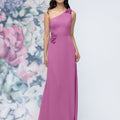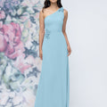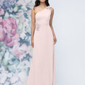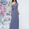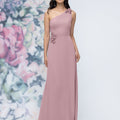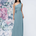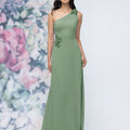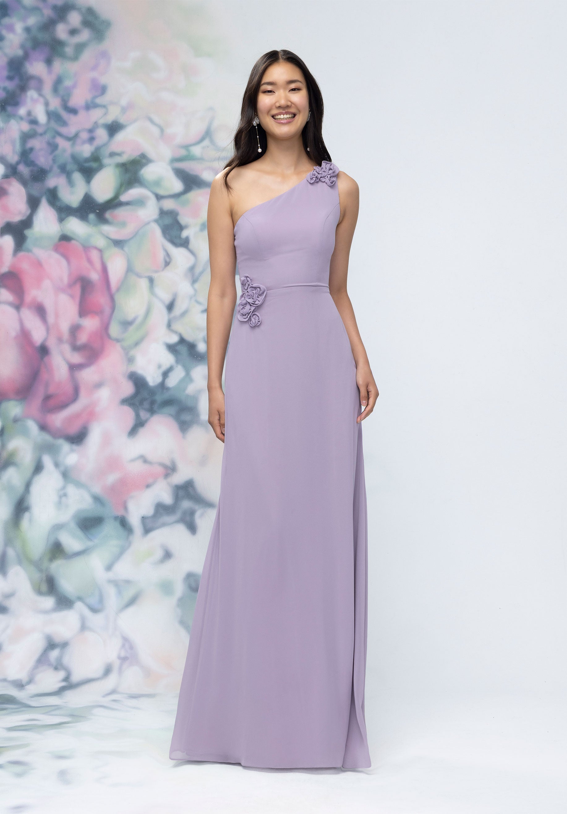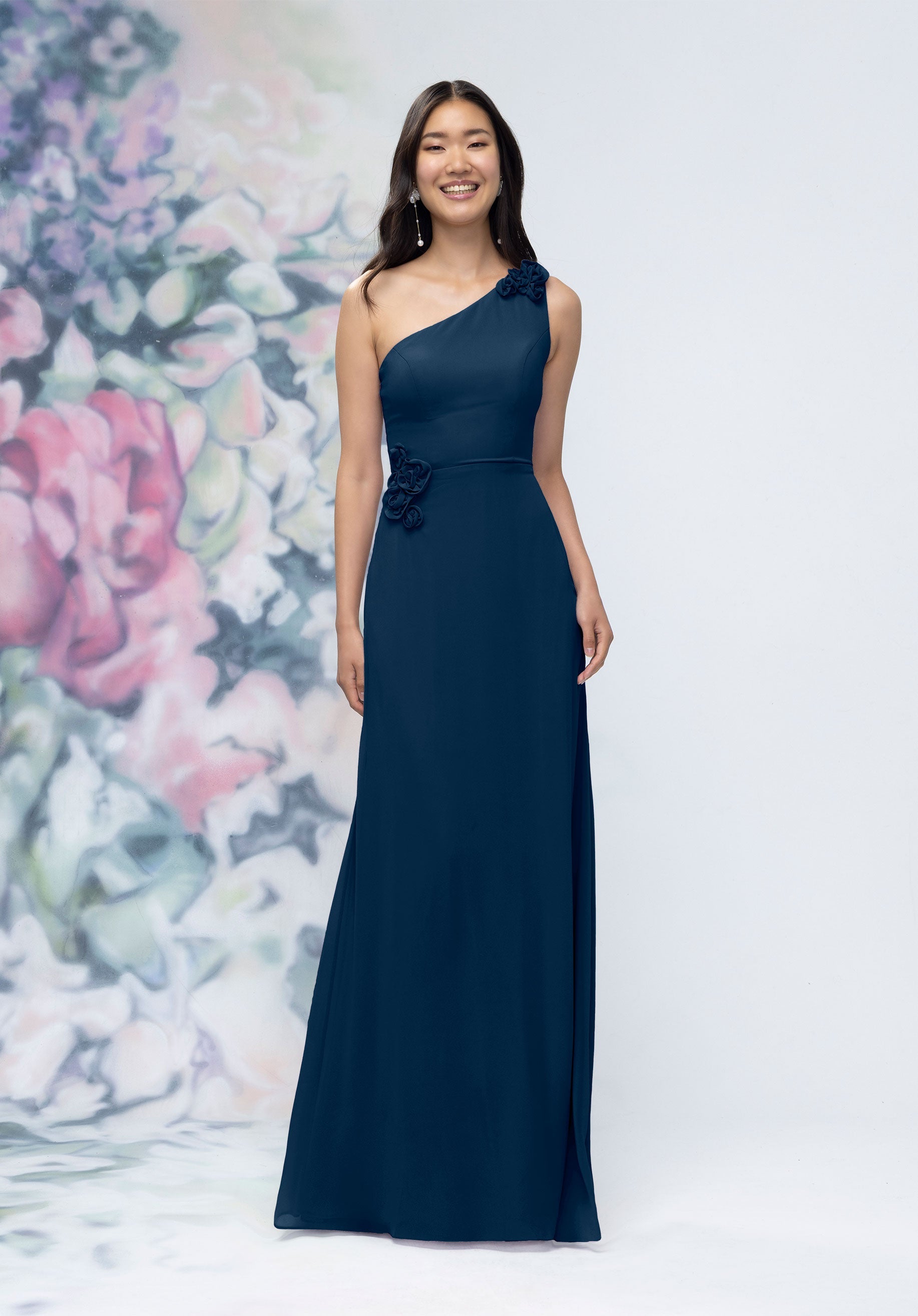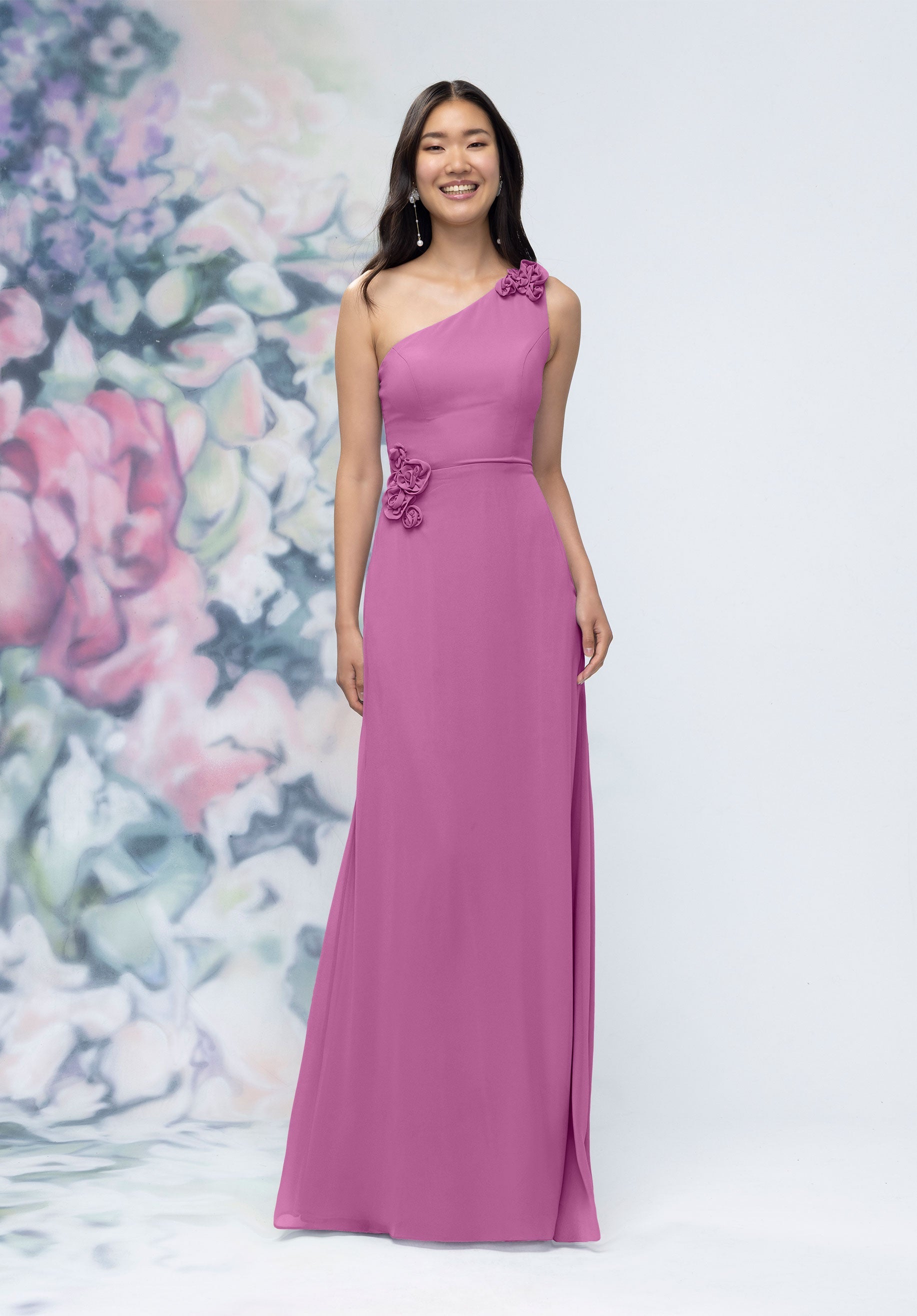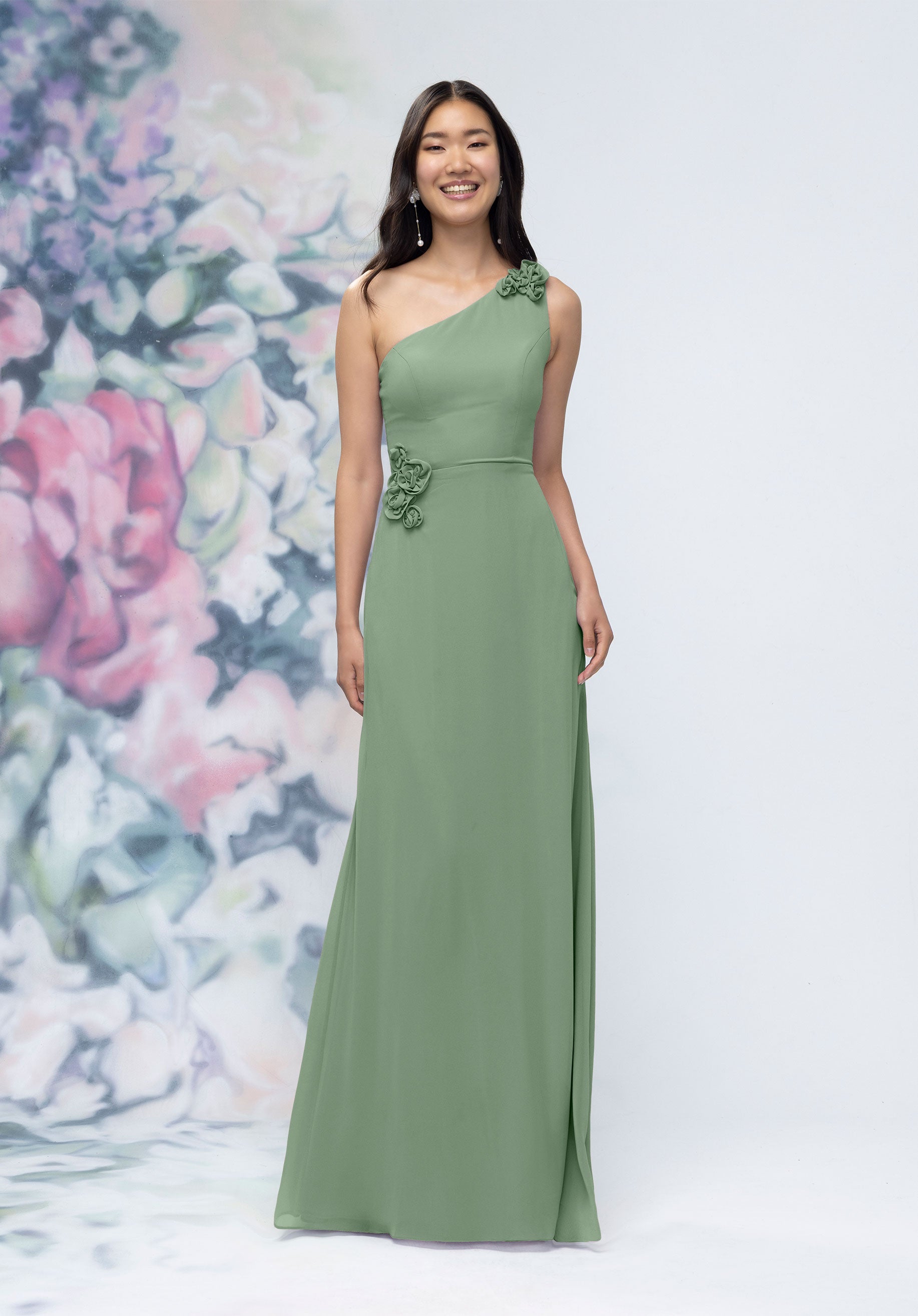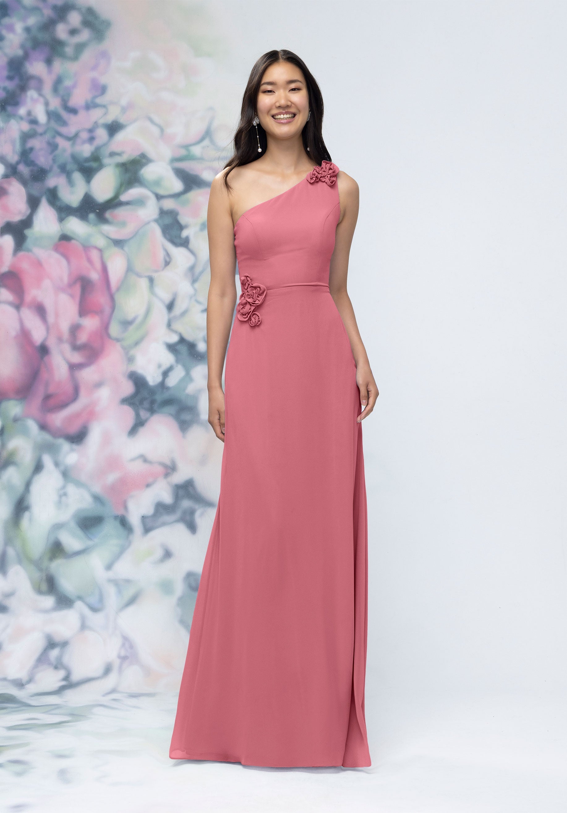 This chiffon bridesmaid dress features a striking one-shoulder neckline adorned with abstract 3D floral accents at the shoulder and waist, creating a flattering, sculpted silhouette. Sleek and sophisticated the sheath gown is perfect for those who love chic design with an artistic flair.