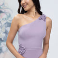 Sheath bridesmaid dress has a one-shoulder neckline with abstract 3D floral details at the shoulder and waist in chiffon.