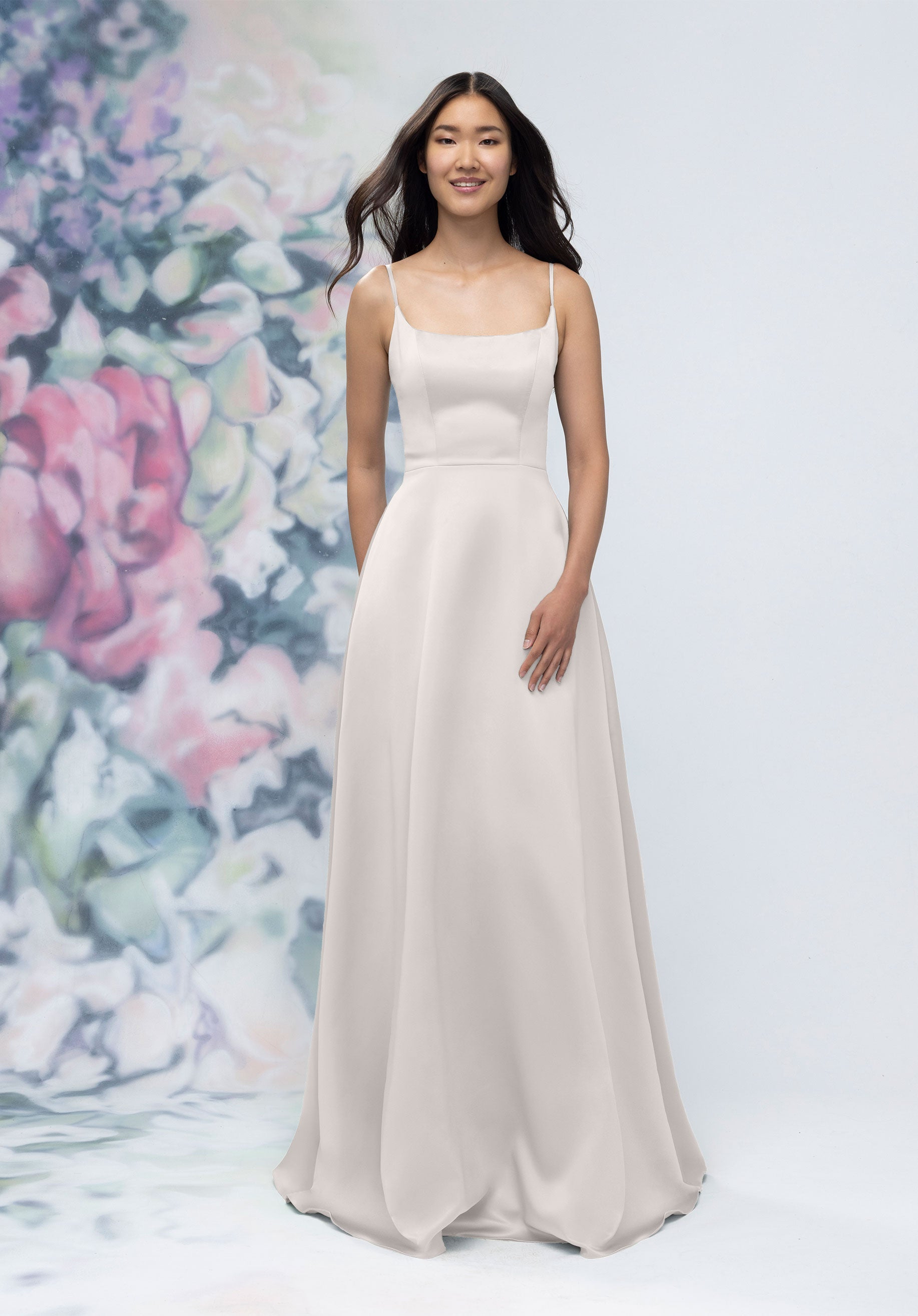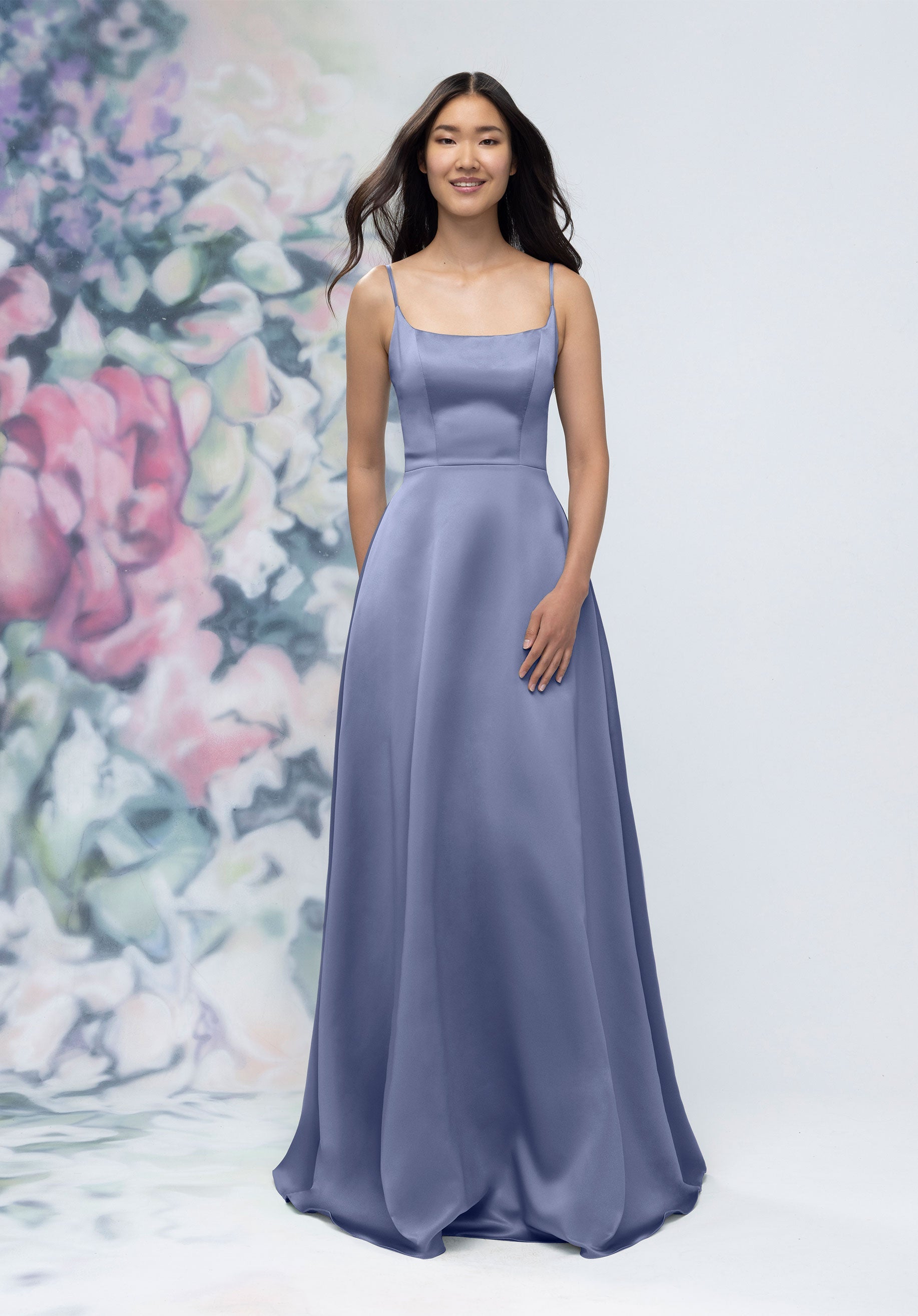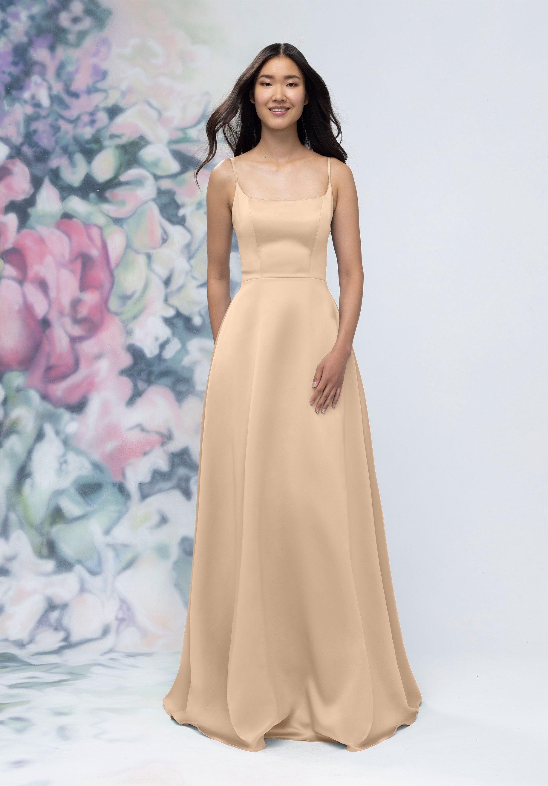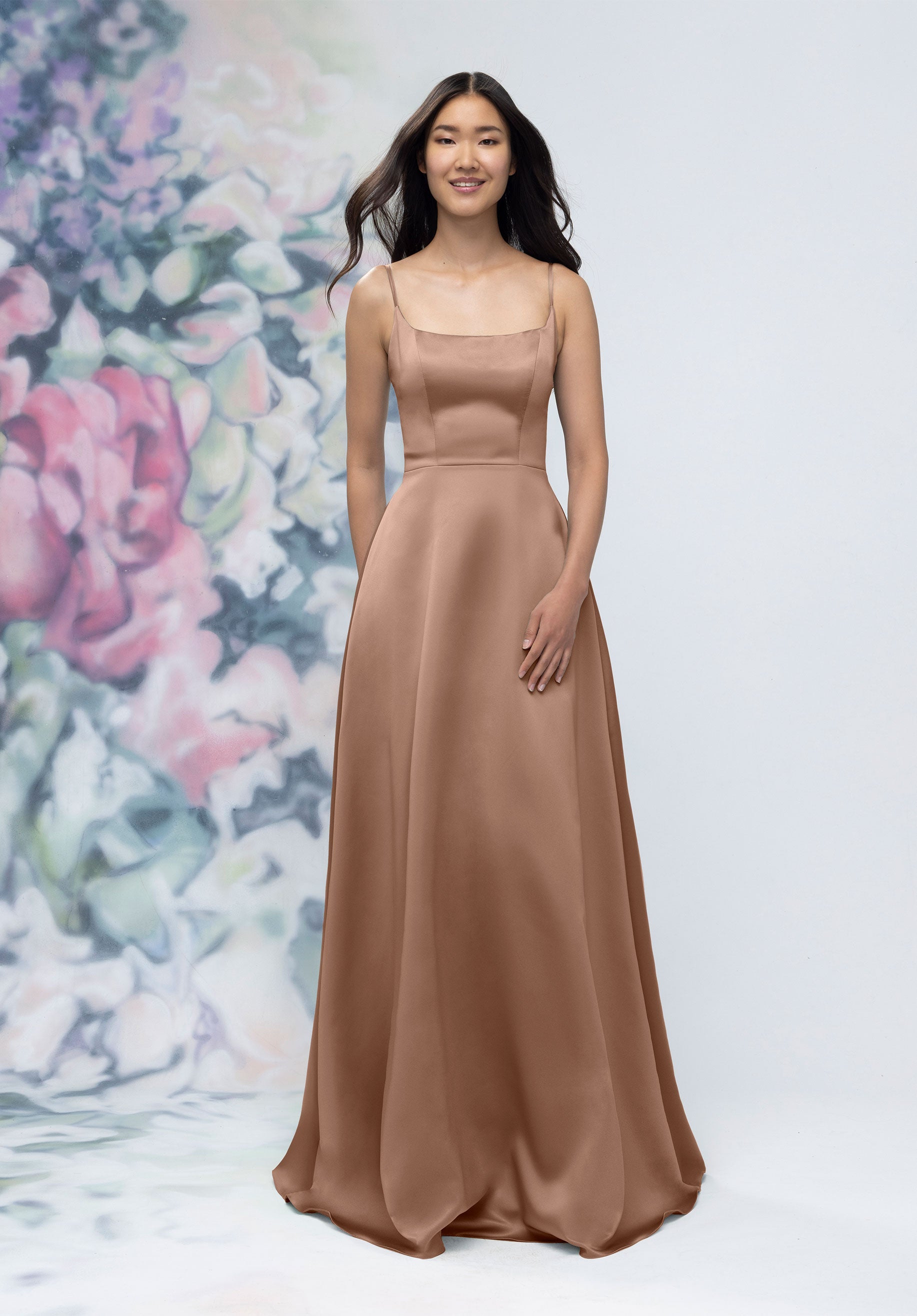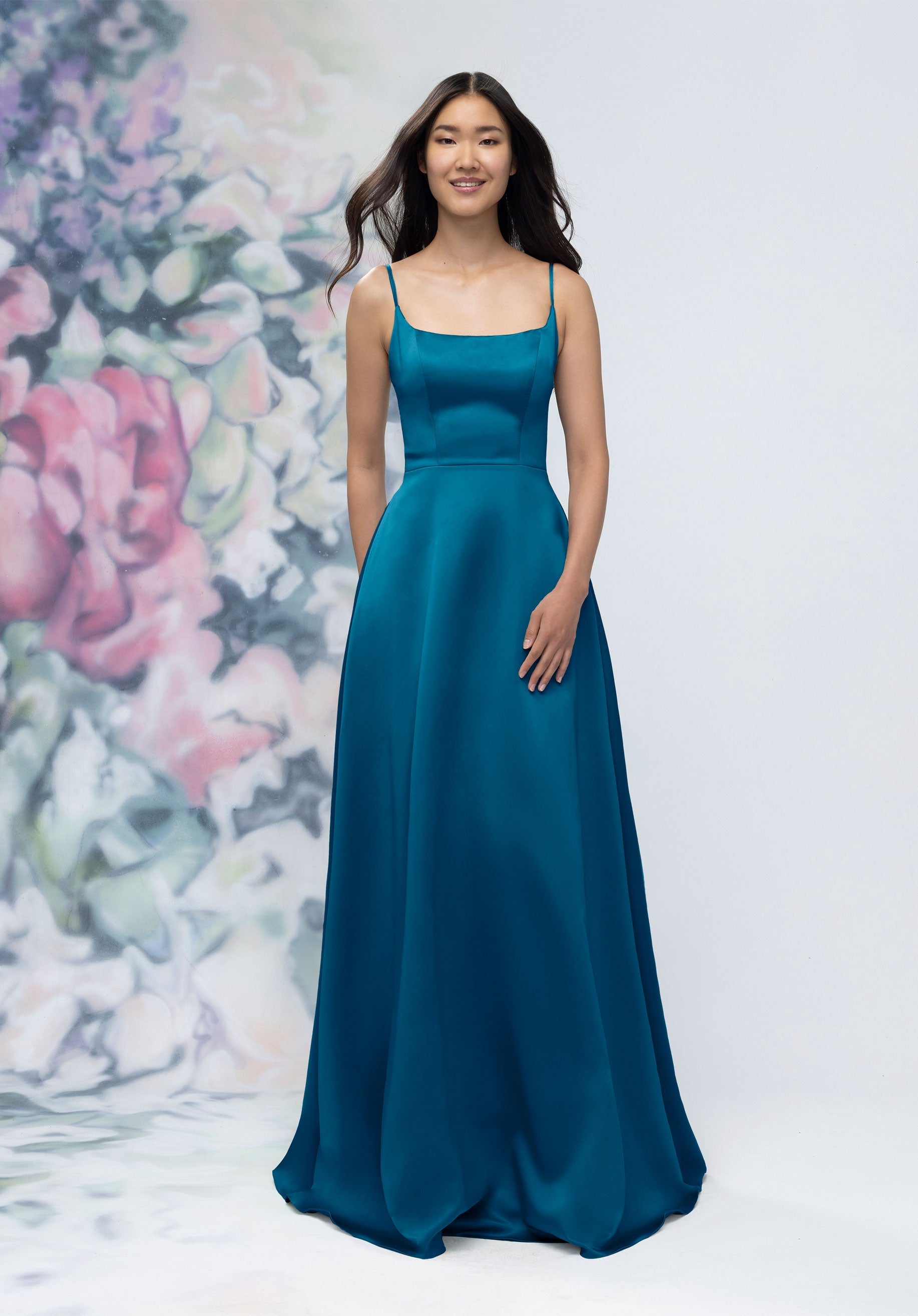 This satin A-line bridesmaid dress features a soft scoop neckline and delicate thin straps for a clean, effortless look. Contoured bodice seams sculpt the silhouette, while a lace-up corset back adds a romantic, customizable finish. Perfect for bridesmaids who love classic style with contemporary detailing.