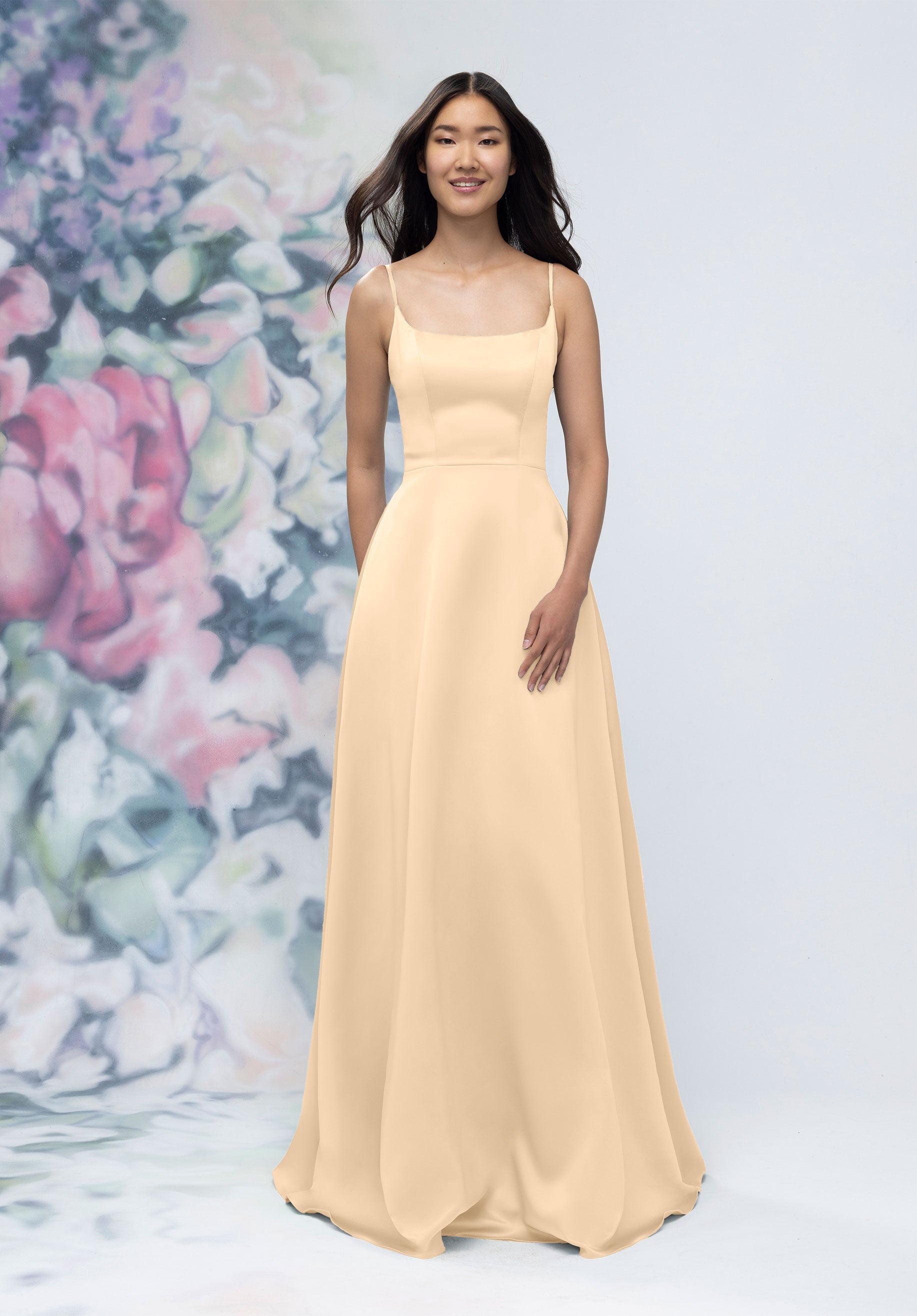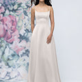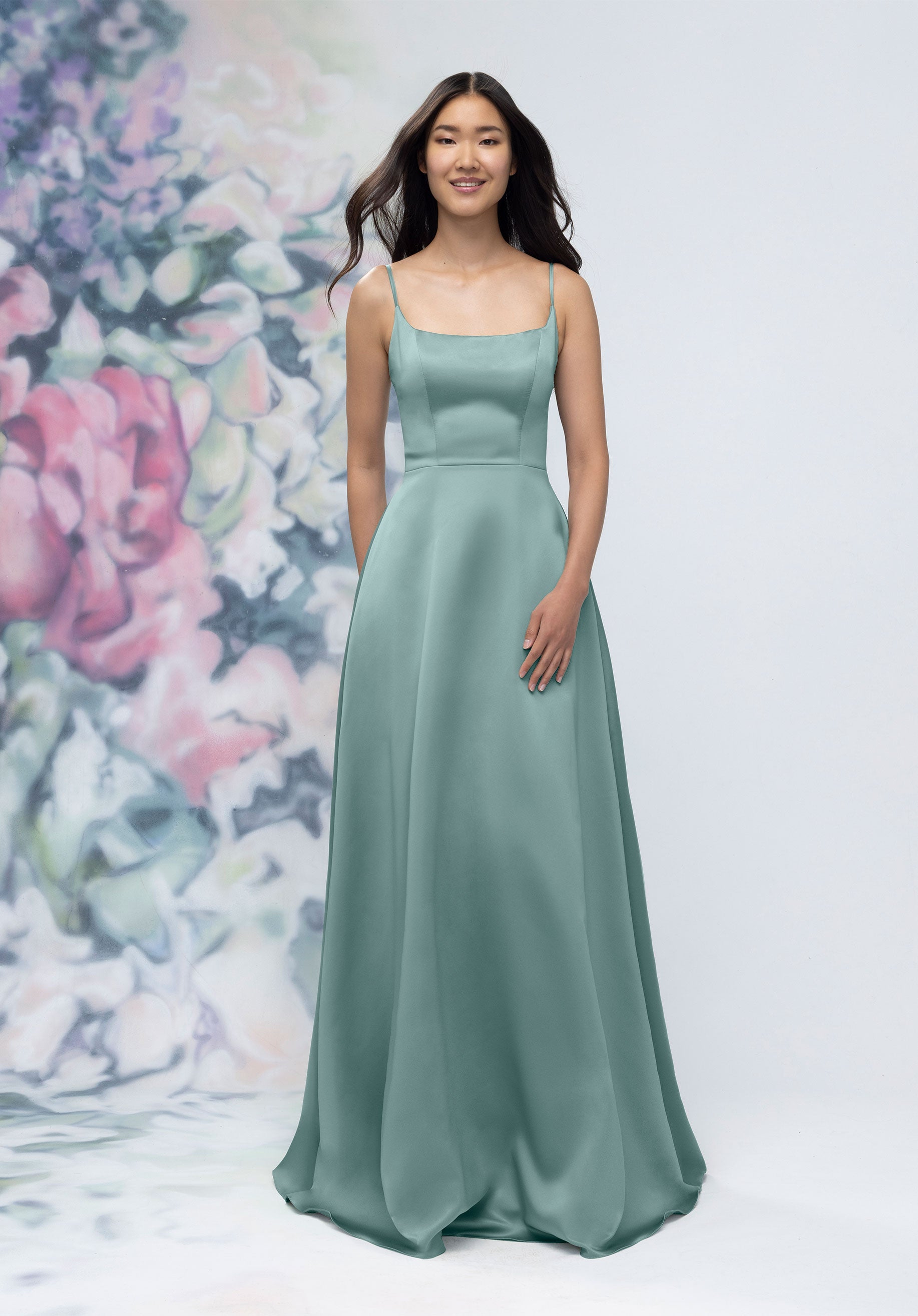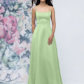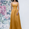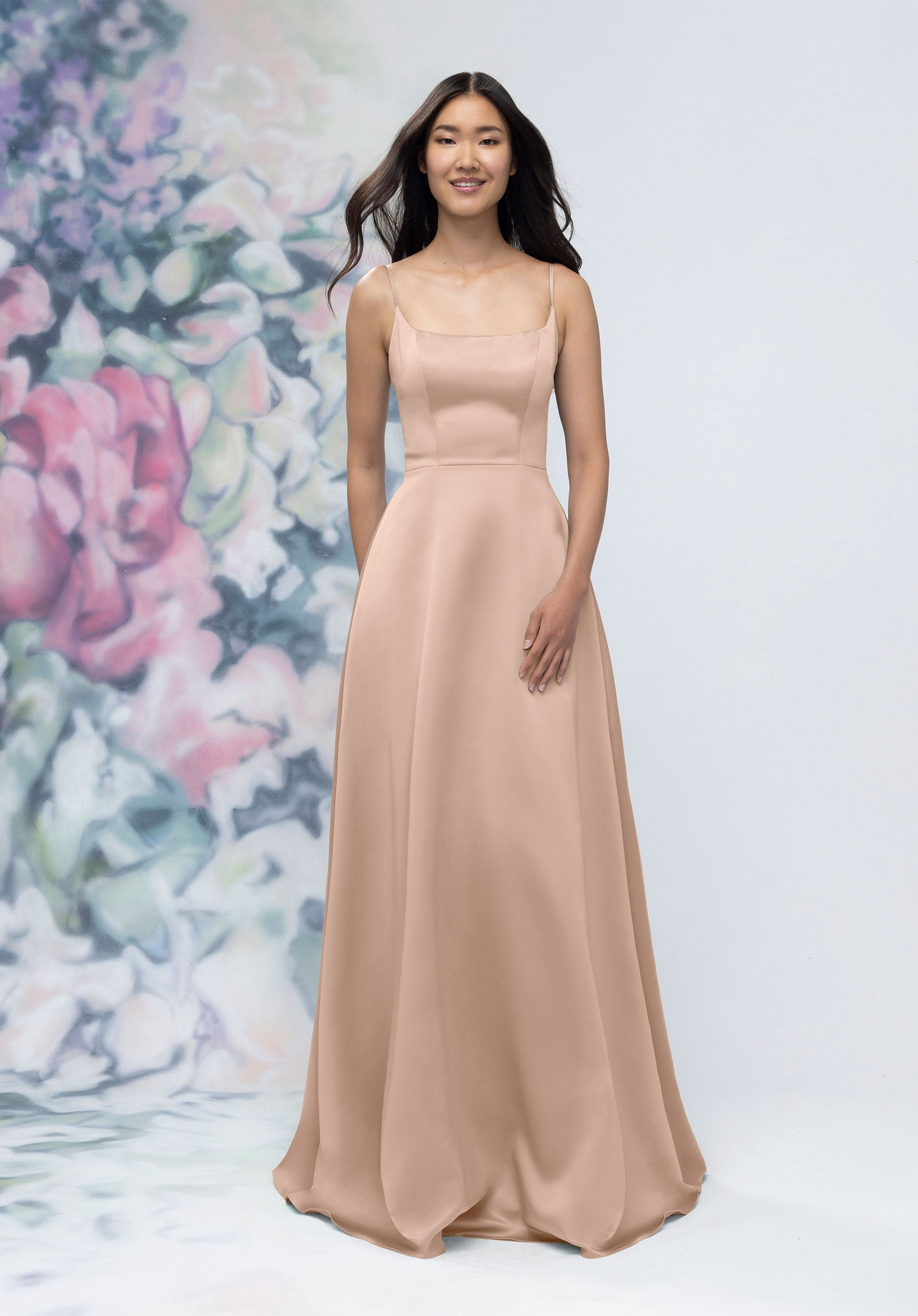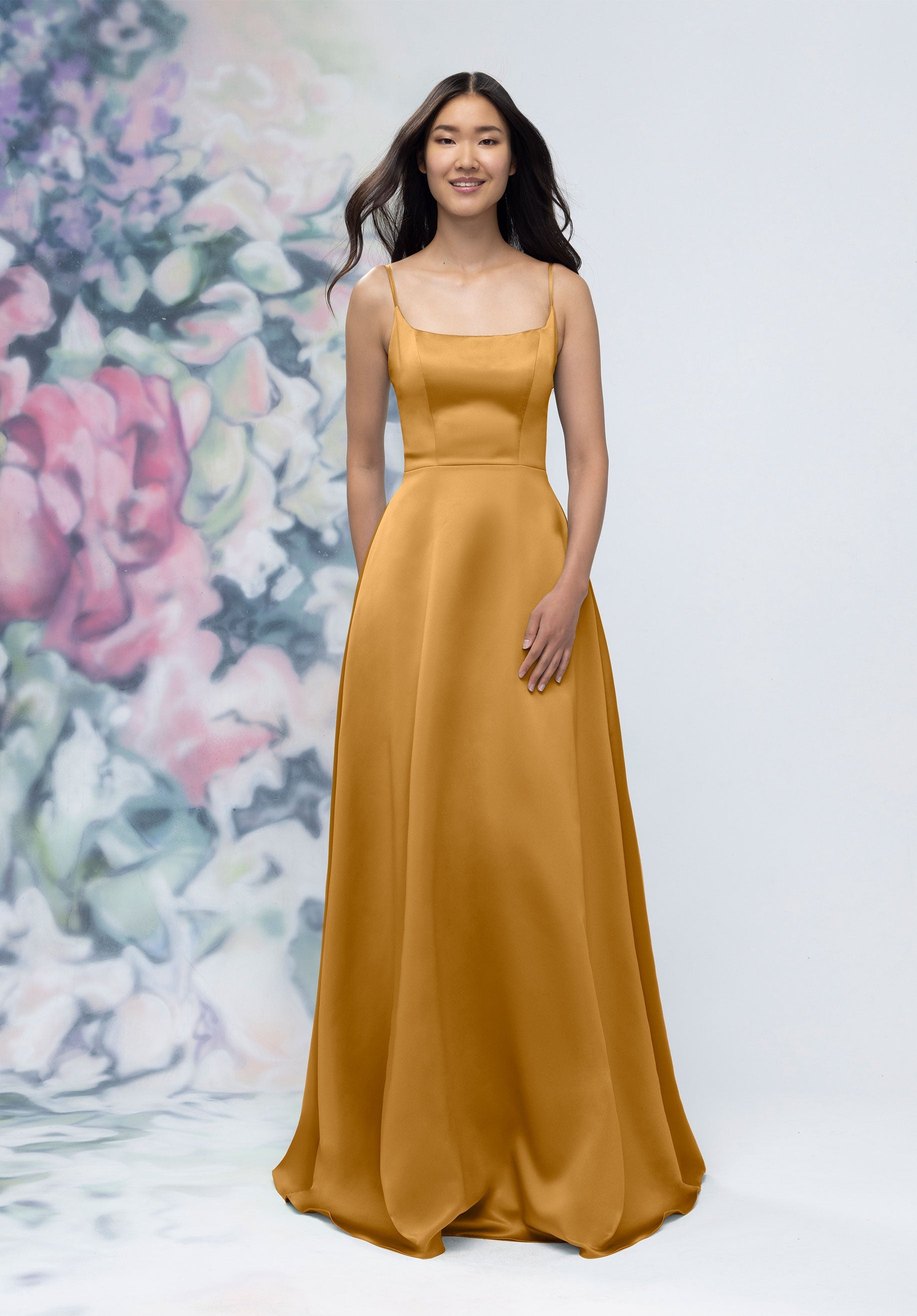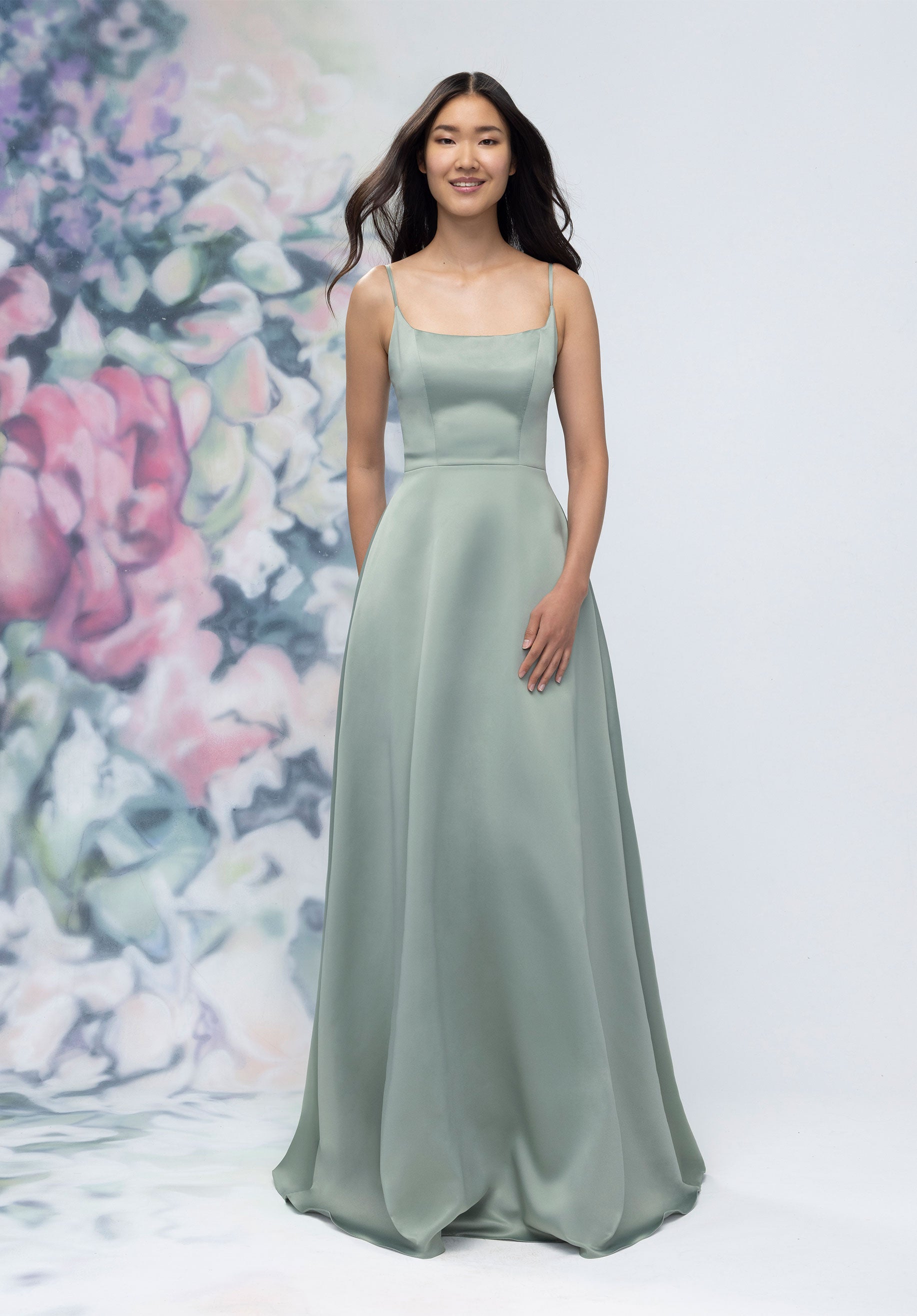 This satin A-line bridesmaid dress features a soft scoop neckline and delicate thin straps for a clean, effortless look. Contoured bodice seams sculpt the silhouette, while a lace-up corset back adds a romantic, customizable finish. Perfect for bridesmaids who love classic style with contemporary detailing.