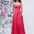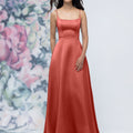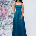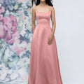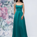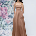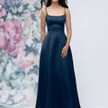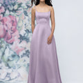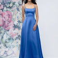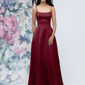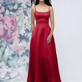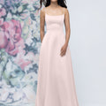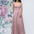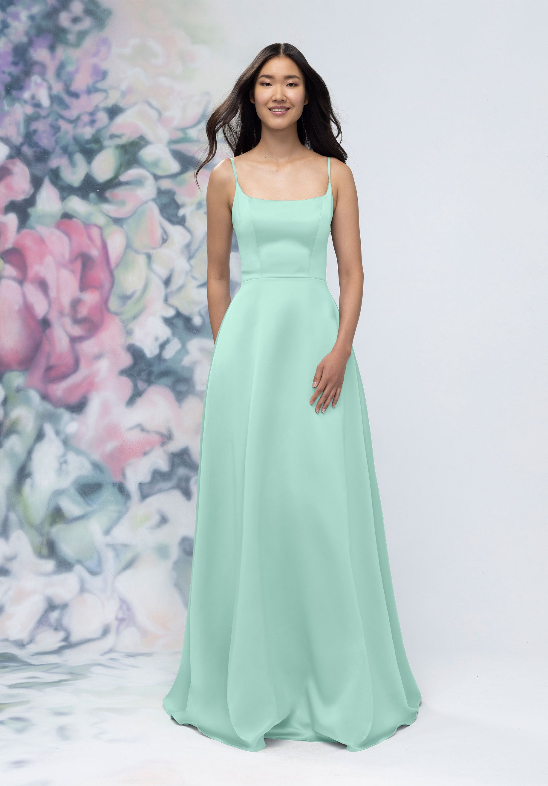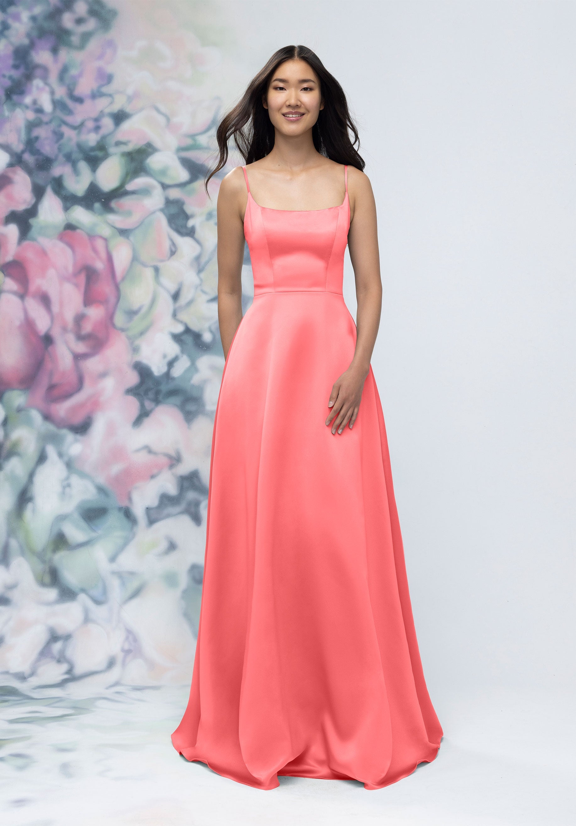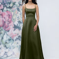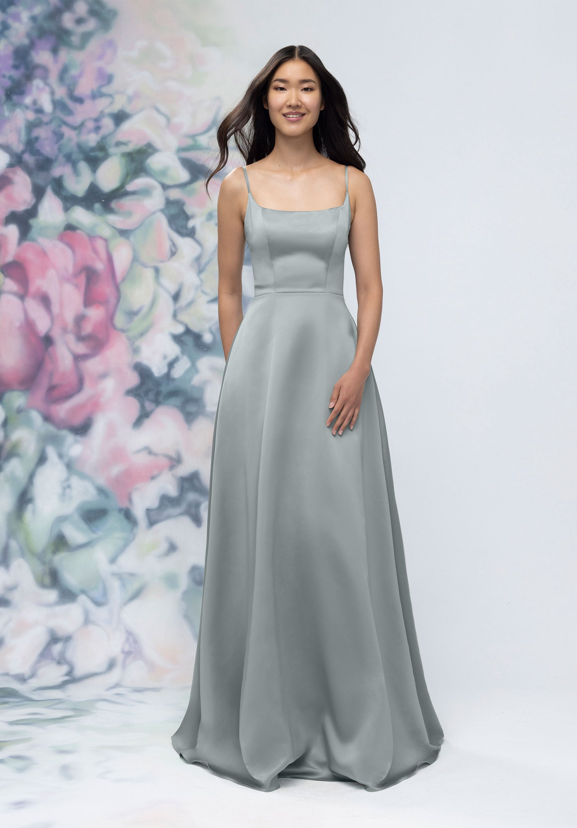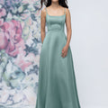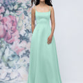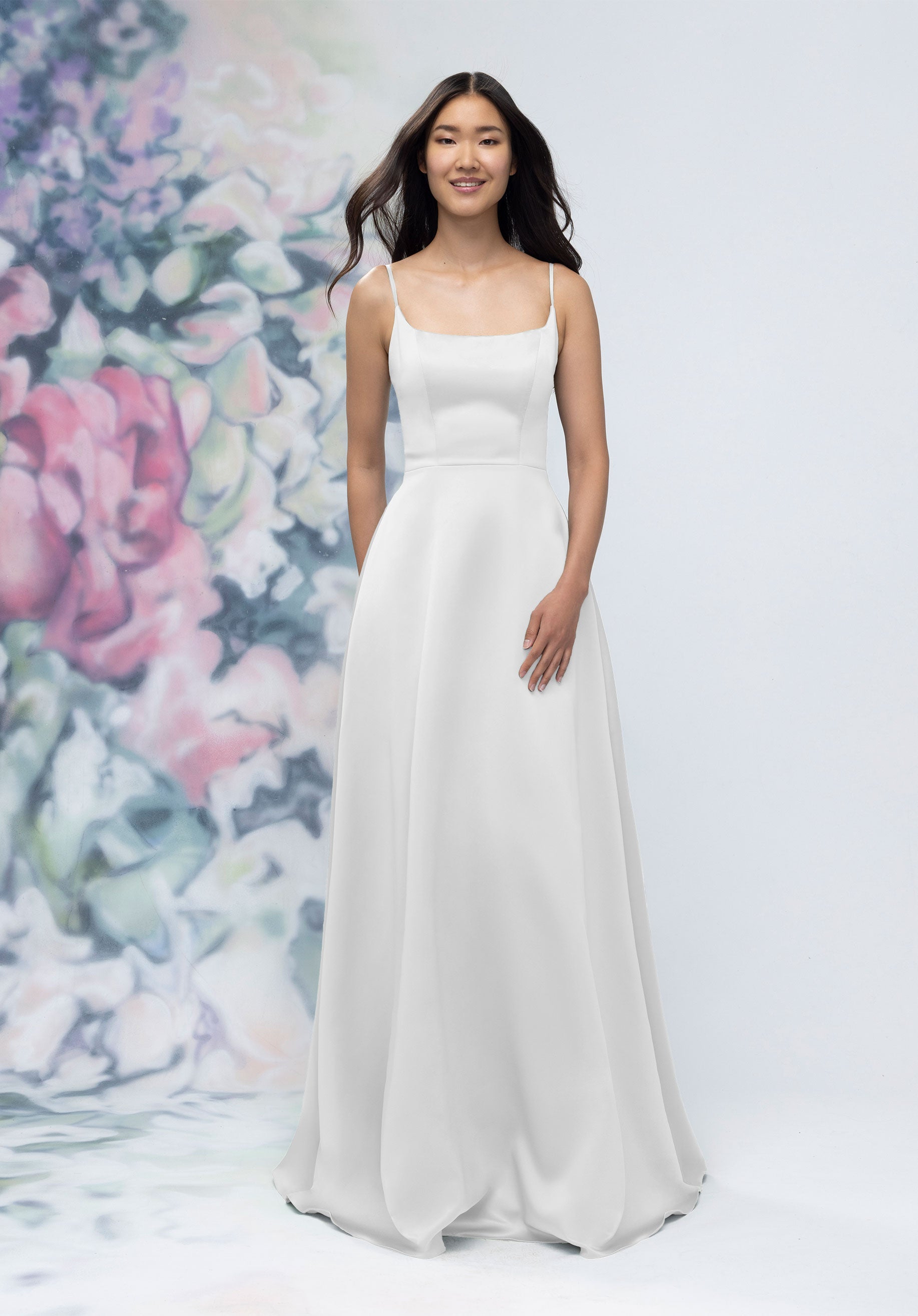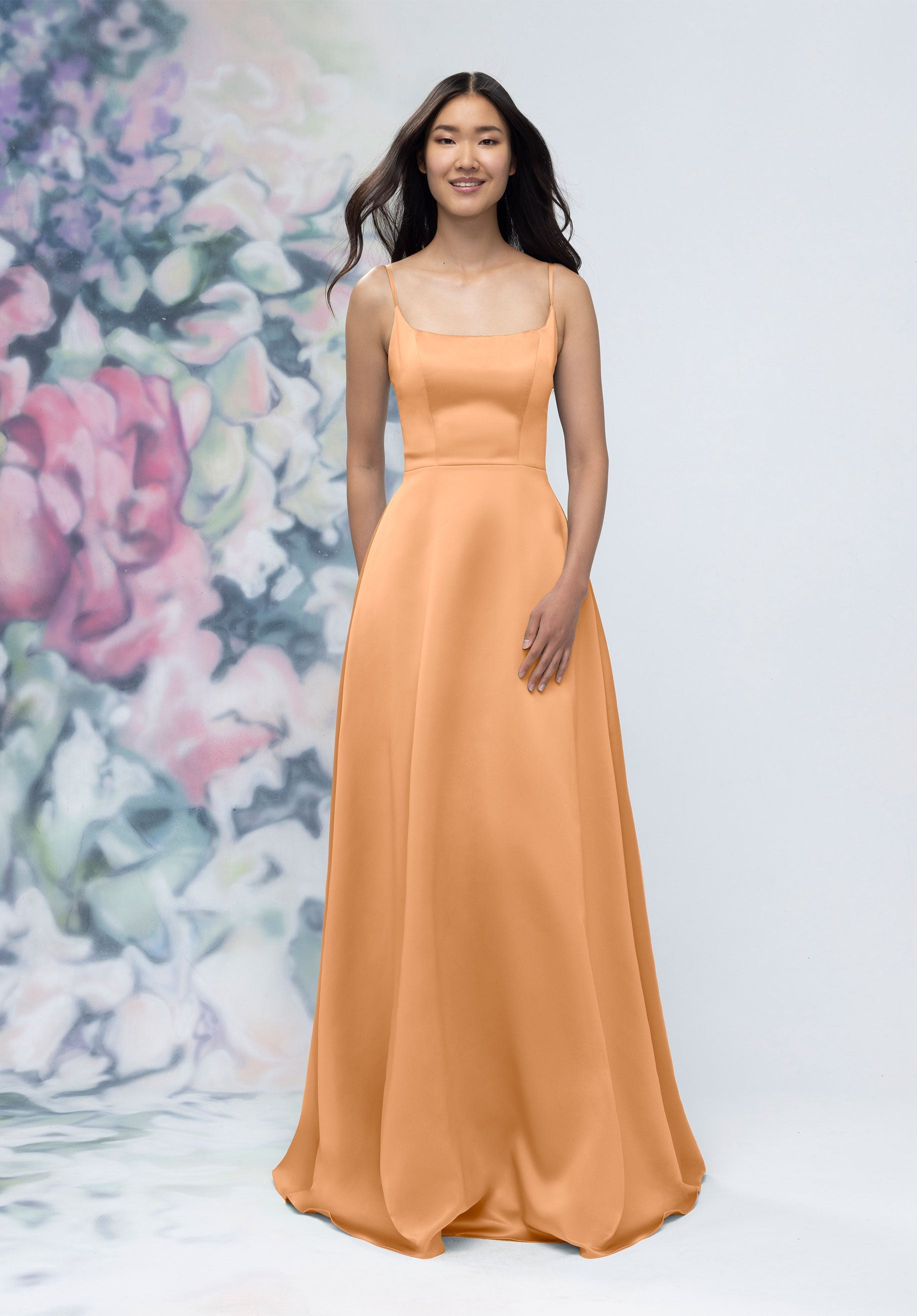 This satin A-line bridesmaid dress features a soft scoop neckline and delicate thin straps for a clean, effortless look. Contoured bodice seams sculpt the silhouette, while a lace-up corset back adds a romantic, customizable finish. Perfect for bridesmaids who love classic style with contemporary detailing.