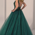 Step into sparkling style with this glitter tulle ball gown party dress. The v-neck bodice has an intricate beaded design with sheer sides and a matching v-shape back, adding modern allure to a classic silhouette. Flowing into a full glitter tulle A-line skirt, this dress shimmers with every movement, blending structured elegance with ethereal sparkle for nights that demand to be remembered.