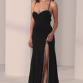 Minimal design with maximum impact. This matte jersey party dress features a sweetheart neckline with sparkling beaded trim accenting the heart shape and leading to the sexy low back with crisscrossing straps. The sheath silhouette creates a streamlined silhouette with a thigh-high skirt slit serving clean lines and subtle sparkle.
