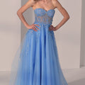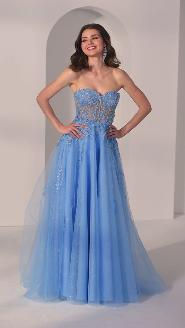 Delicate yet striking, this glitter tulle A-line dress is made to shine. The strapless sweetheart neckline and sheer corset bodice sculpt with ease, while cascading crystal beaded floral appliqués bring shimmer and movement meant for making a memorable entrance.