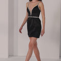 Turn heads in this daring satin mini dress. The plunging cat eye neckline makes a bold statement, while chunky crystal beading lining the neckline and defining the waist adds statement sparkle. A detachable tulle overskirt transforms the look from sleek and edgy to full-on drama, giving you versatile style.