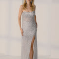 Step into a world of glittering glamour in this crystal-studded sheath party dress. The strapless scoop neckline frames the décolletage, while crystal boning sculpts the sheer bodice for a modern, flattering silhouette. An asymmetric waist adds dynamic detail, and a thigh-high slit elevates the drama. Finished in allover crystal-beaded tulle, every inch of this gown catches the light, enhancing the star you are.