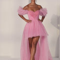 Playful yet flirty, this hi-low party dress is a true heartstopper. The ruched sweetheart bodice flatters the figure, while ruffle off-the-shoulder sleeves add a romantic touch. Designed in glitter tulle with a whimsical flocked heart print, the mini hi-low skirt shows just the right amount of leg for a fun, flirtatious finish. Perfect for the girl who loves sparkle with a twist.